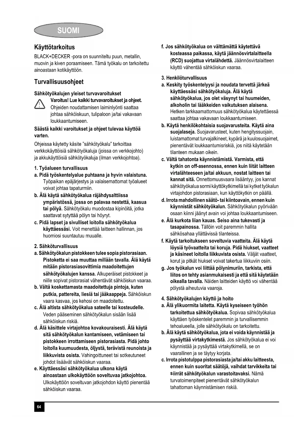 ♦63 DANSK Gå venligst ind på vores website www.blackanddecker.dk for at registrere dit nye produkt og for at blive holdt ajour om nye produkter og specialtilbud. Der findes yderligere oplysninger om mærket BLACK+DECKER og vores produktsortiment på adressen www.blackanddecker.dk.64 SUOMI SUOMI Käyttötarkoitus BLACK+DECKER -pora on suunniteltu puun, metallin, muovin ja kiven poraamiseen. Tämä työkalu on tarkoitettu ainoastaan kotikäyttöön. Turvallisuusohjeet Sähkötyökalujen yleiset turvavaroitukset Varoitus! Lue kaikki turvavaroitukset ja ohjeet. Ohjeiden noudattamisen laiminlyönti saattaa johtaa sähköiskuun, tulipaloon ja/tai vakavaan loukkaantumiseen. Säästä kaikki varoitukset ja ohjeet tulevaa käyttöä varten. Ohjeissa käytetty käsite ”sähkötyökalu” tarkoittaa verkkokäyttöisiä sähkötyökaluja (joissa on verkkojohto) ja akkukäyttöisiä sähkötyökaluja (ilman verkkojohtoa).