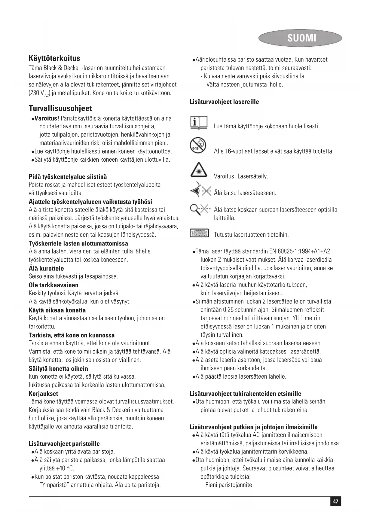 ) ja metalliputket. Kone on tarkoitettu kotikäyttöön. Turvallisuusohjeet ◆ Varoitus! Paristokäyttöisiä koneita käytettäessä on aina noudatettava mm. seuraavia turvallisuusohjeita, jotta tulipalojen, paristovuotojen, henkilövahinkojen ja materiaalivaurioiden riski olisi mahdollisimman pieni. ◆ Lue käyttöohje huolellisesti ennen koneen käyttöönottoa. ◆ Säilytä käyttöohje kaikkien koneen käyttäjien ulottuvilla. Pidä työskentelyalue siistinä Poista roskat ja mahdolliset esteet työskentelyalueelta välttyäksesi vaurioilta. Ajattele työskentelyalueen vaikutusta työhösi Älä altista konetta sateelle äläkä käytä sitä kosteissa tai märissä paikoissa. Järjestä työskentelyalueelle hyvä valaistus. Älä käytä konetta paikassa, jossa on tulipalo- tai räjähdysvaara, esim. palavien nesteiden tai kaasujen läheisyydessä. Työskentele lasten ulottumattomissa Älä anna lasten, vieraiden tai eläinten tulla lähelle työskentelyaluetta tai koskea koneeseen. Älä kurottele Seiso aina tukevasti ja tasapainossa. Ole tarkkaavainen Keskity työhösi. Käytä tervettä järkeä. Älä käytä sähkötyökalua, kun olet väsynyt. Käytä oikeaa konetta Käytä konetta ainoastaan sellaiseen työhön, johon se on tarkoitettu. Tarkista, että kone on kunnossa Tarkista ennen käyttöä, ettei kone ole vaurioitunut. Varmista, että kone toimii oikein ja täyttää tehtävänsä. Älä käytä konetta, jos jokin sen osista on viallinen. Säilytä konetta oikein Kun konetta ei käytetä, säilytä sitä kuivassa, lukitussa paikassa tai korkealla lasten ulottumattomissa. Korjaukset Tämä kone täyttää voimassa olevat turvallisuusvaatimukset. Korjauksia saa tehdä vain Black & Deckerin valtuuttama huoltoliike, joka käyttää alkuperäisosia, muutoin koneen käyttäjälle voi aiheuta vaarallisia tilanteita. Lisäturvaohjeet paristoille ◆ Älä koskaan yritä avata paristoja. ◆ Älä säilytä paristoja paikassa, jonka lämpötila saattaa ylittää +40 °C. ◆ Kun poistat pariston käytöstä, noudata kappaleessa ”Ympäristö” annettuja ohjeita. Älä polta paristoja. ◆ Ääriolosuhteissa paristo saattaa vuotaa. Kun havaitset paristosta tulevan nestettä, toimi seuraavasti: - Kuivaa neste varovasti pois siivousliinalla. Vältä nesteen joutumista iholle. Lisäturvaohjeet lasereille Lue tämä käyttöohje kokonaan huolellisesti. Alle 16-vuotiaat lapset eivät saa käyttää tuotetta. Varoitus! Lasersäteily. Älä katso lasersäteeseen. Älä katso koskaan suoraan lasersäteeseen optisilla laitteilla. Tutustu lasertuotteen tietoihin. ◆ Tämä laser täyttää standardin EN 60825-1:1994+A1+A2 luokan 2 mukaiset vaatimukset. Älä korvaa laserdiodia toisentyyppisellä diodilla. Jos laser vaurioituu, anna se valtuutetun korjaajan korjattavaksi. ◆ Älä käytä laseria muuhun käyttötarkoitukseen, kuin laserviivojen heijastamiseen. ◆ Silmän altistuminen luokan 2 lasersäteelle on turvallista enintään 0,25 sekunnin ajan. Silmäluomen refleksit tarjoavat normaalisti riittävän suojan. Yli 1 metrin etäisyydessä laser on luokan 1 mukainen ja on siten täysin turvallinen. ◆ Älä koskaan katso tahallasi suoraan lasersäteeseen. ◆ Älä käytä optisia välineitä katsoaksesi lasersädettä. ◆ Älä aseta laseria asentoon, jossa lasersäde voi osua ihmiseen pään korkeudelta. ◆ Älä päästä lapsia lasersäteen lähelle. Lisäturvaohjeet tukirakenteiden etsimille ◆ Ota huomioon, että työkalu voi ilmaista lähellä seinän pintaa olevat putket ja johdot tukirakenteina. Lisäturvaohjeet putkien ja johtojen ilmaisimille ◆ Älä käytä tätä työkalua AC-jännitteen ilmaisemiseen eristämättömissä, paljastuneissa tai irrallisissa johdoissa. ◆ Älä käytä työkalua jännitemittarin korvikkeena. ◆ Ota huomioon, ettei työkalu ilmaise aina kunnolla kaikkia putkia ja johtoja. Seuraavat olosuhteet voivat aiheuttaa epätarkkoja tuloksia: – Pieni paristojännite48 SUOMI – Paksut seinät ja ohuet putket tai johdot – Erittäin paksut seinät – Johdot ja putket ovat hyvin syvällä – Seinät on peitetty metallilla – Hyvin kosteat olosuhteet – Suojatut johdot ◆ Testaa työkalu aina ennen käyttöä etsimällä sellainen putki tai johto, jonka sijainti tiedetään. ◆ Jos olet epävarma, ota yhteys valtuutettuun urakoitsijaan. Varoitus! Tämä työkalu ei havaitse virtalähteestä eristettyjä virtapiirejä, tasavirtakaapeleita (DC) tai johtoja, joita käytetään tietoliikenne- tai tietokonejärjestelmissä. Laite ei välttämättä havaitse piilossa olevia johtoja (esim. seinävalojen), jos katkaisijat ovat pois päältä. Varoitus! Tämä työkalu ei havaitse muita kuin metallijohtoja. Yleiskuvaus
