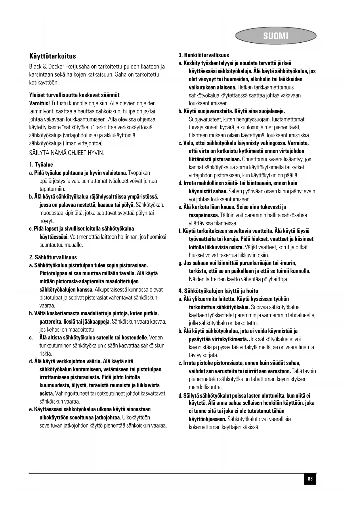 Kevin Hewitt Director of Consumer Engineering Spennymoor, County Durham DL16 6JG, Iso-Britannia 31-10-2006 Takuu Black & Decker Oy takaa, ettei koneessa ollut materiaali- ja/ tai valmistusvikaa silloin, kun se toimitettiin ostajalle. Takuu on lisäys kuluttajan laillisiin oikeuksiin eikä vaikuta niihin. Takuu on voimassa Euroopan unionin jäsenmaissa ja Euroopan vapaakauppa-alueella (EFTA). Mikäli Black & Decker -kone hajoaa materiaali- ja/tai valmistusvirheen tai teknisten tietojen epätarkkuuden vuoksi 24 kk:n kuluessa ostopäivästä, Black & Decker korjaa koneen ilman kustannuksia ostajalle tai vaihtaa sen Black & Decker Oy:n valinnan mukaan. Takuu ei kata vikoja, jotka johtuvat koneen X normaalista kulumisesta X ylikuormituksesta, virheellisestä käytöstä tai hoidosta X vahingoittamisesta vieraalla esineellä tai aineella tai onnettomuustapauksessa. X Takuu ei ole voimassa, mikäli konetta on korjannut joku muu kuin Black & Deckerin valtuuttama huoltoliike. Edellytyksenä takuun saamiselle on, että ostaja näyttää laitteen ostokuitin jälleenmyyjälle tai valtuutetulle huoltoliikkeelle. Saat valtuutettujen huoltoliikkeiden yhteystiedot ottamalla yhteyden Black & Decker Oy:hyn tässä käyttöoppaassa ilmoitetussa osoitteessa. Löydät myös valtuutettujen Black & Decker huoltoliikkeiden yhteystiedot sekä lisätietoja palveluistamme ja takuuehdoista Internetissä osoitteessa: www.2helpU.com Rekisteröi uusi Black & Decker -tuotteesi ja katso uusien tuotteiden ja erikoistarjousten tiedot verkkosivuiltamme osoitteesta www.blackanddecker.fi. Katso Black & Decker -tavaramerkin ja tuotevalikoimamme lisätiedot osoitteesta www.blackanddecker.fi. GK1730 GK1735 GK1740 GK1930 GK1935 GK1940 Jännite (V)230 230 230 230 230 230 Ottoteho (W)