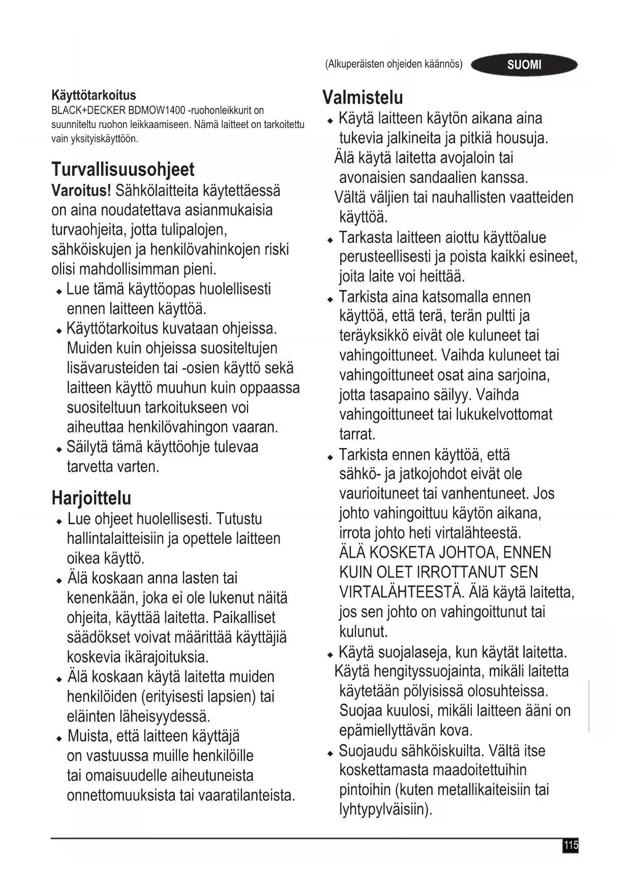 VIRTALÄHTEESTÄ. Älä käytä laitetta, jos sen johto on vahingoittunut tai kulunut. u Käytä suojalaseja, kun käytät laitetta. Käytä hengityssuojainta, mikäli laitetta käytetään pölyisissä olosuhteissa. Suojaa kuulosi, mikäli laitteen ääni on epämiellyttävän kova. u Suojaudu sähköiskuilta. Vältä itse koskettamasta maadoitettuihin pintoihin (kuten metallikaiteisiin tai lyhtypylväisiin). Käyttötarkoitus BLACK+DECKER BDMOW1400 -ruohonleikkurit on suunniteltu ruohon leikkaamiseen. Nämä laitteet on tarkoitettu vain yksityiskäyttöön. Turvallisuusohjeet Varoitus! Sähkölaitteita käytettäessä on aina noudatettava asianmukaisia turvaohjeita, jotta tulipalojen, sähköiskujen ja henkilövahinkojen riski olisi mahdollisimman pieni. u Lue tämä käyttöopas huolellisesti ennen laitteen käyttöä. u Käyttötarkoitus kuvataan ohjeissa. Muiden kuin ohjeissa suositeltujen lisävarusteiden tai -osien käyttö sekä laitteen käyttö muuhun kuin oppaassa suositeltuun tarkoitukseen voi aiheuttaa henkilövahingon vaaran. u Säilytä tämä käyttöohje tulevaa tarvetta varten. Harjoittelu u Lue ohjeet huolellisesti. Tutustu hallintalaitteisiin ja opettele laitteen oikea käyttö. u Älä koskaan anna lasten tai kenenkään, joka ei ole lukenut näitä ohjeita, käyttää laitetta. Paikalliset säädökset voivat määrittää käyttäjiä koskevia ikärajoituksia. u Älä koskaan käytä laitetta muiden henkilöiden (erityisesti lapsien) tai eläinten läheisyydessä. u Muista, että laitteen käyttäjä on vastuussa muille henkilöille tai omaisuudelle aiheutuneista onnettomuuksista tai vaaratilanteista.116 (Alkuperäisten ohjeiden käännös) SUOMI Käyttö u Älä koskaan käytä laitetta ilman asianmukaisia suojia tai turvalaitteita. u Käytä laitetta vain päivänvalossa tai hyvin valaistulla alueella. u Älä jätä laitetta sateeseen. Älä käytä laitetta sateessa tai kosteissa tai märissä olosuhteissa. Laitteen käyttämistä märällä nurmikolla ei suositella. u Varmista tukeva jalansija etenkin rinteissä. Muista, että juuri leikattu ruoho on kosteaa ja liukasta. Älä työskentele jyrkissä rinteissä. u Työskentele rinteen korkeussuuntaan nähden poikittain, älä koskaan ylhäältä alas tai päinvastoin. Toimi erityisen huolellisesti, kun laitteen suuntaa muutetaan rinteessä. u Älä työskentele liian jyrkissä rinteissä.u Käytä laitetta aina kävellen. Älä juokse. Älä vedä laitetta itseäsi kohti tai kävele takaperin laitetta käyttäessäsi. u Käynnistä laite ohjeiden mukaan. Varmista, että jalkasi ovat riittävän kaukana terästä. u Älä käynnistä laitetta, kun seisot poistoaukon edessä. u Älä kallista laitetta käynnistyksen yhteydessä, mikäli se ei ole tarpeen. Jos laitetta on kallistettava käynnistettäessä, kallista sitä mahdollisimman vähän. Nosta vain laitteen kauimpana käyttäjästä olevaa puolta. Varmista, että molemmat kätesi ovat käyttöasennossa ennen laitteen laskemista alas. u Sammuta laite ja odota, kunnes teräosan pyöriminen lakkaa, mikäli laitetta on kallistettava, kun sitä siirretään muilla alustoilla kuin ajettavalla nurmikolla. u Älä nosta tai kanna laitetta, ennen kuin terä on pysähtynyt kokonaan. u Pidä kädet ja jalat loitolla terästä. u Älä aseta käsiä tai jalkoja lähelle pyöriviä osia tai niiden alle. u Pysy loitolla laitteen poistoaukoista.u Sammuta laite, vedä pistoke irti pistorasiasta ja varmista, että laitteen liikkuvat osat ovat pysähtyneet, ennen kuin jätät laitteen ilman valvontaa, ja ennen sen osien vaihtamista, puhdistamista tai tarkistamista tai tukoksen poistamista. Kun ruohonleikkuri on osunut johonkin, tarkista laite vahinkojen varalta ja korjaa se, ennen kuin käynnistät sen ja käytät sitä uudelleen. u Jos laite tärisee epätavallisen voimakkaasti tai jos osut sillä esteeseen, sammuta laite ja vedä pistoke irti pistorasiasta. Tarkista laite vahinkojen varalta, vaihda tai korjaa vahingoittuneet osat ja kiristä mahdollisesti löystyneet osat. u Pidä verkkovirtajohto aina mahdollisimman kaukana terästä. Ota huomioon virtajohdon asento aina laitetta käytettäessä. u Moottori pyörii vielä muutaman sekunnin virran katkaisemisen jälkeen. Älä jarruta terän pysähtymisliikettä.117 (Alkuperäisten ohjeiden käännös) SUOMI Huolto ja varastointi u Tarkista ennen laitteen käyttöä, ettei laitteessa ole vahingoittuneita tai viallisia osia. Tarkista, että liikkuvat osat toimivat moitteettomasti eivätkä ole väärässä asennossa ja että työkalussa ei ole murtuneita tai vahingoittuneita suojia tai kytkimiä tai muita osia, jotka saattaisivat vaikuttaa haitallisesti laitteen toimintaan. Varmista, että laite toimii oikein. Laitetta ei tule käyttää, jos sen suoja tai kotelo on vaurioitunut tai poistettu. Älä käytä laitetta, jos jokin sen osa on vahingoittunut tai viallinen. Älä käytä laitetta, jota ei voida käynnistää ja pysäyttää virtakytkimestä. Korjauta tai vaihdata vaurioituneet tai vialliset osat valtuutetussa huoltoliikkeessä. u Tarkista virtajohdon kunto säännöllisesti. Jos virtajohto vahingoittuu, sen vaihtaminen tulee turvallisuussyistä jättää valtuutetun huoltoliikkeen tehtäväksi. Tarkista jatkojohtojen kunto säännöllisesti. Vaihda vaurioitunut sähköjohto heti. u Turvallisuussyistä tulee varmistaa, että kaikki laitteen mutterit, pultit ja ruuvit on kiristetty. u Tarkista keräyssäiliö kulumisen tai mahdollisten vaurioiden varalta ja vaihda se tarvittaessa. Älä koskaan käytä laitetta ilman keräyssäiliötä. u Varo laitetta säädettäessä, että sormesi eivät jää liikkuvien terien ja kiinteästi asennettujen osien väliin. u Muista teriä huollettaessa, että vaikka virtalähde on sammutettu, terät liikkuvat edelleen. u Kun laitetta ei käytetä, se on säilytettävä kuivassa paikassa. Pidä laite lasten ulottumattomissa. u Anna laitteen aina jäähtyä ennen varastointia. u Varmi