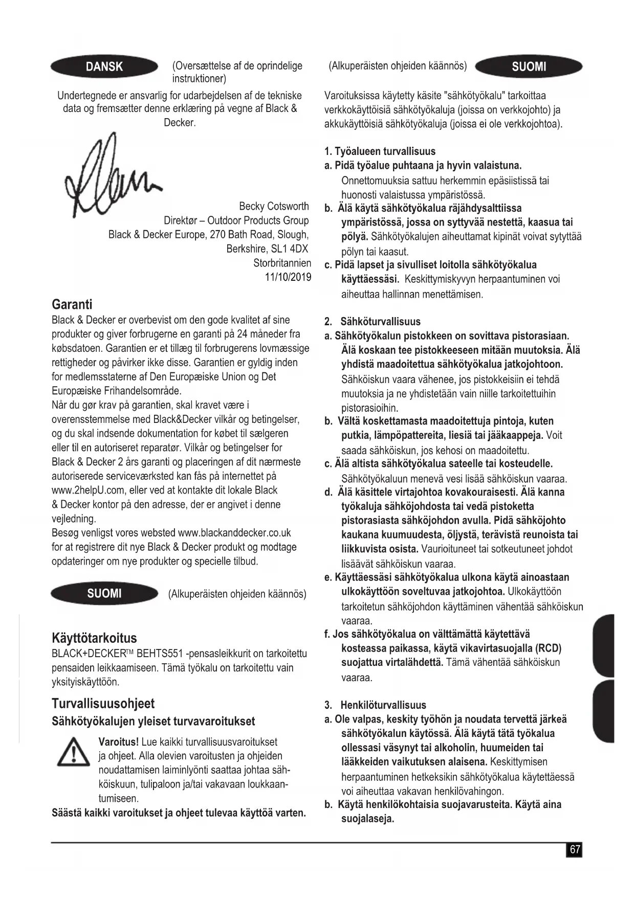 EY-vaatimustenmukaisuusvakuutus KONEDIREKTIIVI ULKOILMAMELUDIREKTIIVI BEHTS551 – Pensasleikkuri Black & Decker ilmoittaa, että tuotteet, jotka on kuvattu kohdassa Tekniset tiedot, täyttävät seuraavien direktiivien vaatimukset: 2006/42/EY, EN 62841-1:2015; EN 62841-4-2:2019 2000/14/ET, Pensasleikkuri, liite V, DEKRA Certication B.V. Meander 1051 / P.O. Box 5185 6825 MJ ARNHEM / 6802 ED ARNHEM, Netherlands Ilmoitetun laitoksen tunnusnumero: 0344 Mitattu äänenpainetaso (LpA) 87,5 dB(A); epävarmuus K: 1,1 dB(A) Taattu ääniteho (LwA) 100 dB(A) Nämä tuotteet täyttävät myös direktiivien 2014/30/EU ja 2011/65/EU vaatimukset. Lisätietoja saa ottamalla yhteyden Black & Deckeriin seuraavassa osoitteessa. Tiedot ovat myös käyttöohjeen takakannessa. Allekirjoittanut vastaa teknisten tietojen kokoamisesta tehden tämän ilmoituksen Black & Deckerin puolesta. Becky Cotsworth Päällikkö – Outdoor Products Group Black & Decker Europe, 270 Bath Road, Slough, Berkshire, SL1 4DX Iso-Britannia 11/10/2019 Takuu Black & Decker on vakuuttunut tuotteidensa korkeasta laadusta ja tarjoaa kuluttajille 24 kuukauden takuun, joka astuu voimaan ostopäivänä. Takuu on lisäys kuluttajan laillisiin oikeuksiin eikä vaikuta niihin. Tämä takuu on voimassa kaikissa EU- ja ETA-maissa. Edellytyksenä takuun saamiselle on, että vaade täyttää Black & Deckerin ehdot ja että ostaja toimittaa ostotositteen jälleenmyyjälle tai valtuutetulle huoltoliikkeelle. Black&Deckerin kahden vuoden takuun ehdot ja lähimmän valtuutetun korjauspalvelun yhteystiedot ovat saatavilla osoitteessa www.2helpU.com tai ottamalla yhteyttä paikalliseen Black & Deckerin toimipisteeseen tässä ohjekirjassa ilmoitettuihin osoitteisiin. Käy verkkosivuillamme osoitteessa www.blackanddecker. ja rekisteröi uusi Black & Decker -tuotteesi saadaksesi tietoa uusista tuotteista ja erikoistarjouksista.73 (Μετάφραση των πρωτότυπων οδηγιών) Προβλεπόμενη χρήση Τα θαμνοκοπτικά BLACK+DECKER