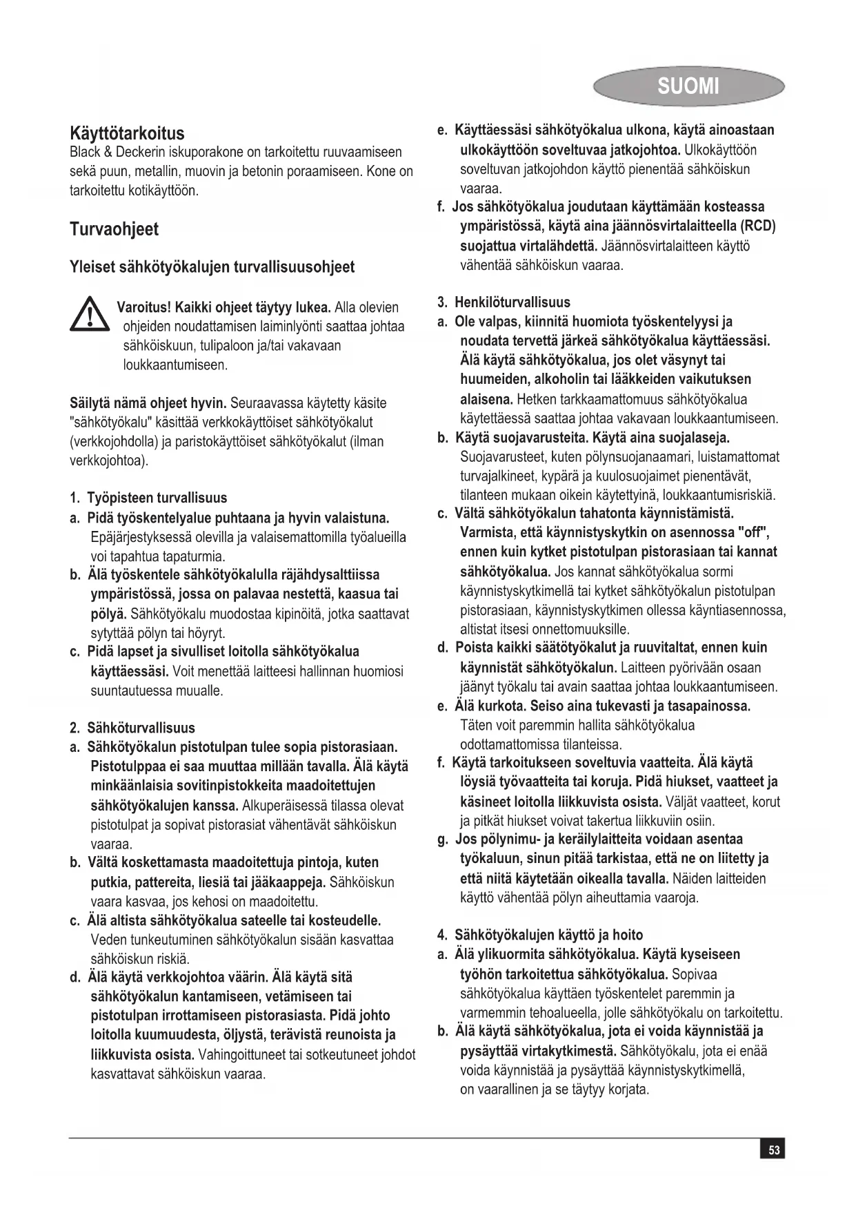 Varoitus! Kaikki ohjeet täytyy lukea. Alla olevien ohjeiden noudattamisen laiminlyönti saattaa johtaa sähköiskuun, tulipaloon ja/tai vakavaan loukkaantumiseen. Säilytä nämä ohjeet hyvin. Seuraavassa käytetty käsite "sähkötyökalu" käsittää verkkokäyttöiset sähkötyökalut (verkkojohdolla) ja paristokäyttöiset sähkötyökalut (ilman verkkojohtoa).