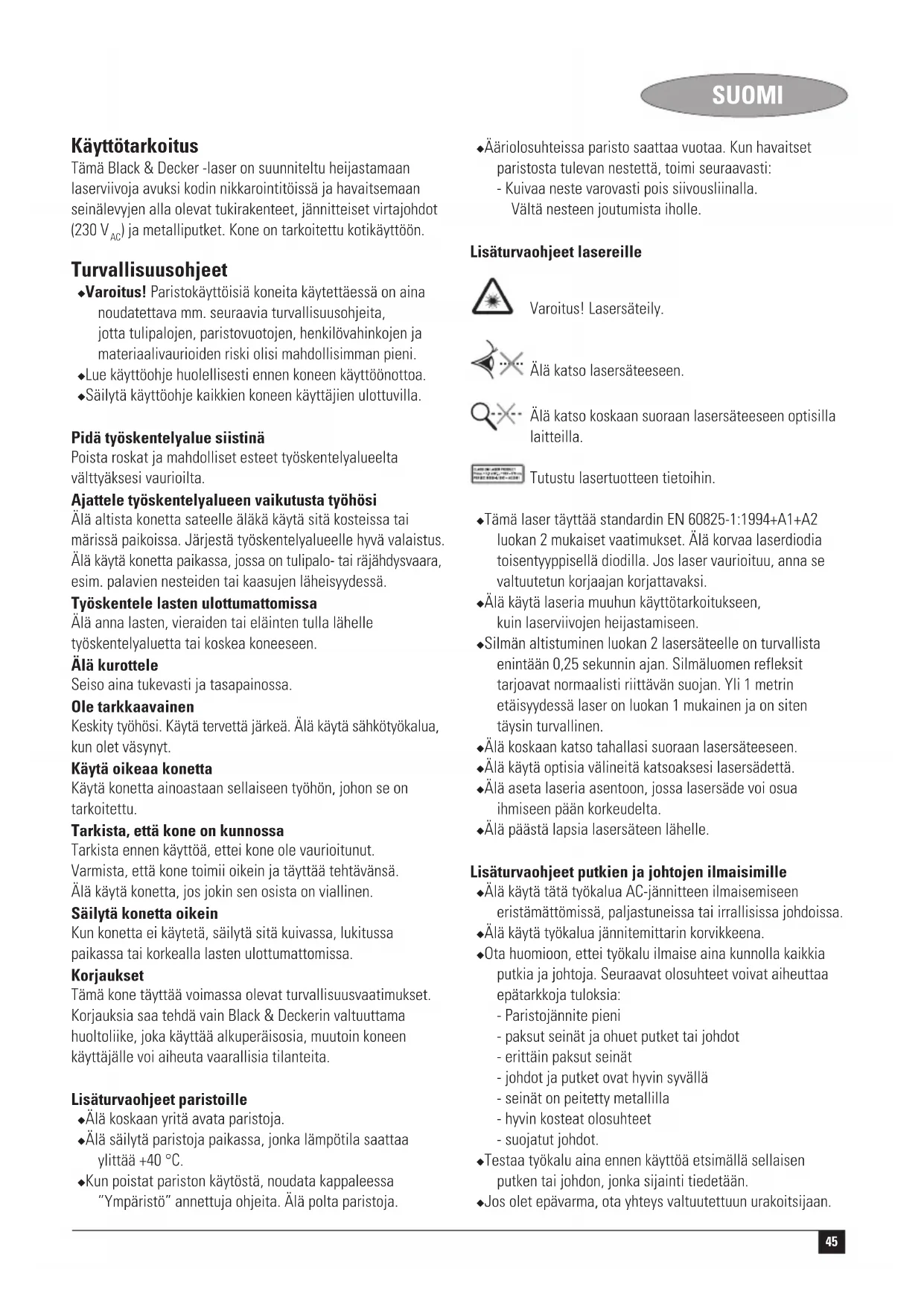 ) ja metalliputket. Kone on tarkoitettu kotikäyttöön. Turvallisuusohjeet ◆ Varoitus! Paristokäyttöisiä koneita käytettäessä on aina noudatettava mm. seuraavia turvallisuusohjeita, jotta tulipalojen, paristovuotojen, henkilövahinkojen ja materiaalivaurioiden riski olisi mahdollisimman pieni. ◆ Lue käyttöohje huolellisesti ennen koneen käyttöönottoa. ◆ Säilytä käyttöohje kaikkien koneen käyttäjien ulottuvilla. Pidä työskentelyalue siistinä Poista roskat ja mahdolliset esteet työskentelyalueelta välttyäksesi vaurioilta. Ajattele työskentelyalueen vaikutusta työhösi Älä altista konetta sateelle äläkä käytä sitä kosteissa tai märissä paikoissa. Järjestä työskentelyalueelle hyvä valaistus. Älä käytä konetta paikassa, jossa on tulipalo- tai räjähdysvaara, esim. palavien nesteiden tai kaasujen läheisyydessä. Työskentele lasten ulottumattomissa Älä anna lasten, vieraiden tai eläinten tulla lähelle työskentelyaluetta tai koskea koneeseen. Älä kurottele Seiso aina tukevasti ja tasapainossa. Ole tarkkaavainen Keskity työhösi. Käytä tervettä järkeä. Älä käytä sähkötyökalua, kun olet väsynyt. Käytä oikeaa konetta Käytä konetta ainoastaan sellaiseen työhön, johon se on tarkoitettu. Tarkista, että kone on kunnossa Tarkista ennen käyttöä, ettei kone ole vaurioitunut. Varmista, että kone toimii oikein ja täyttää tehtävänsä. Älä käytä konetta, jos jokin sen osista on viallinen. Säilytä konetta oikein Kun konetta ei käytetä, säilytä sitä kuivassa, lukitussa paikassa tai korkealla lasten ulottumattomissa. Korjaukset Tämä kone täyttää voimassa olevat turvallisuusvaatimukset. Korjauksia saa tehdä vain Black & Deckerin valtuuttama huoltoliike, joka käyttää alkuperäisosia, muutoin koneen käyttäjälle voi aiheuta vaarallisia tilanteita. Lisäturvaohjeet paristoille ◆ Älä koskaan yritä avata paristoja. ◆ Älä säilytä paristoja paikassa, jonka lämpötila saattaa ylittää +40 °C. ◆ Kun poistat pariston käytöstä, noudata kappaleessa ”Ympäristö” annettuja ohjeita. Älä polta paristoja. ◆ Ääriolosuhteissa paristo saattaa vuotaa. Kun havaitset paristosta tulevan nestettä, toimi seuraavasti: - Kuivaa neste varovasti pois siivousliinalla. Vältä nesteen joutumista iholle. Lisäturvaohjeet lasereille Varoitus! Lasersäteily. Älä katso lasersäteeseen. Älä katso koskaan suoraan lasersäteeseen optisilla laitteilla. Tutustu lasertuotteen tietoihin. ◆ Tämä laser täyttää standardin EN 60825-1:1994+A1+A2 luokan 2 mukaiset vaatimukset. Älä korvaa laserdiodia toisentyyppisellä diodilla. Jos laser vaurioituu, anna se valtuutetun korjaajan korjattavaksi. ◆ Älä käytä laseria muuhun käyttötarkoitukseen, kuin laserviivojen heijastamiseen. ◆ Silmän altistuminen luokan 2 lasersäteelle on turvallista enintään 0,25 sekunnin ajan. Silmäluomen refleksit tarjoavat normaalisti riittävän suojan. Yli 1 metrin etäisyydessä laser on luokan 1 mukainen ja on siten täysin turvallinen. ◆ Älä koskaan katso tahallasi suoraan lasersäteeseen. ◆ Älä käytä optisia välineitä katsoaksesi lasersädettä. ◆ Älä aseta laseria asentoon, jossa lasersäde voi osua ihmiseen pään korkeudelta. ◆ Älä päästä lapsia lasersäteen lähelle. Lisäturvaohjeet putkien ja johtojen ilmaisimille ◆ Älä käytä tätä työkalua AC-jännitteen ilmaisemiseen eristämättömissä, paljastuneissa tai irrallisissa johdoissa. ◆ Älä käytä työkalua jännitemittarin korvikkeena. ◆ Ota huomioon, ettei työkalu ilmaise aina kunnolla kaikkia putkia ja johtoja. Seuraavat olosuhteet voivat aiheuttaa epätarkkoja tuloksia: - Paristojännite pieni - paksut seinät ja ohuet putket tai johdot - erittäin paksut seinät - johdot ja putket ovat hyvin syvällä - seinät on peitetty metallilla - hyvin kosteat olosuhteet - suojatut johdot. ◆ Testaa työkalu aina ennen käyttöä etsimällä sellaisen putken tai johdon, jonka sijainti tiedetään. ◆ Jos olet epävarma, ota yhteys valtuutettuun urakoitsijaan.46 SUOMI Varoitus! Tämä työkalu ei havaitse virtalähteestä eristettyjä virtapiirejä, tasavirtakaapeleita (DC) tai johtoja, joita käytetään tietoliikenne- tai tietokonejärjestelmissä. Laite ei välttämättä havaitse piilossa olevia johtoja (esim. seinävalojen), jos katkaisijat ovat pois päältä. Varoitus! Tämä työkalu ei ilmaise muita kuin metallijohtoja. Yleiskuvaus