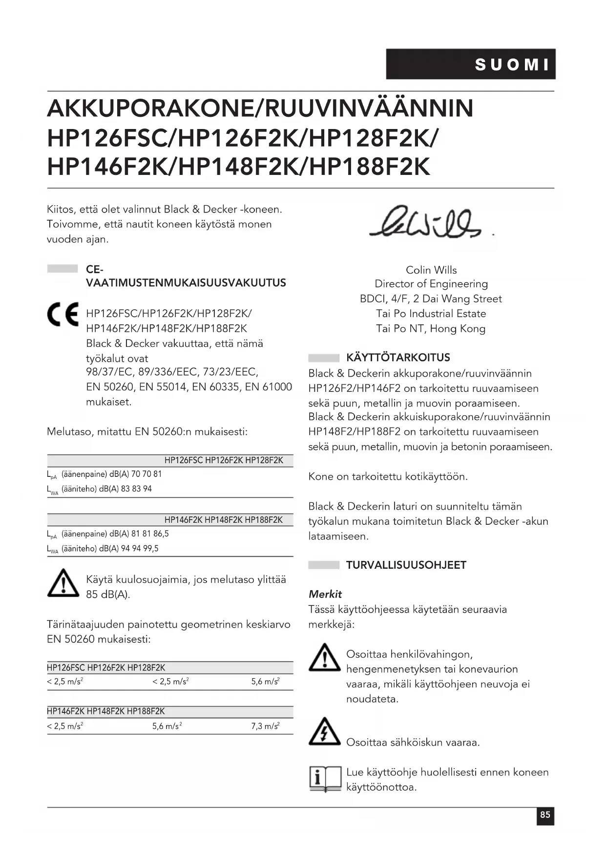HP126FSC/HP126F2K/HP128F2K/ HP146F2K/HP148F2K/HP188F2K Kiitos, että olet valinnut Black & Decker -koneen. Toivomme, että nautit koneen käytöstä monen vuoden ajan. CE- VAATIMUSTENMUKAISUUSVAKUUTUS HP126FSC/HP126F2K/HP128F2K/ HP146F2K/HP148F2K/HP188F2K Black & Decker vakuuttaa, että nämä työkalut ovat 98/37/EC, 89/336/EEC, 73/23/EEC, EN 50260, EN 55014, EN 60335, EN 61000 mukaiset. Melutaso, mitattu EN 50260:n mukaisesti: HP126FSC HP126F2K HP128F2K