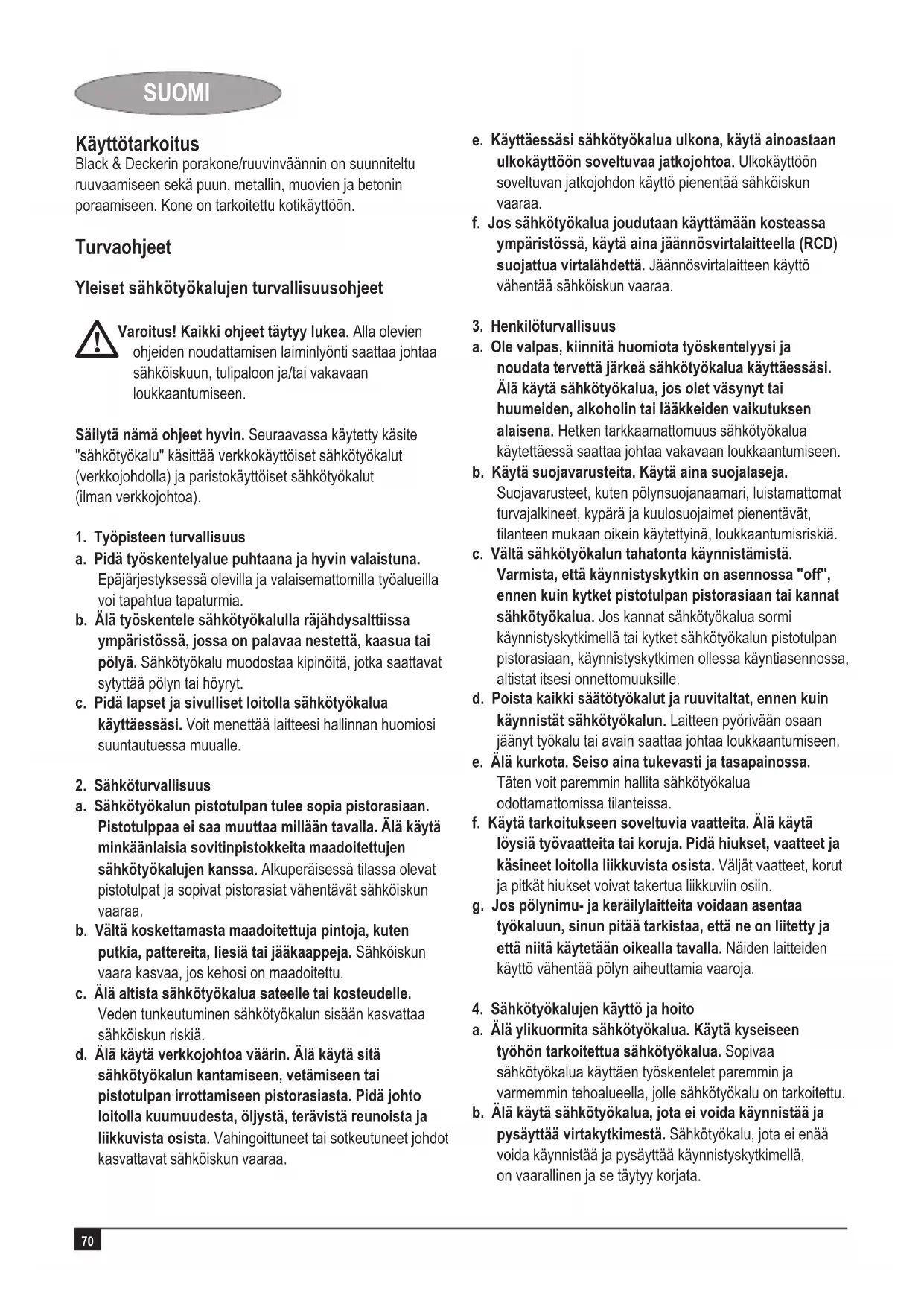 Varoitus! Loukkaantumisen vaaran ehkäisemiseksi käyttäjän on luettava käyttöohjeet. Lisäturvaohjeet akuille ja latureille Akut Älä koskaan yritä avata paristoa. Älä altista akkua vedelle. Älä säilytä paristoa paikassa, jonka lämpötila ylittää +40 °C. Lataa akku ainoastaan lämpötilan ollessa +10 °C - +40 °C. Lataa akku käyttäen ainoastaan laitteen mukana toimitettua laturia. Kun poistat akun käytöstä, noudata kappaleessa "Ympäristönsuojelu" annettuja ohjeita. Laturit Käytä Black & Decker -laturia ainoastaan laitteen mukana toimitetun akun lataamiseen. Muunlaiset akut saattavat räjähtää aiheuttaen henkilö- ja esinevahinkoja. Älä koskaan yritä ladata ei-ladattavia akuja. Vaihda vialliset johdot välittömästi. Älä altista laturia vedelle. Älä avaa laturia. Älä vahingoita laturia.