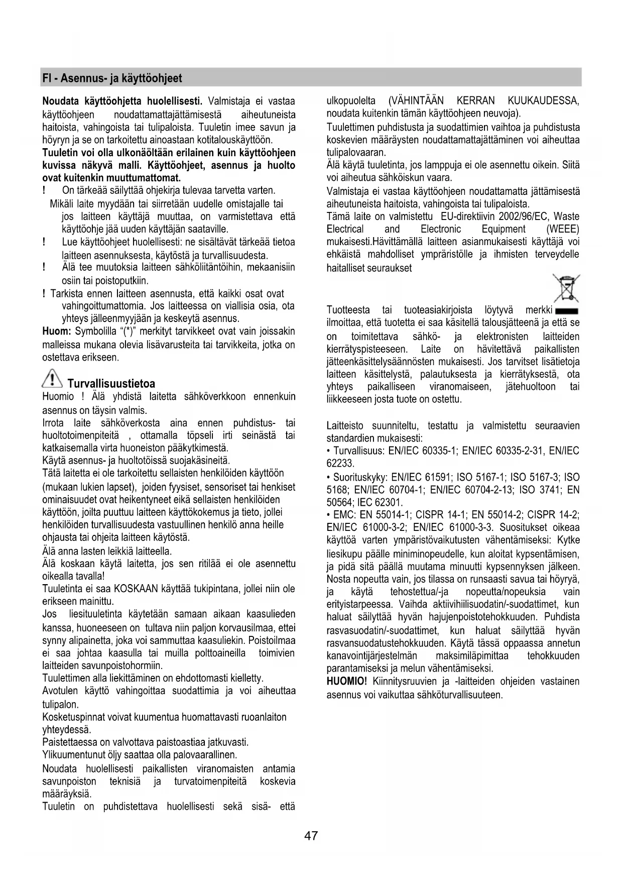 I det fall belysningen inte fungerar, kontrollera att lamporna är korrekt iskruvade i sitt säte innan ni kontaktar det tekniska servicekontoret.47 FI - Asennus- ja käyttöohjeet Noudata käyttöohjetta huolellisesti. Valmistaja ei vastaa käyttöohjeen noudattamattajättämisestä aiheutuneista haitoista, vahingoista tai tulipaloista. Tuuletin imee savun ja höyryn ja se on tarkoitettu ainoastaan kotitalouskäyttöön. Tuuletin voi olla ulkonäöltään erilainen kuin käyttöohjeen kuvissa näkyvä malli. Käyttöohjeet, asennus ja huolto ovat kuitenkin muuttumattomat. ! On tärkeää säilyttää ohjekirja tulevaa tarvetta varten. Mikäli laite myydään tai siirretään uudelle omistajalle tai jos laitteen käyttäjä muuttaa, on varmistettava että käyttöohje jää uuden käyttäjän saataville. ! Lue käyttöohjeet huolellisesti: ne sisältävät tärkeää tietoa laitteen asennuksesta, käytöstä ja turvallisuudesta. ! Älä tee muutoksia laitteen sähköliitäntöihin, mekaanisiin osiin tai poistoputkiin. ! Tarkista ennen laitteen asennusta, että kaikki osat ovat vahingoittumattomia. Jos laitteessa on viallisia osia, ota yhteys jälleenmyyjään ja keskeytä asennus. Huom: Symbolilla “(*)” merkityt tarvikkeet ovat vain joissakin malleissa mukana olevia lisävarusteita tai tarvikkeita, jotka on ostettava erikseen. Turvallisuustietoa Huomio ! Älä yhdistä laitetta sähköverkkoon ennenkuin asennus on täysin valmis. Irrota laite sähköverkosta aina ennen puhdistus- tai huoltotoimenpiteitä , ottamalla töpseli irti seinästä tai katkaisemalla virta huoneiston pääkytkimestä. Käytä asennus- ja huoltotöissä suojakäsineitä. Tätä laitetta ei ole tarkoitettu sellaisten henkilöiden käyttöön (mukaan lukien lapset), joiden fyysiset, sensoriset tai henkiset ominaisuudet ovat heikentyneet eikä sellaisten henkilöiden käyttöön, joilta puuttuu laitteen käyttökokemus ja tieto, jollei henkilöiden turvallisuudesta vastuullinen henkilö anna heille ohjausta tai ohjeita laitteen käytöstä. Älä anna lasten leikkiä laitteella. Älä koskaan käytä laitetta, jos sen ritilää ei ole asennettu oikealla tavalla! Tuuletinta ei saa KOSKAAN käyttää tukipintana, jollei niin ole erikseen mainittu. Jos liesituuletinta käytetään samaan aikaan kaasulieden kanssa, huoneeseen on tultava niin paljon korvausilmaa, ettei synny alipainetta, joka voi sammuttaa kaasuliekin. Poistoilmaa ei saa johtaa kaasulla tai muilla polttoaineilla toimivien laitteiden savunpoistohormiin. Tuulettimen alla liekittäminen on ehdottomasti kielletty. Avotulen käyttö vahingoittaa suodattimia ja voi aiheuttaa tulipalon. Kosketuspinnat voivat kuumentua huomattavasti ruoanlaiton yhteydessä. Paistettaessa on valvottava paistoastiaa jatkuvasti. Ylikuumentunut öljy saattaa olla palovaarallinen. Noudata huolellisesti paikallisten viranomaisten antamia savunpoiston teknisiä ja turvatoimenpiteitä koskevia määräyksiä. Tuuletin on puhdistettava huolellisesti sekä sisä- että ulkopuolelta (VÄHINTÄÄN KERRAN KUUKAUDESSA, noudata kuitenkin tämän käyttöohjeen neuvoja). Tuulettimen puhdistusta ja suodattimien vaihtoa ja puhdistusta koskevien määräysten noudattamattajättäminen voi aiheuttaa tulipalovaaran. Älä käytä tuuletinta, jos lamppuja ei ole asennettu oikein. Siitä voi aiheutua sähköiskun vaara. Valmistaja ei vastaa käyttöohjeen noudattamatta jättämisestä aiheutuneista haitoista, vahingoista tai tulipaloista. Tämä laite on valmistettu EU-direktiivin 2002/96/EC, Waste Electrical and Electronic Equipment (WEEE) mukaisesti.Hävittämällä laitteen asianmukaisesti käyttäjä voi ehkäistä mahdolliset ympräristölle ja ihmisten terveydelle haitalliset seuraukset Tuotteesta tai tuoteasiakirjoista löytyvä merkki ilmoittaa, että tuotetta ei saa käsitellä talousjätteenä ja että se on toimitettava sähkö- ja elektronisten laitteiden kierrätyspisteeseen. Laite on hävitettävä paikallisten jätteenkäsittelysäännösten mukaisesti. Jos tarvitset lisätietoja laitteen käsittelystä, palautuksesta ja kierrätyksestä, ota yhteys paikalliseen viranomaiseen, jätehuoltoon tai liikkeeseen josta tuote on ostettu. Laitteisto suunniteltu, testattu ja valmistettu seuraavien standardien mukaisesti: