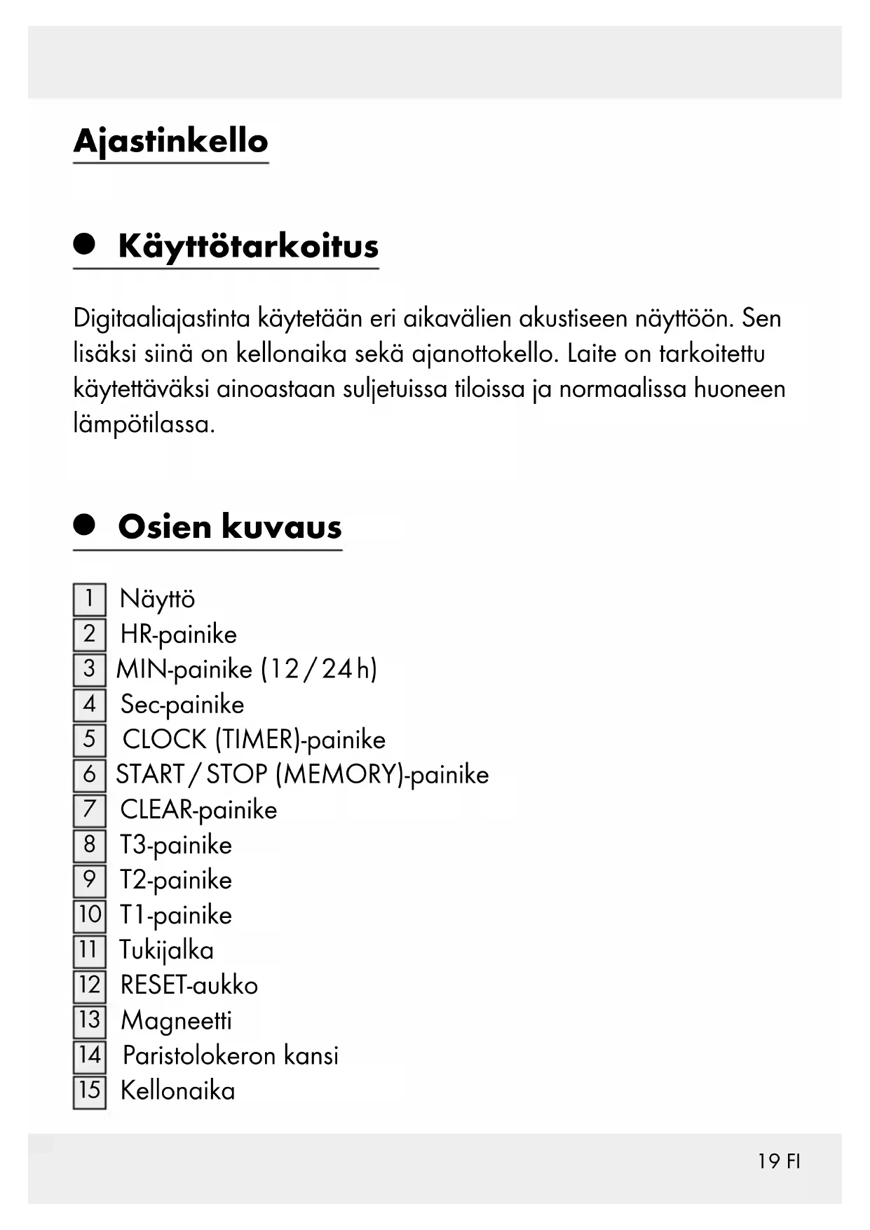 Käyttötarkoitus Digitaaliajastinta käytetään eri aikavälien akustiseen näyttöön. Sen lisäksi siinä on kellonaika sekä ajanottokello. Laite on tarkoitettu käytettäväksi ainoastaan suljetuissa tiloissa ja normaalissa huoneen lämpötilassa.