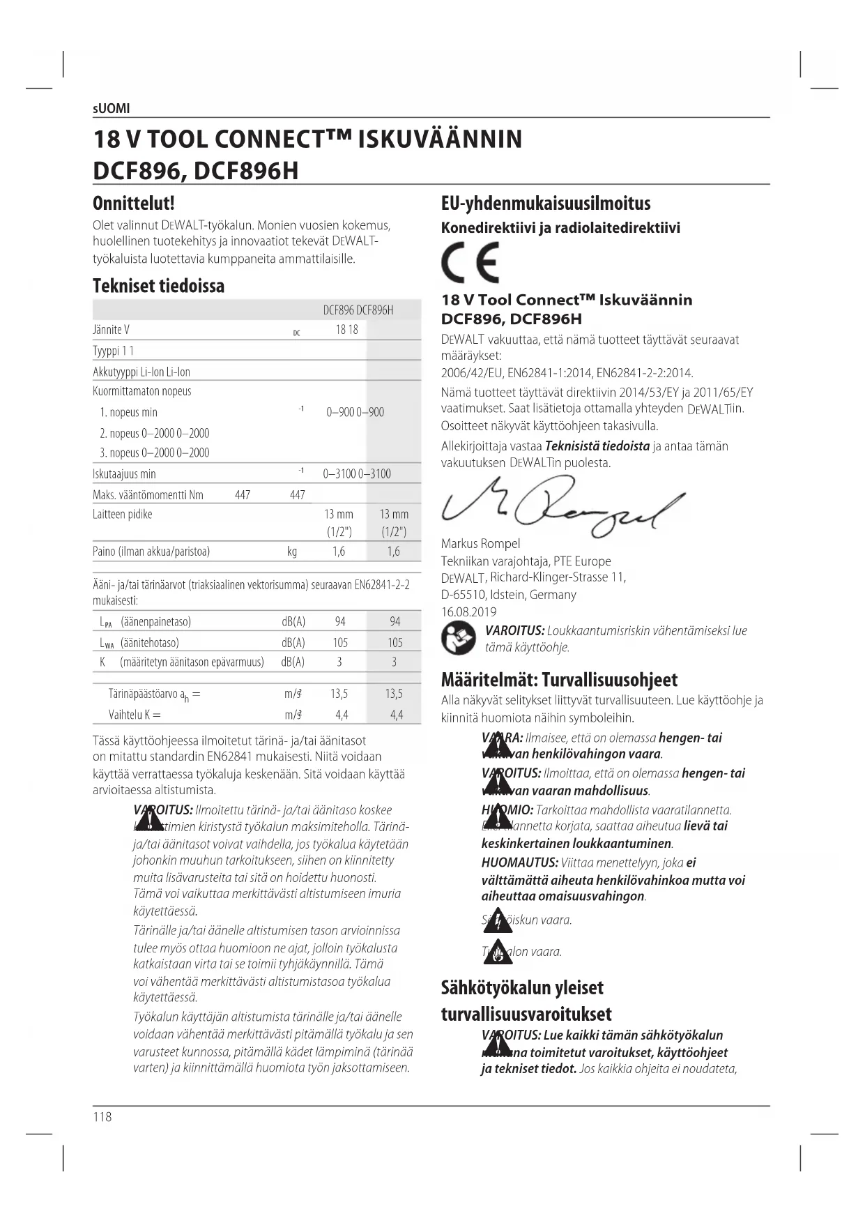 DeWALT vakuuttaa, että nämä tuotteet täyttävät seuraavat määräykset: 2006/42/EU, EN62841-1:2014, EN62841-2-2:2014. Nämä tuotteet täyttävät direktiivin 2014/53/EY ja 2011/65/EY vaatimukset. Saat lisätietoja ottamalla yhteyden DeWALT iin. Osoitteet näkyvät käyttöohjeentakasivulla. Allekirjoittaja vastaa Teknisistä tiedoista ja antaa tämän vakuutuksen DeWALT inpuolesta. Markus Rompel Tekniikan varajohtaja, PTE Europe DeWALT , Richard-Klinger-Strasse 11, D-65510, Idstein, Germany