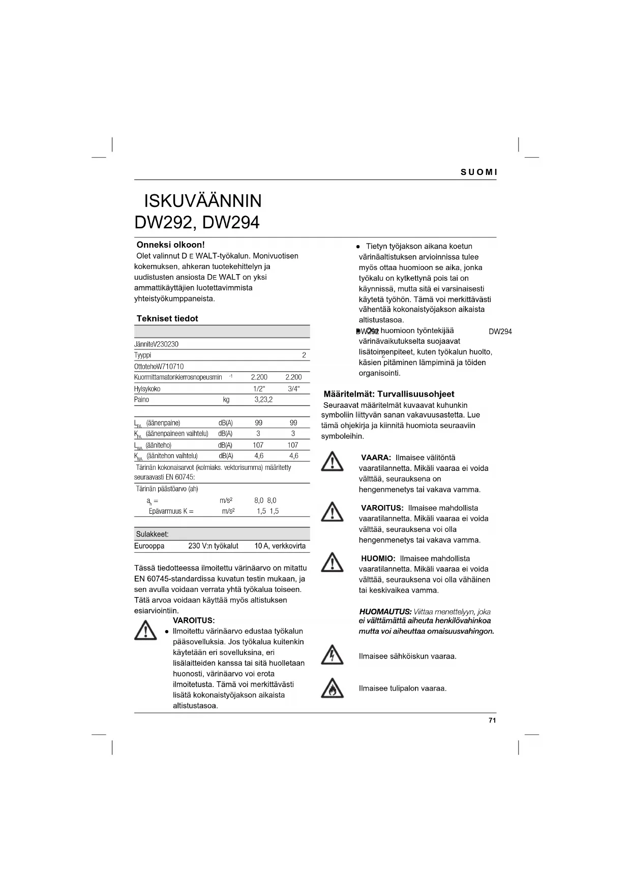 Ilmaisee tulipalon vaaraa. ISKUVÄÄNNIN DW292, DW29472 SUOMI EY-vaatimustenmukaisuustodistus KONEDIREKTIIVI DW292, DW294