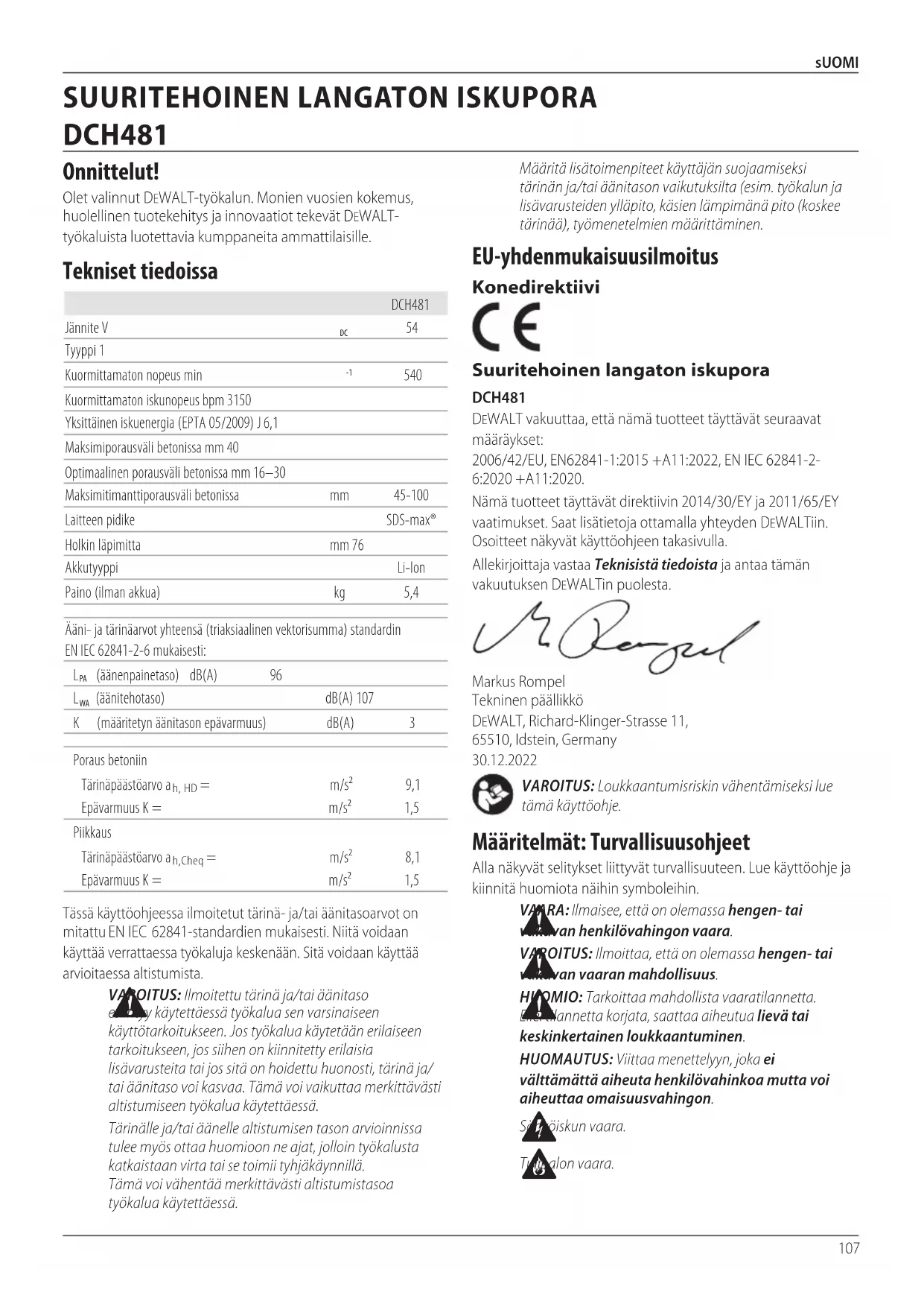 - As baterias de iões de lítio são recicláveis. Entregue-as ao seu fornecedor ou coloque-as num ecoponto. As baterias recolhidas serão recicladas ou eliminadascorrectamente.107 sUOMI EU-yhdenmukaisuusilmoitus Konedirektiivi Suuritehoinen langaton iskupora DCH481 DeWALT vakuuttaa, että nämä tuotteet täyttävät seuraavat määräykset: 2006/42/EU, EN62841-1:2015 +A11:2022, EN IEC 62841-2- 6:2020 +A11:2020. Nämä tuotteet täyttävät direktiivin 2014/30/EY ja 2011/65/EY vaatimukset. Saat lisätietoja ottamalla yhteyden DeWALTiin. Osoitteet näkyvät käyttöohjeentakasivulla. Allekirjoittaja vastaa Teknisistä tiedoista ja antaa tämän vakuutuksen DeWALTinpuolesta. Markus Rompel Tekninen päällikkö DeWALT, Richard-Klinger-Strasse 11, 65510, Idstein, Germany