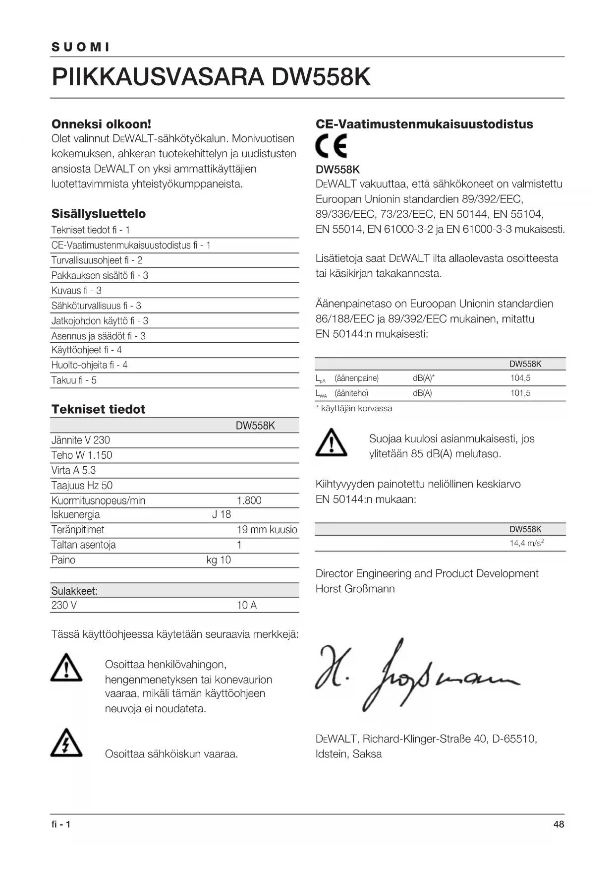 Onneksi olkoon! Olet valinnut DEWALT-sähkötyökalun. Monivuotisen kokemuksen, ahkeran tuotekehittelyn ja uudistusten ansiosta DEWALT on yksi ammattikäyttäjien luotettavimmista yhteistyökumppaneista. Sisällysluettelo Tekniset tiedot fi - 1 CE-Vaatimustenmukaisuustodistus fi - 1 Turvallisuusohjeet fi - 2 Pakkauksen sisältö fi - 3 Kuvaus fi - 3 Sähköturvallisuus fi - 3 Jatkojohdon käyttö fi - 3 Asennus ja säädöt fi - 3 Käyttöohjeet fi - 4 Huolto-ohjeita fi - 4 Takuu fi - 5 Tekniset tiedot DW558K Jännite V 230 Teho W 1.150 Virta A 5.3 Taajuus Hz 50 Kuormitusnopeus/min 1.800 Iskuenergia J 18 Teränpitimet 19 mm kuusio Taltan asentoja 1 Paino kg 10 Sulakkeet: 230 V 10 A Tässä käyttöohjeessa käytetään seuraavia merkkejä: Osoittaa henkilövahingon, hengenmenetyksen tai konevaurion vaaraa, mikäli tämän käyttöohjeen neuvoja ei noudateta. Osoittaa sähköiskun vaaraa. CE-Vaatimustenmukaisuustodistus DW558K DEWALT vakuuttaa, että sähkökoneet on valmistettu Euroopan Unionin standardien 89/392/EEC, 89/336/EEC, 73/23/EEC, EN 50144, EN 55104, EN 55014, EN 61000-3-2 ja EN 61000-3-3 mukaisesti. Lisätietoja saat DEWALT ilta allaolevasta osoitteesta tai käsikirjan takakannesta. Äänenpainetaso on Euroopan Unionin standardien 86/188/EEC ja 89/392/EEC mukainen, mitattu EN 50144:n mukaisesti: DW558K
