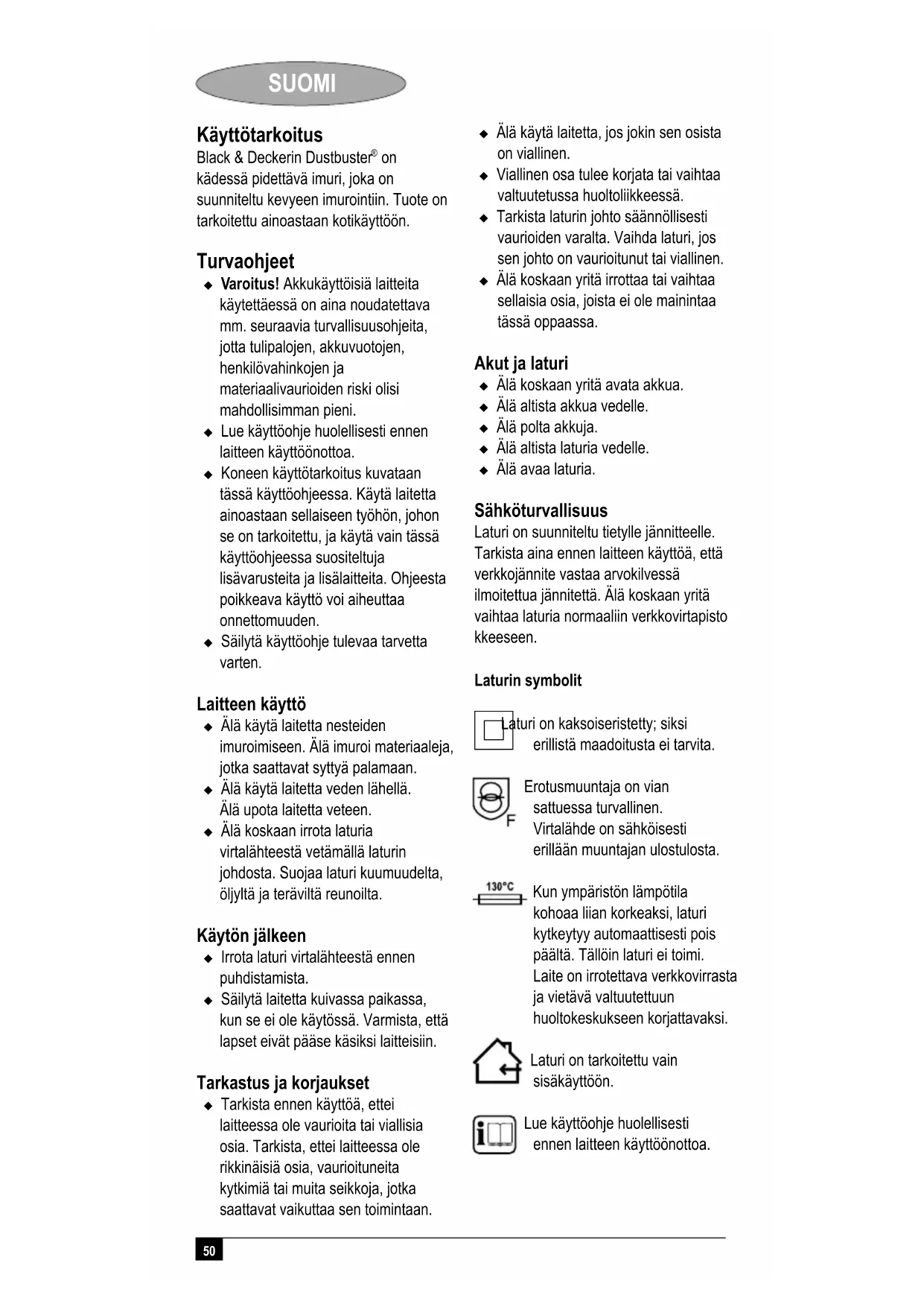 kädessä pidettävä imuri, joka on suunniteltu kevyeen imurointiin. Tuote on tarkoitettu ainoastaan kotikäyttöön. Turvaohjeet Varoitus! Akkukäyttöisiä laitteita käytettäessä on aina noudatettava mm. seuraavia turvallisuusohjeita, jotta tulipalojen, akkuvuotojen, henkilövahinkojen ja materiaalivaurioiden riski olisi mahdollisimman pieni. Lue käyttöohje huolellisesti ennen laitteen käyttöönottoa. Koneen käyttötarkoitus kuvataan tässä käyttöohjeessa. Käytä laitetta ainoastaan sellaiseen työhön, johon se on tarkoitettu, ja käytä vain tässä käyttöohjeessa suositeltuja lisävarusteita ja lisälaitteita. Ohjeesta poikkeava käyttö voi aiheuttaa onnettomuuden. Säilytä käyttöohje tulevaa tarvetta varten. Laitteen käyttö Älä käytä laitetta nesteiden imuroimiseen. Älä imuroi materiaaleja, jotka saattavat syttyä palamaan. Älä käytä laitetta veden lähellä. Älä upota laitetta veteen. Älä koskaan irrota laturia virtalähteestä vetämällä laturin johdosta. Suojaa laturi kuumuudelta, öljyltä ja teräviltä reunoilta. Käytön jälkeen Irrota laturi virtalähteestä ennen puhdistamista. Säilytä laitetta kuivassa paikassa, kun se ei ole käytössä. Varmista, että lapset eivät pääse käsiksi laitteisiin. Tarkastus ja korjaukset Tarkista ennen käyttöä, ettei laitteessa ole vaurioita tai viallisia osia. Tarkista, ettei laitteessa ole rikkinäisiä osia, vaurioituneita kytkimiä tai muita seikkoja, jotka saattavat vaikuttaa sen toimintaan. Älä käytä laitetta, jos jokin sen osista on viallinen. Viallinen osa tulee korjata tai vaihtaa valtuutetussa huoltoliikkeessä. Tarkista laturin johto säännöllisesti vaurioiden varalta. Vaihda laturi, jos sen johto on vaurioitunut tai viallinen. Älä koskaan yritä irrottaa tai vaihtaa sellaisia osia, joista ei ole mainintaa tässä oppaassa. Akut ja laturi Älä koskaan yritä avata akkua. Älä altista akkua vedelle. Älä polta akkuja. Älä altista laturia vedelle. Älä avaa laturia. Sähköturvallisuus Laturi on suunniteltu tietylle jännitteelle. Tarkista aina ennen laitteen käyttöä, että verkkojännite vastaa arvokilvessä ilmoitettua jännitettä. Älä koskaan yritä vaihtaa laturia normaaliin verkkovirtapisto kkeeseen. Laturin symbolit