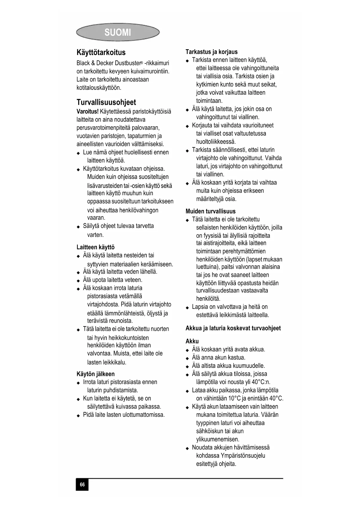 -rikkaimuri on tarkoitettu kevyeen kuivaimurointiin. Laite on tarkoitettu ainoastaan kotitalouskäyttöön. Turvallisuusohjeet Varoitus! Käytettäessä paristokäyttöisiä laitteita on aina noudatettava perusvarotoimenpiteitä palovaaran, vuotavien paristojen, tapaturmien ja aineellisten vaurioiden välttämiseksi. Lue nämä ohjeet huolellisesti ennen laitteen käyttöä. Käyttötarkoitus kuvataan ohjeissa. Muiden kuin ohjeissa suositeltujen lisävarusteiden tai -osien käyttö sekä laitteen käyttö muuhun kuin oppaassa suositeltuun tarkoitukseen voi aiheuttaa henkilövahingon vaaran. Säilytä ohjeet tulevaa tarvetta varten. Laitteen käyttö Älä käytä laitetta nesteiden tai syttyvien materiaalien keräämiseen. Älä käytä laitetta veden lähellä. Älä upota laitetta veteen. Älä koskaan irrota laturia pistorasiasta vetämällä virtajohdosta. Pidä laturin virtajohto etäällä lämmönlähteistä, öljystä ja terävistä reunoista. Tätä laitetta ei ole tarkoitettu nuorten tai hyvin heikkokuntoisten henkilöiden käyttöön ilman valvontaa. Muista, ettei laite ole lasten leikkikalu. Käytön jälkeen Irrota laturi pistorasiasta ennen laturin puhdistamista. Kun laitetta ei käytetä, se on säilytettävä kuivassa paikassa. Pidä laite lasten ulottumattomissa. Tarkastus ja korjaus Tarkista ennen laitteen käyttöä, ettei laitteessa ole vahingoittuneita tai viallisia osia. Tarkista osien ja kytkimien kunto sekä muut seikat, jotka voivat vaikuttaa laitteen toimintaan. Älä käytä laitetta, jos jokin osa on vahingoittunut tai viallinen. Korjauta tai vaihdata vaurioituneet tai vialliset osat valtuutetussa huoltoliikkeessä. Tarkista säännöllisesti, ettei laturin virtajohto ole vahingoittunut. Vaihda laturi, jos virtajohto on vahingoittunut tai viallinen. Älä koskaan yritä korjata tai vaihtaa muita kuin ohjeissa erikseen määriteltyjä osia. Muiden turvallisuus Tätä laitetta ei ole tarkoitettu sellaisten henkilöiden käyttöön, joilla on fyysisiä tai älyllisiä rajoitteita tai aistirajoitteita, eikä laitteen toimintaan perehtymättömien henkilöiden käyttöön (lapset mukaan luettuina), paitsi valvonnan alaisina tai jos he ovat saaneet laitteen käyttöön liittyvää opastusta heidän turvallisuudestaan vastaavalta henkilöltä. Lapsia on valvottava ja heitä on estettävä leikkimästä laitteella. Akkua ja laturia koskevat turvaohjeet Akku Älä koskaan yritä avata akkua. Älä anna akun kastua. Älä altista akkua kuumuudelle. Älä säilytä akkua tiloissa, joissa lämpötila voi nousta yli 40°C:n. Lataa akku paikassa, jonka lämpötila on vähintään 10°C ja enintään 40°C. Käytä akun lataamiseen vain laitteen mukana toimitettua laturia. Väärän tyyppinen laturi voi aiheuttaa sähköiskun tai akun ylikuumenemisen. Noudata akkujen hävittämisessä kohdassa Ympäristönsuojelu esitettyjä ohjeita.SUOMI