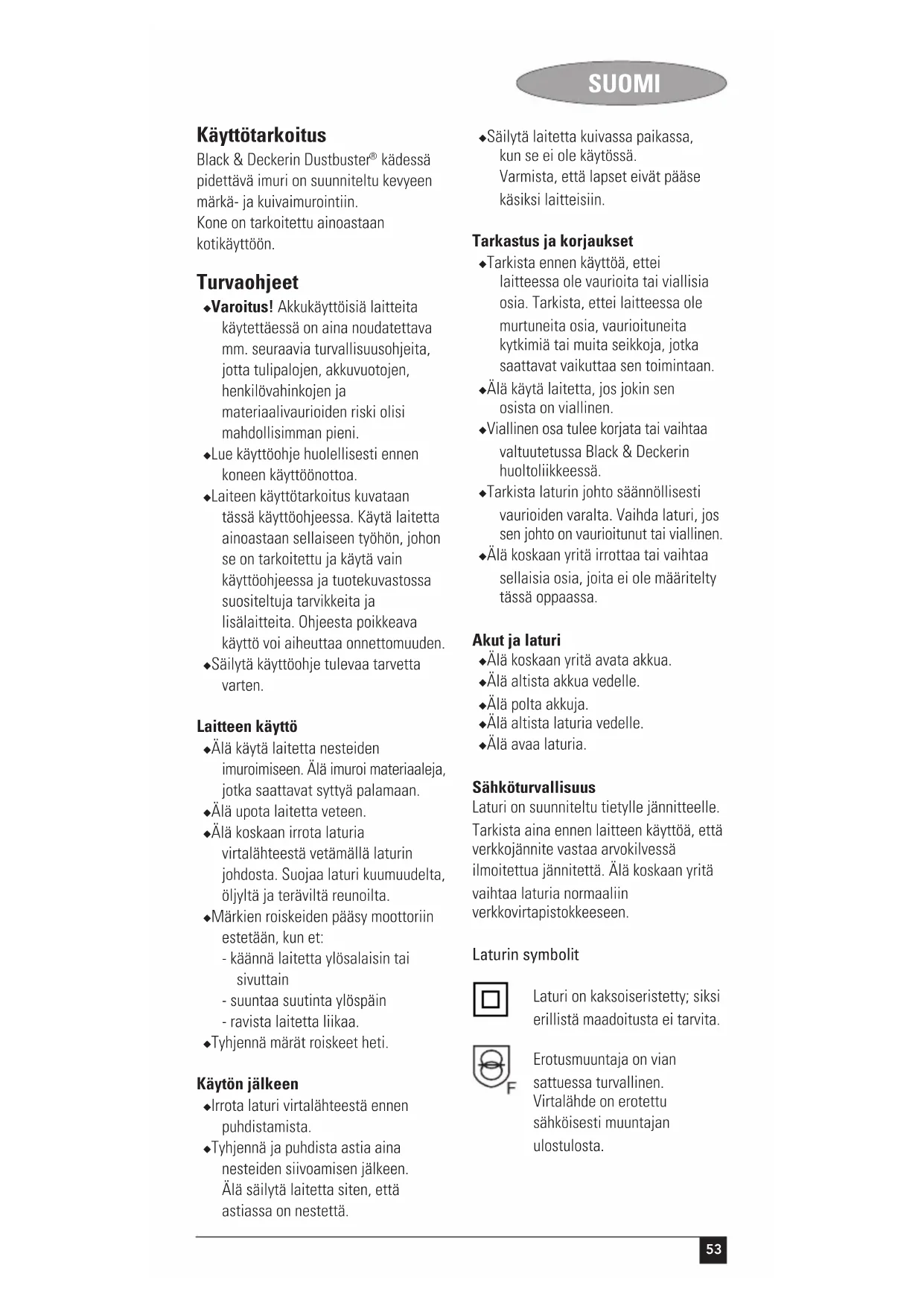 kädessä pidettävä imuri on suunniteltu kevyeen märkä- ja kuivaimurointiin. Kone on tarkoitettu ainoastaan kotikäyttöön. Turvaohjeet ◆ Varoitus! Akkukäyttöisiä laitteita käytettäessä on aina noudatettava mm. seuraavia turvallisuusohjeita, jotta tulipalojen, akkuvuotojen, henkilövahinkojen ja materiaalivaurioiden riski olisi mahdollisimman pieni. ◆ Lue käyttöohje huolellisesti ennen koneen käyttöönottoa. ◆ Laiteen käyttötarkoitus kuvataan tässä käyttöohjeessa. Käytä laitetta ainoastaan sellaiseen työhön, johon se on tarkoitettu ja käytä vain käyttöohjeessa ja tuotekuvastossa suositeltuja tarvikkeita ja lisälaitteita. Ohjeesta poikkeava käyttö voi aiheuttaa onnettomuuden. ◆ Säilytä käyttöohje tulevaa tarvetta varten. Laitteen käyttö ◆ Älä käytä laitetta nesteiden imuroimiseen. Älä imuroi materiaaleja, jotka saattavat syttyä palamaan. ◆ Älä upota laitetta veteen. ◆ Älä koskaan irrota laturia virtalähteestä vetämällä laturin johdosta. Suojaa laturi kuumuudelta, öljyltä ja teräviltä reunoilta. ◆ Märkien roiskeiden pääsy moottoriin estetään, kun et: - käännä laitetta ylösalaisin tai sivuttain - suuntaa suutinta ylöspäin - ravista laitetta liikaa. ◆ Tyhjennä märät roiskeet heti. Käytön jälkeen ◆ Irrota laturi virtalähteestä ennen puhdistamista. ◆ Tyhjennä ja puhdista astia aina nesteiden siivoamisen jälkeen. Älä säilytä laitetta siten, että astiassa on nestettä. ◆ Säilytä laitetta kuivassa paikassa, kun se ei ole käytössä. Varmista, että lapset eivät pääse käsiksi laitteisiin. Tarkastus ja korjaukset ◆ Tarkista ennen käyttöä, ettei laitteessa ole vaurioita tai viallisia osia. Tarkista, ettei laitteessa ole murtuneita osia, vaurioituneita kytkimiä tai muita seikkoja, jotka saattavat vaikuttaa sen toimintaan. ◆ Älä käytä laitetta, jos jokin sen osista on viallinen. ◆ Viallinen osa tulee korjata tai vaihtaa valtuutetussa Black & Deckerin huoltoliikkeessä. ◆ Tarkista laturin johto säännöllisesti vaurioiden varalta. Vaihda laturi, jos sen johto on vaurioitunut tai viallinen. ◆ Älä koskaan yritä irrottaa tai vaihtaa sellaisia osia, joita ei ole määritelty tässä oppaassa. Akut ja laturi ◆ Älä koskaan yritä avata akkua. ◆ Älä altista akkua vedelle. ◆ Älä polta akkuja. ◆ Älä altista laturia vedelle. ◆ Älä avaa laturia. Sähköturvallisuus Laturi on suunniteltu tietylle jännitteelle. Tarkista aina ennen laitteen käyttöä, että verkkojännite vastaa arvokilvessä ilmoitettua jännitettä. Älä koskaan yritä vaihtaa laturia normaaliin verkkovirtapistokkeeseen. Laturin symbolit Laturi on kaksoiseristetty; siksi erillistä maadoitusta ei tarvita. Erotusmuuntaja on vian sattuessa turvallinen. Virtalähde on erotettu sähköisesti muuntajan ulostulosta.54 SUOMI Laturi katkaisee virransyötön automaattisesti, jos ympäristön lämpötila nousee liikaa. Kun ympäristön lämpötila on taas laskenut, laturin toiminta jatkuu. Laturi on tarkoitettu vain sisäkäyttöön. Lue käyttöohje huolellisesti ennen koneen käyttöönottoa. Yleiskuvaus