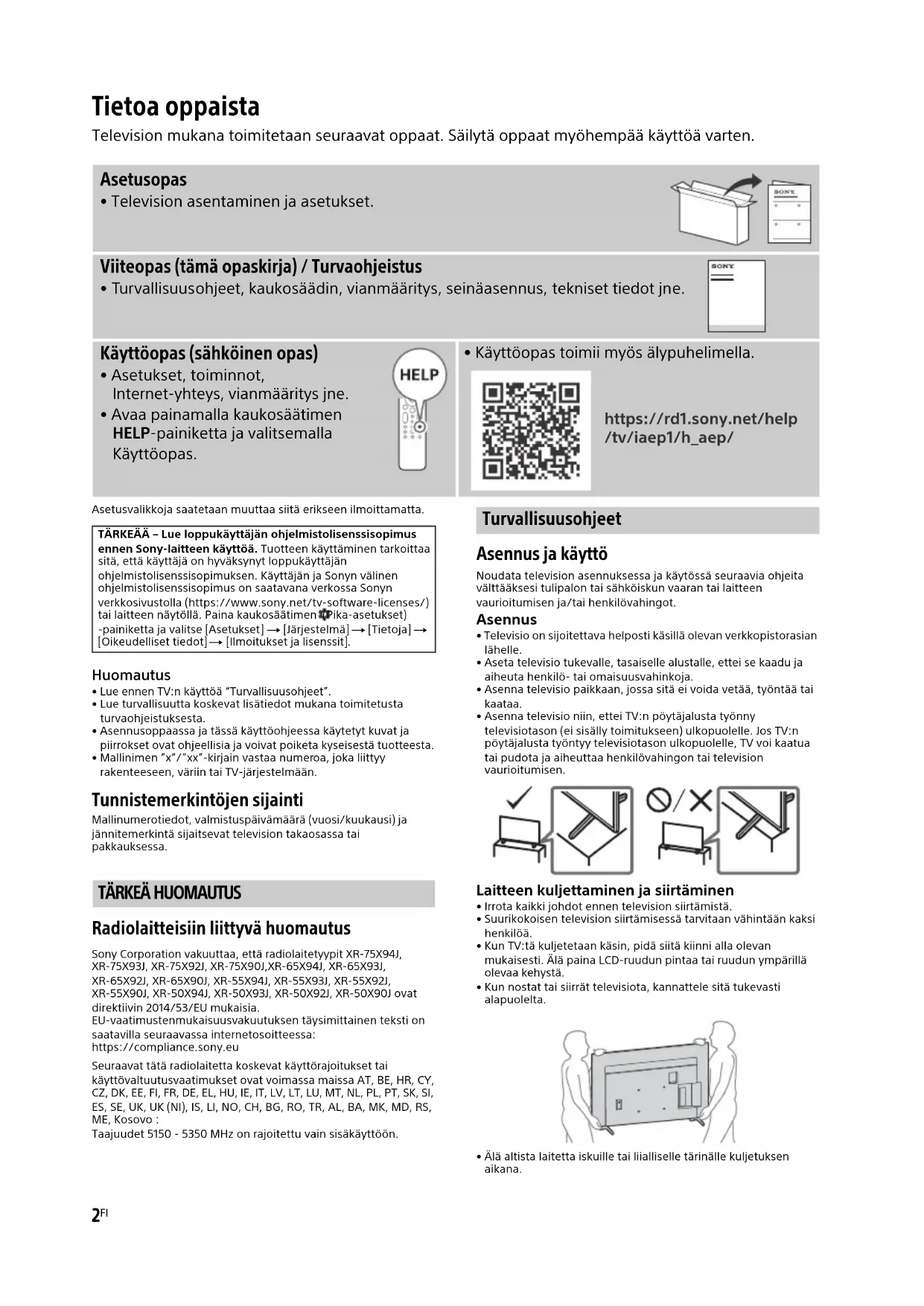 Radiolaitteisiin liittyvä huomautus Sony Corporation vakuuttaa, että radiolaitetyypit XR-75X94J, XR-75X93J, XR-75X92J, XR-75X90J,XR-65X94J, XR-65X93J, XR-65X92J, XR-65X90J, XR-55X94J, XR-55X93J, XR-55X92J, XR-55X90J, XR-50X94J, XR-50X93J, XR-50X92J, XR-50X90J ovat direktiivin 2014/53/EU mukaisia. EU-vaatimustenmukaisuusvakuutuksen täysimittainen teksti on saatavilla seuraavassa internetosoitteessa: https://compliance.sony.euSeuraavat tätä radiolaitetta koskevat käyttörajoitukset tai käyttövaltuutusvaatimukset ovat voimassa maissa AT, BE, HR, CY, CZ, DK, EE, FI, FR, DE, EL, HU, IE, IT, LV, LT, LU, MT, NL, PL, PT, SK, SI, ES, SE, UK, UK (NI), IS, LI, NO, CH, BG, RO, TR, AL, BA, MK, MD, RS, ME, Kosovo :Taajuudet 5150 - 5350 MHz on rajoitettu vain sisäkäyttöön. Turvallisuusohjeet Asennus ja käyttö Noudata television asennuksessa ja käytössä seuraavia ohjeita välttääksesi tulipalon tai sähköiskun vaaran tai laitteen vaurioitumisen ja/tai henkilövahingot. Asennus