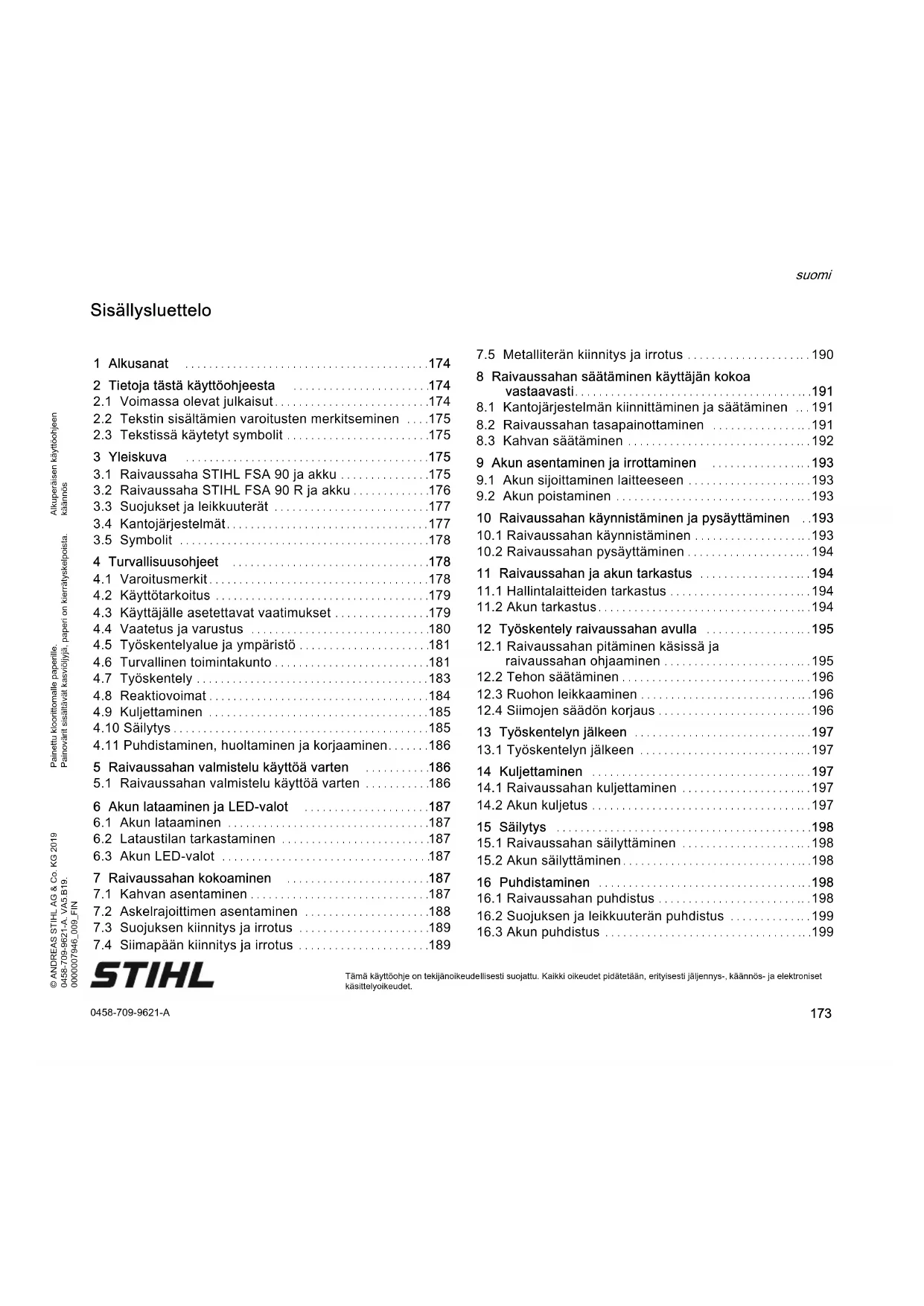 ANDREAS STIHL AG & Co. KG Badstraße 115 D-71336 Waiblingen Saksa vakuuttaa, että – Tuote: Akkukäyttöinen raivaussaha –Merkki: STIHL – Malli: FSA 90, FSA 90 R – Sarjatunniste: 4863 vastaa soveltuvilta osin direktiivien 2011/65/EU, 2006/42/EY, 2014/30/EU ja 2000/14/EY säännöksiä ja että tuote on kehitetty ja valmistettu seuraavien standardien tuotteen valmistuspäivänä voimassa olevien versioiden mukaisesti: EN 55014-1, EN 55014-2, EN 60335-1 ja EN ISO 12100 standardin EN 50636-2-91 vaatimukset huomioon ottaen. Mitattu ja taattu äänitehotaso on määritetty direktiivin 2000/14/EY liitteen VIII mukaisesti. – Mitattu äänitehotaso: 92 dB(A) – Taattu äänitehotaso: 94 dB(A) Teknisten asiakirjojen säilytyksestä vastaa ANDREAS STIHL AG & Co. KG:n tuotteiden lupamenettelyistä vastaava osasto (Produktzulassung). Valmistusvuosi, valmistusmaa ja koneen numero on merkitty raivaussahaan. Waiblingen, 1.3.2017 ANDREAS STIHL AG & Co. KG puolesta Thomas Elsner, Leiter Produktmanagement und Services (tuotehallinta- ja palveluasioista vastaava johtaja) 22 Varaosat ja varusteet Alkuperäiset STIHL-varaosat ja alkuperäiset STIHL-varusteet tunnistaa näistä merkeistä. 23 Hävittäminen 24 EU-vaatimustenmukaisuusvakuutusTraduzione delle istruzioni per l'uso originali Stampato su carta candeggiata senza cloro. I colori di stampa contengono oli vegetali; la carta è riciclabile. © ANDREAS STIHL AG & Co. KG 2019 0458-709-9621-A. VA5.B19. 0000007946_006_I 0458-709-9621-A italiano