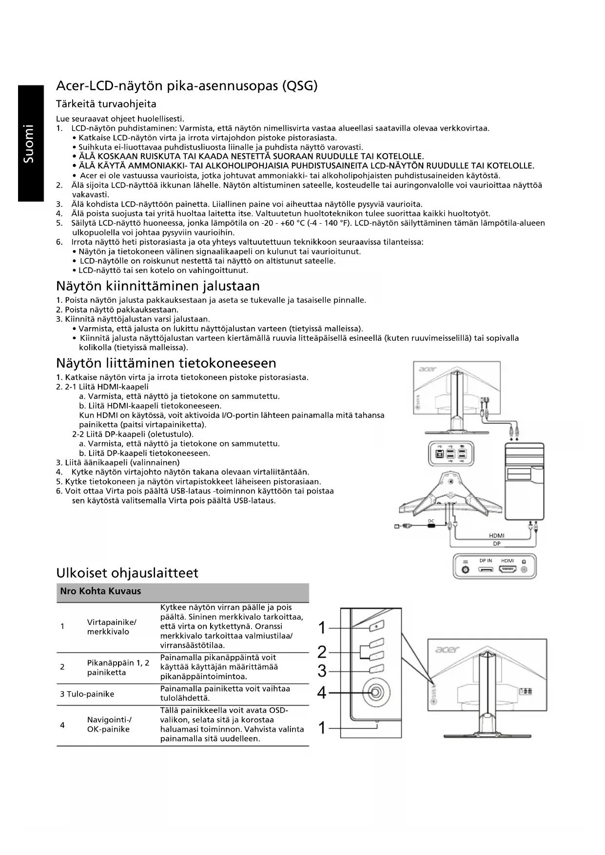 nVidia 3D Light Boost Gennemsigtighed Bredformat Indgang Tildel genvejstaster Hurtig opstart Tilstande Overclock (Kun DP) Oplysninger om skærm Nulstil Afslut Alle specifikationer kan ændres uden varsel.Suomi Acer-LCD-näytön pika-asennusopas (QSG) Tärkeitä turvaohjeita Lue seuraavat ohjeet huolellisesti.