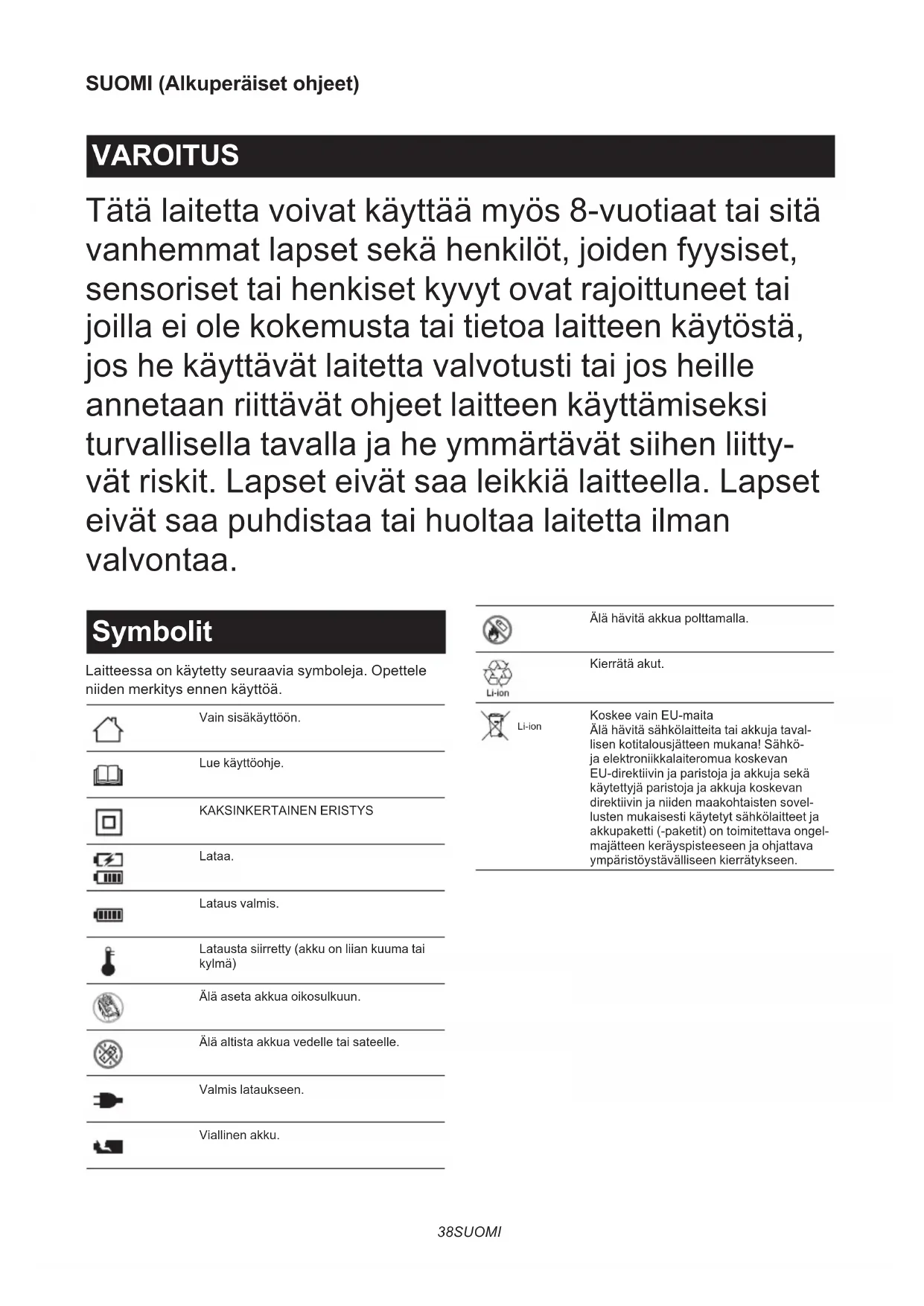 - Batteriinnsats som har vært etterlatt på et sted det har blitt utsatt for kaldluft. Opplading vil begynne etter at temperaturen til batteriinnsatsen når gradeantallet når opplading er mulig. MERK: Hvis ladelampen blinker vekselvis i grønt og rødt, er opplading ikke mulig. Terminalene på laderen eller batteriinnsatsen er blokkert med støv eller batteriinnsatsen er slitt ut eller skadet.38 SUOMI SUOMI (Alkuperäiset ohjeet) VAROITUS Tätä laitetta voivat käyttää myös 8-vuotiaat tai sitä vanhemmat lapset sekä henkilöt, joiden fyysiset, sensoriset tai henkiset kyvyt ovat rajoittuneet tai joilla ei ole kokemusta tai tietoa laitteen käytöstä, jos he käyttävät laitetta valvotusti tai jos heille annetaan riittävät ohjeet laitteen käyttämiseksi turvallisella tavalla ja he ymmärtävät siihen liitty- vät riskit. Lapset eivät saa leikkiä laitteella. Lapset eivät saa puhdistaa tai huoltaa laitetta ilman valvontaa. Symbolit Laitteessa on käytetty seuraavia symboleja. Opettele niiden merkitys ennen käyttöä. Vain sisäkäyttöön. Lue käyttöohje. KAKSINKERTAINEN ERISTYS Lataa. Lataus valmis. Latausta siirretty (akku on liian kuuma tai kylmä) Älä aseta akkua oikosulkuun. Älä altista akkua vedelle tai sateelle. Valmis lataukseen. Viallinen akku. Älä hävitä akkua polttamalla. Kierrätä akut. Li-ion Koskee vain EU-maita Älä hävitä sähkölaitteita tai akkuja taval- lisen kotitalousjätteen mukana! Sähkö- ja elektroniikkalaiteromua koskevan EU-direktiivin ja paristoja ja akkuja sekä käytettyjä paristoja ja akkuja koskevan direktiivin ja niiden maakohtaisten sovel- lusten mukaisesti käytetyt sähkölaitteet ja akkupaketti (-paketit) on toimitettava ongel- majätteen keräyspisteeseen ja ohjattava ympäristöystävälliseen kierrätykseen.39 SUOMI HUOMIO