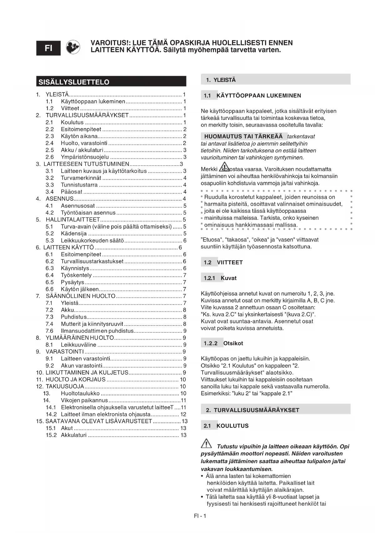 Toimenpide Tiheys Huomautuksia LAITE Kaikkien kiinnitysten tarkastus Ennen jokaista käyttöä kappale 7.4 Turvallisuustarkastukset / Ohjainten tarkastus Ennen jokaista käyttöä kappale 6.2 Leikkuuvälineen tarkastus Ennen jokaista käyttöä kappale 6.2.1 Akun latauksen tarkistus Ennen jokaista käyttöä * Akun lataus Jokaisen käytön jälkeen kappale 7.2.2 * Yleinen puhdistus ja tarkastus Jokaisen käytön jälkeen kappale 7.3FI - 11 Laitteessa esiintyvien mahdollisten vahinkojen tarkastus. Ota tarvittaessa yhteyttä valtuutettuun huoltokeskukseen. Jokaisen käytön jälkeen - Ilmansuodattimen puhdistus Kerran kuukaudessa kappale 7.6 Voimansiirron puhdistus 1 - 2 kertaa vuodessa kappale 7.5 Leikkuuvälineen vaihto - kappale 8.1 *** Vedon säätö *** **