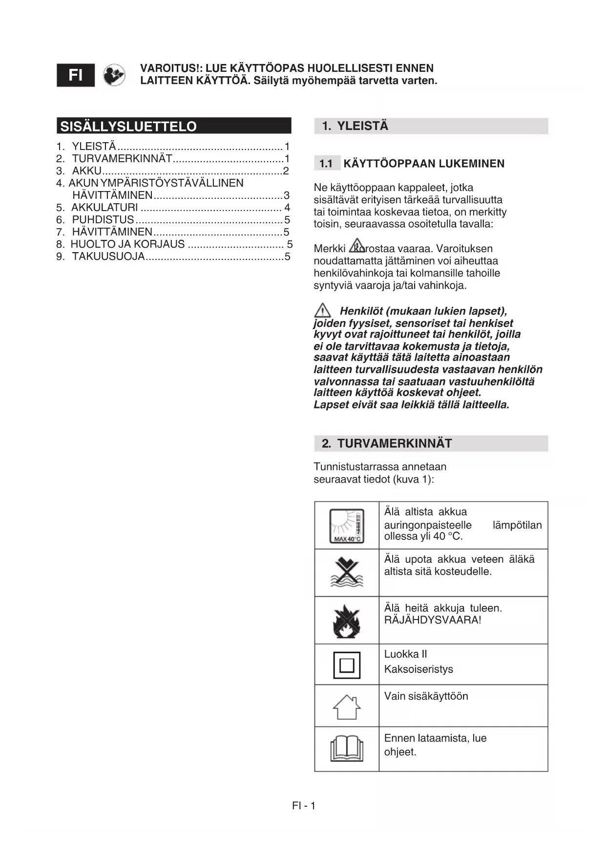 Älä altista akkua auringonpaisteelle lämpötilan ollessa yli 40 °C. Älä upota akkua veteen äläkä altista sitä kosteudelle. Älä heitä akkuja tuleen. RÄJÄHDYSVAARA! Luokka II Kaksoiseristys Vain sisäkäyttöön Ennen lataamista, lue ohjeet. VAROITUS!: LUE KÄYTTÖOPAS HUOLELLISESTI ENNEN LAITTEEN KÄYTTÖÄ. Säilytä myöhempää tarvetta varten.