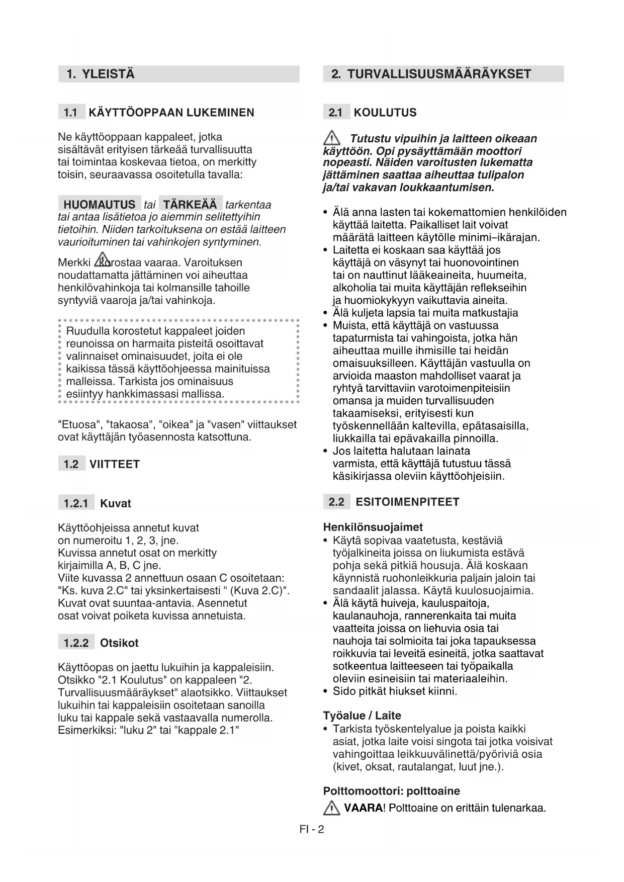 - Tarkista työskentelyalue ja poista kaikki asiat, jotka laite voisi singota tai jotka voisivat vahingoittaa leikkuuvälinettä/pyöriviä osia (kivet, oksat, rautalangat, luut jne.). Polttomoottori: polttoaine VAARA! Polttoaine on erittäin tulenarkaa.FI - 3