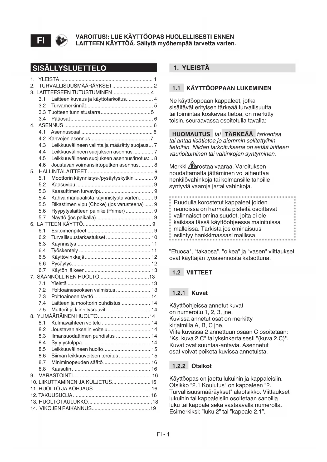 Käyttöopas on jaettu lukuihin ja kappaleisiin. Otsikko "2.1 Koulutus" on kappaleen "2. Turvallisuusmääräykset" alaotsikko. Viittaukset lukuihin tai kappaleisiin osoitetaan sanoilla luku tai kappale sekä vastaavalla numerolla. Esimerkiksi: ”luku 2” tai ”kappale 2.1”. VAROITUS!: LUE KÄYTTÖOPAS HUOLELLISESTI ENNEN LAITTEEN KÄYTTÖÄ. Säilytä myöhempää tarvetta varten.
