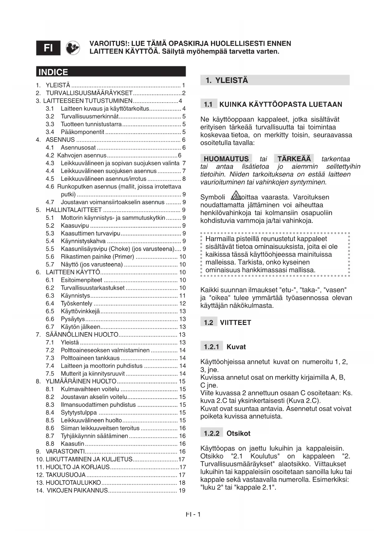 Käyttöopas on jaettu lukuihin ja kappaleisiin. Otsikko "2.1 Koulutus" on kappaleen "2. Turvallisuusmääräykset" alaotsikko. Viittaukset lukuihin tai kappaleisiin osoitetaan sanoilla luku tai kappale sekä vastaavalla numerolla. Esimerkiksi: "luku 2" tai "kappale 2.1". VAROITUS!: LUE TÄMÄ OPASKIRJA HUOLELLISESTI ENNEN LAITTEEN KÄYTTÖÄ. Säilytä myöhempää tarvetta varten.