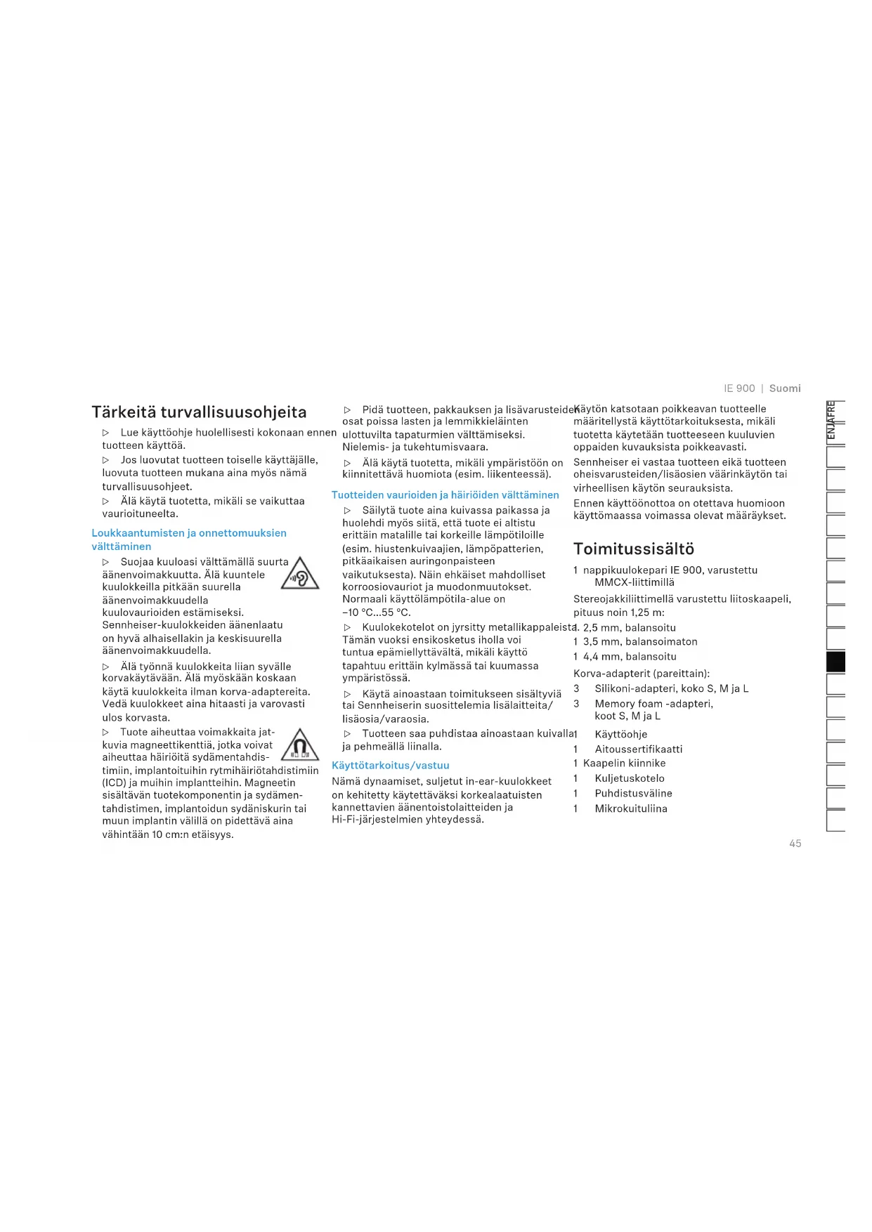 IE 900 | Suomi Tärkeitä turvallisuusohjeita ▷ Lue käyttöohje huolellisesti kokonaan ennen tuotteen käyttöä. ▷ Jos luovutat tuotteen toiselle käyttäjälle, luovuta tuotteen mukana aina myös nämä turvallisuusohjeet. ▷ Älä käytä tuotetta, mikäli se vaikuttaa vaurioituneelta. Loukkaantumisten ja onnettomuuksien välttäminen ▷ Suojaa kuuloasi välttämällä suurta äänenvoimakkuutta. Älä kuuntele kuulokkeilla pitkään suurella äänenvoimakkuudella kuulovaurioiden estämiseksi. Sennheiser-kuulokkeiden äänenlaatu on hyvä alhaisellakin ja keskisuurella äänenvoimakkuudella. ▷ Älä työnnä kuulokkeita liian syvälle korvakäytävään. Älä myöskään koskaan käytä kuulokkeita ilman korva-adaptereita. Vedä kuulokkeet aina hitaasti ja varovasti ulos korvasta. ▷ Tuote aiheuttaa voimakkaita jat- kuvia magneettikenttiä, jotka voivat aiheuttaa häiriöitä sydämentahdis- timiin, implantoituihin rytmihäiriötahdistimiin (ICD) ja muihin implantteihin. Magneetin sisältävän tuotekomponentin ja sydämen- tahdistimen, implantoidun sydäniskurin tai muun implantin välillä on pidettävä aina vähintään 10 cm:n etäisyys. ▷ Pidä tuotteen, pakkauksen ja lisävarusteiden osat poissa lasten ja lemmikkieläinten ulottuvilta tapaturmien välttämiseksi. Nielemis- ja tukehtumisvaara. ▷ Älä käytä tuotetta, mikäli ympäristöön on kiinnitettävä huomiota (esim. liikenteessä). Tuotteiden vaurioiden ja häiriöiden välttäminen ▷ Säilytä tuote aina kuivassa paikassa ja huolehdi myös siitä, että tuote ei altistu erittäin matalille tai korkeille lämpötiloille (esim. hiustenkuivaajien, lämpöpatterien, pitkäaikaisen auringonpaisteen vaikutuksesta). Näin ehkäiset mahdolliset korroosiovauriot ja muodonmuutokset. Normaali käyttölämpötila-alue on –10 °C...55 °C. ▷ Kuulokekotelot on jyrsitty metallikappaleista. Tämän vuoksi ensikosketus iholla voi tuntua epämiellyttävältä, mikäli käyttö tapahtuu erittäin kylmässä tai kuumassa ympäristössä. ▷ Käytä ainoastaan toimitukseen sisältyviä tai Sennheiserin suosittelemia lisälaitteita/ lisäosia/varaosia. ▷ Tuotteen saa puhdistaa ainoastaan kuivalla ja pehmeällä liinalla. Käyttötarkoitus/vastuu Nämä dynaamiset, suljetut in-ear-kuulokkeet on kehitetty käytettäväksi korkealaatuisten kannettavien äänentoistolaitteiden ja Hi-Fi-järjestelmien yhteydessä. Käytön katsotaan poikkeavan tuotteelle määritellystä käyttötarkoituksesta, mikäli tuotetta käytetään tuotteeseen kuuluvien oppaiden kuvauksista poikkeavasti. Sennheiser ei vastaa tuotteen eikä tuotteen oheisvarusteiden/lisäosien väärinkäytön tai virheellisen käytön seurauksista. Ennen käyttöönottoa on otettava huomioon käyttömaassa voimassa olevat määräykset. Toimitussisältö 1 nappikuulokepari IE 900, varustettu MMCX-liittimillä Stereojakkiliittimellä varustettu liitoskaapeli, pituus noin 1,25 m: 1 2,5 mm, balansoitu 1 3,5 mm, balansoimaton 1 4,4 mm, balansoitu Korva-adapterit (pareittain): 3 Silikoni-adapteri, koko S, M ja L 3 Memory foam -adapteri, koot S, M ja L 1 Käyttöohje 1 Aitoussertifikaatti 1 Kaapelin kiinnike 1 Kuljetuskotelo 1 Puhdistusväline 1 Mikrokuituliina46 Suomi | IE 900 Sennheiser IE 900 Vaativimmalle musiikinystävälle ihanteellisen soinnin etsiminen merkitsee loputonta täydellisyyden tavoittelua. Tästä intohimosta innoituksensa saaneet IE 900 -kuulokkeet ovat Sennheiserin In-Ear-sarjan uusi huippumalli, joka on luonnollisen äänentoiston uusi vertailukohta. Huippuluokan kotelo, maineikkaan 7 mm:n XWB-kuuloke-elementin parannettu versio ja kuulokkeiden äänikanavan ominaispiirteet: pienimmätkin yksityiskohdat on otettu kehitystyössä huomioon, jotta nämä In-Ear-kuulokkeet välittäisivät Sennheiserin laaja-alaisen akustiikka-alan osaamisen kuuloelämykseksi. Uusi akustinen rakenne käsittää parannetun puhekelan, joka optimoi tehon korkeilla taajuuksilla siten, että tuloksena on kirkas ja luonnollinen ääni. Optimoitu kalvo minimoi luonnolliset resonanssit ja harmonisen särön. Tällaiset lukuisat hienovaraiset parannukset tuottavat yhdessä ainutlaatuisen luonnollinen äänen, joka on elämys vaativimmallekin musiikinkuuntelijalle. IE 900 -kuulokkeiden valmistuksesta vastaa erikoistunut asiantuntijatiimi Sennheiserin pää- toimipaikassa Saksassa. Valmistus tapahtuu tällöin erittäin tiukkoja tuotantotoleransseja noudattaen. Jokainen kuuloke-elementti testataan kahdesti – sekä erikseen että sen jälkeen, kun vasen ja oikea kuuloke on yhdistetty kuulokepariksi. Vasemman ja oikean kanavan kuuloke-elementit valitaan siten, että ne sopivat optimaalisesti yhteen. Tällainen omistautuminen yksityiskohtien viimeistelyyn ilmenee myös kuulokkeiden ensiluokkaisessa rakenteessa, joka on saanut innoituksensa ammattikäyttöön tarkoitetuista audioratkaisuista. Jokainen kotelo jyrsitään tarkkuustyönä yhdestä ainoasta korkealaatuisesta alumiinikappaleesta, mikä takaa samanaikaisesti sekä parhaan mahdollisen äänenlaadun että poikkeuksellisen kestävyyden. IE 900 -kuulokkeiden liitäntämahdollisuudet ovat myös erittäin monipuoliset, sillä käytettävissä ovat korkealaatuiset Fidelity
