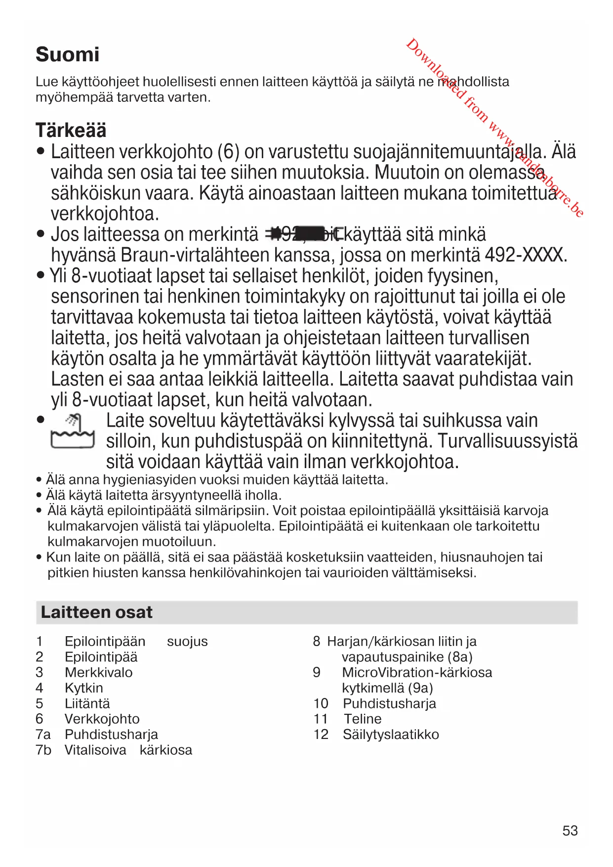 - Kosteusvoiteen levittäminen on suositeltavaa epiloinnin jälkeen, jotta iho rentoutuu. Kun epiloit ensimmäistä kertaa, on suositeltavaa tehdä se illalla, jotta mahdollinen punoitus häviää yön aikana. Yleistä tietoa epiloinnista Kaikki ihokarvanpoistomenetelmät, joissa karvat poistetaan juurineen, voivat aiheuttaa ihoärsytystä (esim. ihon kutinaa, epämukavan tunteen tai punoitusta) ihon ja ihokarvojen kunnosta riippuen. Kyseessä on normaali reaktio, joka häviää yleensä nopeasti. Reaktio voi kuitenkin olla voimakkaampi poistettaessa ihokarvoja ensimmäisiä kertoja juurineen tai jos sinulla on herkkä iho. Yleensä ihoreaktiot ja kivun tunne vähenevät merkittävästi toistuvassa käytössä. Jos ihossa esiintyy ärsytystä vielä 36 tunnin kuluttua, suosittelemme yhteydenottoa lääkäriin. Minimoi ihoon pääsevistä bakteereista (esim. liu’utettaessa laitetta iholla) johtuva ihon tulehdusriski puhdistamalla epilointipää ja iho perusteellisesti ennen laitteen käyttöä. Jos et ole varma laitteen soveltuvuudesta itsellesi, ota yhteyttä lääkäriisi. Seuraavissa tapauksissa laitetta tulisi käyttää vasta, kun asiasta on keskusteltu lääkärin kanssa: ihottuma, haavat, tulehtunut iho, kuten karvan juuritupen tulehdus (märkivät rakkulat), suonikohjut, luomien ympärillä, ihon heikentynyt vastustuskyky, esim. diabetes, raskaus, Raynaud’n oireyhtymä, Koebnerin ilmiö, verenvuototauti tai heikko vastustuskyky. Jos alat käyttää hormoneja tai jos vaihdat hormonilääkityksen tyyppiä (esim. ehkäisypillerit), hormonitason muutokset voivat vaikuttaa ihokarvojen kasvuun. Tämän aiheuttaa muutos hormonitasossa, ei laitteen käyttäminen. Puhdistusharjan käyttäminen (käyttö märkänä tai kuivana) Vedä epilointipää irti, aseta tilalle harjan liitin (8) ja napsauta puhdistusharja (7a) tai vitalisoiva kärkiosa (7b) paikalleen. Käytä tätä kärkiosaa osana päivittäistä puhdistusrutiiniasi yhdessä veden, saippuan, puhdistusaineen, puhdistusmaidon, geelin tai kuorinta-aineen kanssa. Vitalisoiva kärkiosa hieroo myös intensiivisesti tuoden esiin ihon heleyden. Ohjaa harjaa/kärkiosaa iholla hellävaraisesti, pyörivin liikkein. Vältä silmien aluetta ja hiusrajaa. MicroVibration-kärkiosan käyttäminen Kiinnitä MicroVibration-kärkiosa (9). Voit valita hellävaraisen tai tehokkaan tilan liu’uttamalla kytkintä (9a) vasemmalle tai oikealle. Kumpaakin tilaa voidaan käyttää nopeudella 1 tai 2. 91474612_FaceSpa_Pro_910-911-912-913_921_EURO_S4-122.indd 5591474612_FaceSpa_Pro_910-911-912-913_921_EURO_S4-122.indd 55 17.08.17 15:1517.08.17 15:15 CSS APPROVED Effective Date 18Aug2017 GMT - Printed 17Oct2017 Page 55 of 122 Downloaded from www.vandenborre.be56 Suosittelemme MicroVibration-kärkiosaa nestemäisten ihonhoitotuotteiden levittämiseen. Hellävarainen taputtelu varmistaa ihonhoitotuotteen tehokkaan ja taloudellisen levittämisen. Ohjaa MicroVibration-kärkiosaa hitaasti kasvojen 3 alueella (20 sekuntia jokaisella). Puhdistus ja huolto Puhdista laite käytön jälkeen seuraavalla tavalla: MicroVibration-kärkiosa (9): Puhdista kostella liinalla. Älä puhdista vedessä. Epilointipää (2): Puhdista pinsetit huolellisesti harjalla (10). Voit halutessasi kastaa harjan etanoliin (70 %). Älä puhdista epilointipäätä vedessä. Puhdistusharja/kärkiosa (7, 8): Vain tämä kärkiosa voidaan huuhdella juoksevassa vedessä. Jos puhdistat sen mieluummin saippualla ja lämpimällä vedellä, voit irrottaa harjan/kärkiosan (7a/b) painamalla vapautuspainiketta (8a). Anna kaikkien osien kuivua puhdistuksen jälkeen, ennen kuin kiinnität ne uudelleen. Saat parhaan tuloksen vaihtamalla harjan/kärkiosan (7a/b) 3 kuukauden välein tai useammin, mikäli harjakset vääntyvät tiheän käytön vuoksi. Erilaisia vaihtoharjoja (viitenro 80 Face) on saatavilla laitteen myyneeltä jälleenmyyjältä, Braun- huoltoliikkeistä tai osoitteesta www.braun.com. Ympäristötietoja Tässä laitteessa on akut ja/tai kierrätettäviä sähköosia. Ympäristösuojelullisista syistä niitä ei saa hävittää kotitalousjätteiden mukana, vaan ne pitää viedä asianmukaiseen paikalliseen kierrätyspisteeseen. Tiedot voivat muuttua ilman ennakkoilmoitusta. Takuu Tälle tuotteelle myönnämme 2 vuoden takuun ostopäivästä lukien Suomessa voimassa olevien alan takuuehtojen TE90 mukaan. Takuuaikana korvataan veloituksetta kaikki viat, jotka aiheutuvat materiaaliviasta tai valmistusvirheestä. Korvaus tapahtuu harkintamme mukaan korjaamalla, vaihtamalla viallinen osa tai vaihtamalla koko laite uuteen. Takuu on voimassa kaikkialla maailmassa sillä edellytyksellä, että laitetta myydään ko. maassa Braunin tai virallisen maahantuojan toimesta. Takuun piiriin eivät kuulu seuraavat viat: viat, jotka johtuvat virheellisestä käytöstä, normaalista kulumisesta tai viat, jolla on vähäinen merkitys laitteen arvoon tai toimintaan. Takuun voimassaolo lakkaa, jos laitetta korjataan muualla kuin valtuutetussa Braun-huoltoliikkeessä tai jos laitteessa käytetään muita kuin alkuperäisiä varaosia. Yksilöity ostokuitti riittää takuun voimassaolon osoittamiseksi: www.service.braun.com. Lisätietoa takuuseen liittyvistä asioista saa asiakaspalvelukeskuksestamme numerosta 020-377 877. 91474612_FaceSpa_Pro_910-911-912-913_921_EURO_S4-122.indd 5691474612_FaceSpa_Pro_910-911-912-913_921_EURO_S4-122.indd 56 17.08.17 15:1517.08.17 15:15 CSS APPROVED Effective Date 18Aug2017 GMT - Printed 17Oct2017 Page 56 of 122 Downloaded from www.vandenborre.be57 Przed rozpoczęciem użytkowania urządzenia należy dokładnie zapoznać się ze wszystkimi zaleceniami zawartymi w niniejszej instrukcji. Instrukcję zachować na przyszłość. Ważne