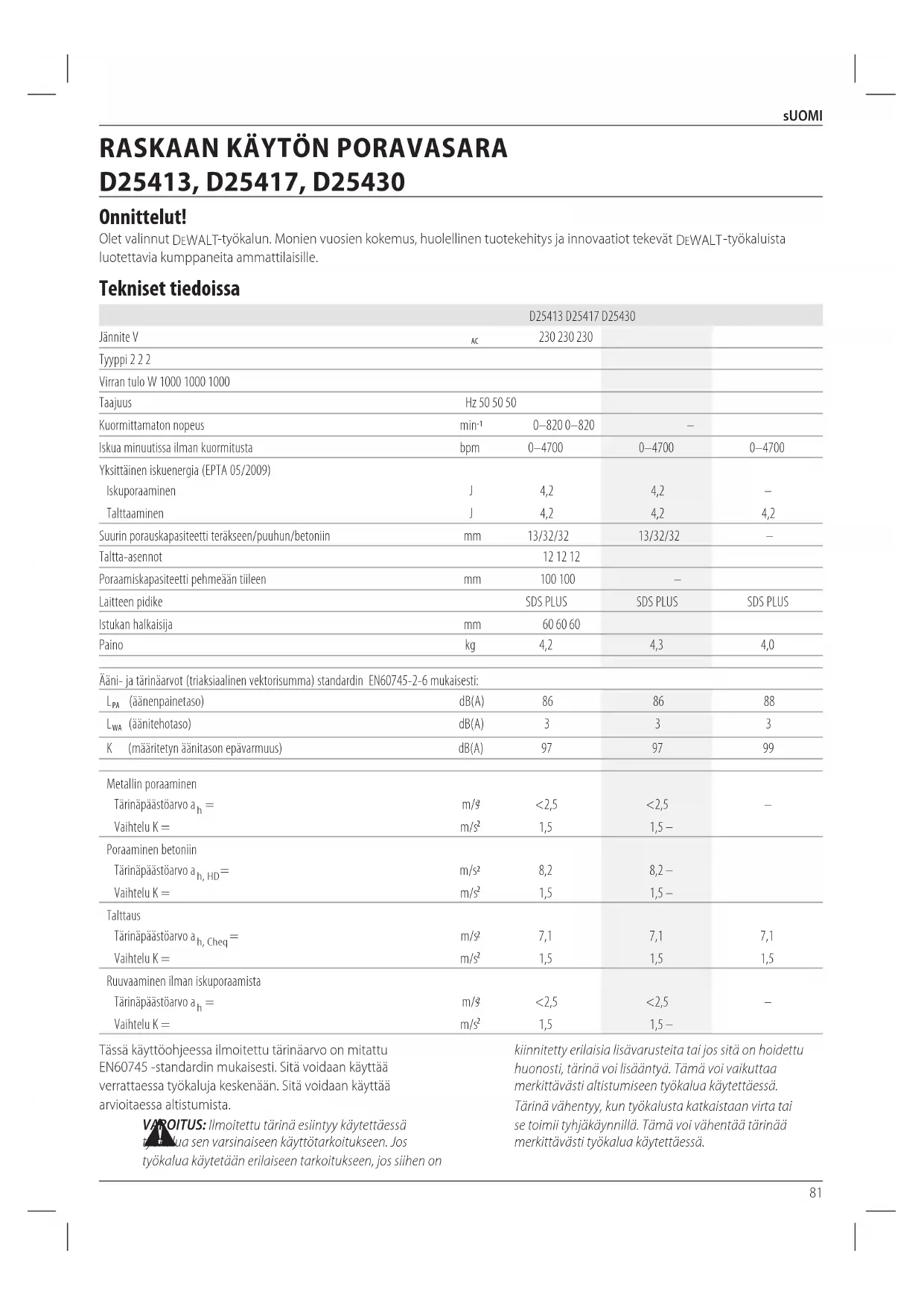 D25413, D25417, D25430 Onnittelut! Olet valinnut DeWALT -työkalun. Monien vuosien kokemus, huolellinen tuotekehitys ja innovaatiot tekevät DeWALT -työkaluista luotettavia kumppaneitaammattilaisille. Tekniset tiedoissa D25413 D25417 D25430 Jännite V
