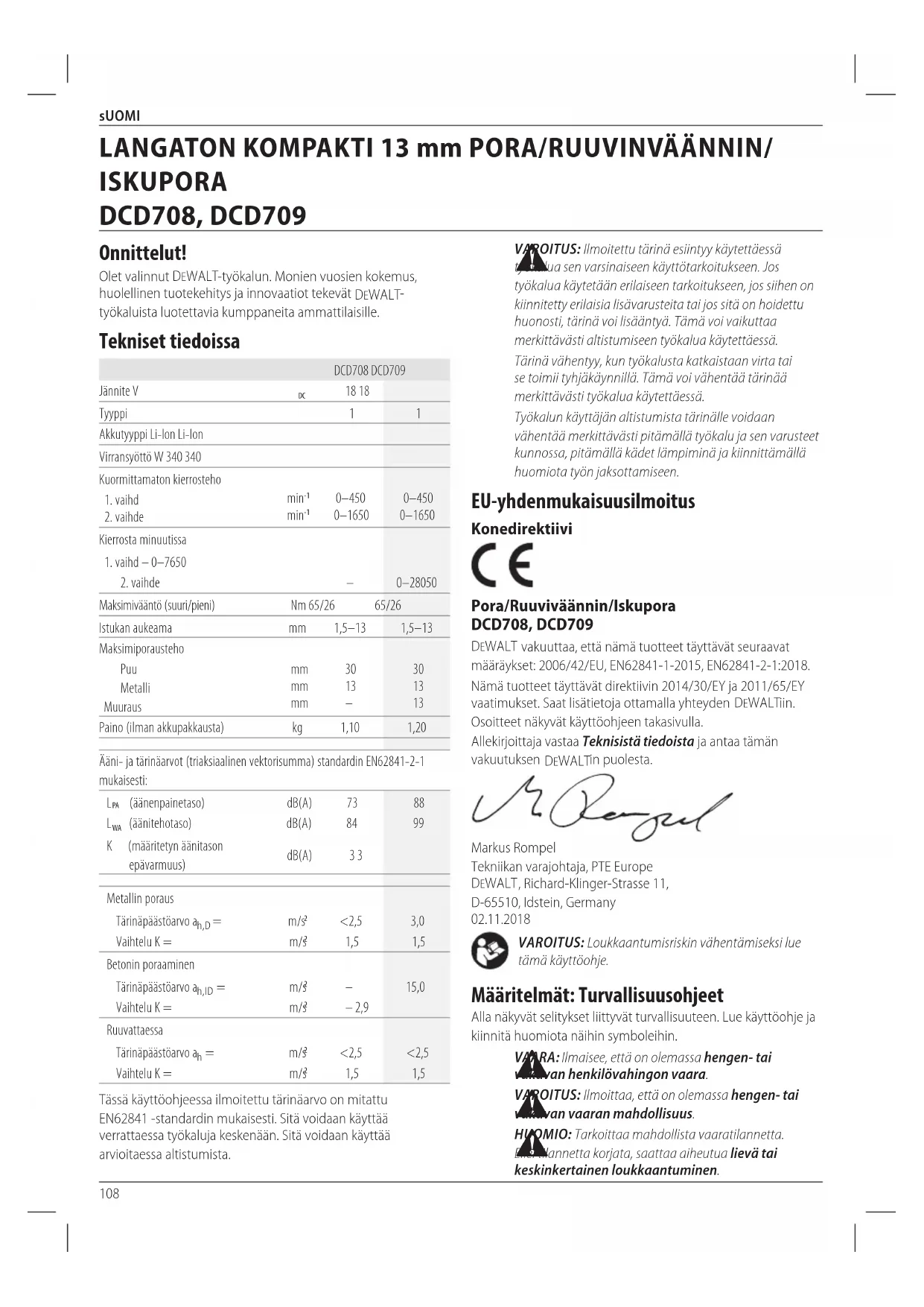 VAROITUS: Ilmoitettu tärinä esiintyy käytettäessä työkalua sen varsinaiseen käyttötarkoitukseen. Jos työkalua käytetään erilaiseen tarkoitukseen, jos siihen on kiinnitetty erilaisia lisävarusteita tai jos sitä on hoidettu huonosti, tärinä voi lisääntyä. Tämä voi vaikuttaa merkittävästi altistumiseen työkaluakäytettäessä. Tärinä vähentyy, kun työkalusta katkaistaan virta tai se toimii tyhjäkäynnillä. Tämä voi vähentää tärinää merkittävästi työkaluakäytettäessä. Työkalun käyttäjän altistumista tärinälle voidaan vähentää merkittävästi pitämällä työkalu ja sen varusteet kunnossa, pitämällä kädet lämpiminä ja kiinnittämällä huomiota työnjaksottamiseen. EU-yhdenmukaisuusilmoitus Konedirektiivi Pora/Ruuviväännin/Iskupora DCD708, DCD709 DeWALT vakuuttaa, että nämä tuotteet täyttävät seuraavat määräykset: 2006/42/EU, EN62841-1-2015, EN62841-2-1:2018. Nämä tuotteet täyttävät direktiivin 2014/30/EY ja 2011/65/EY vaatimukset. Saat lisätietoja ottamalla yhteyden DeWALT iin. Osoitteet näkyvät käyttöohjeentakasivulla. Allekirjoittaja vastaa Teknisistä tiedoista ja antaa tämän vakuutuksen DeWALT inpuolesta. Markus Rompel Tekniikan varajohtaja, PTE Europe DeWALT , Richard-Klinger-Strasse 11, D-65510, Idstein, Germany