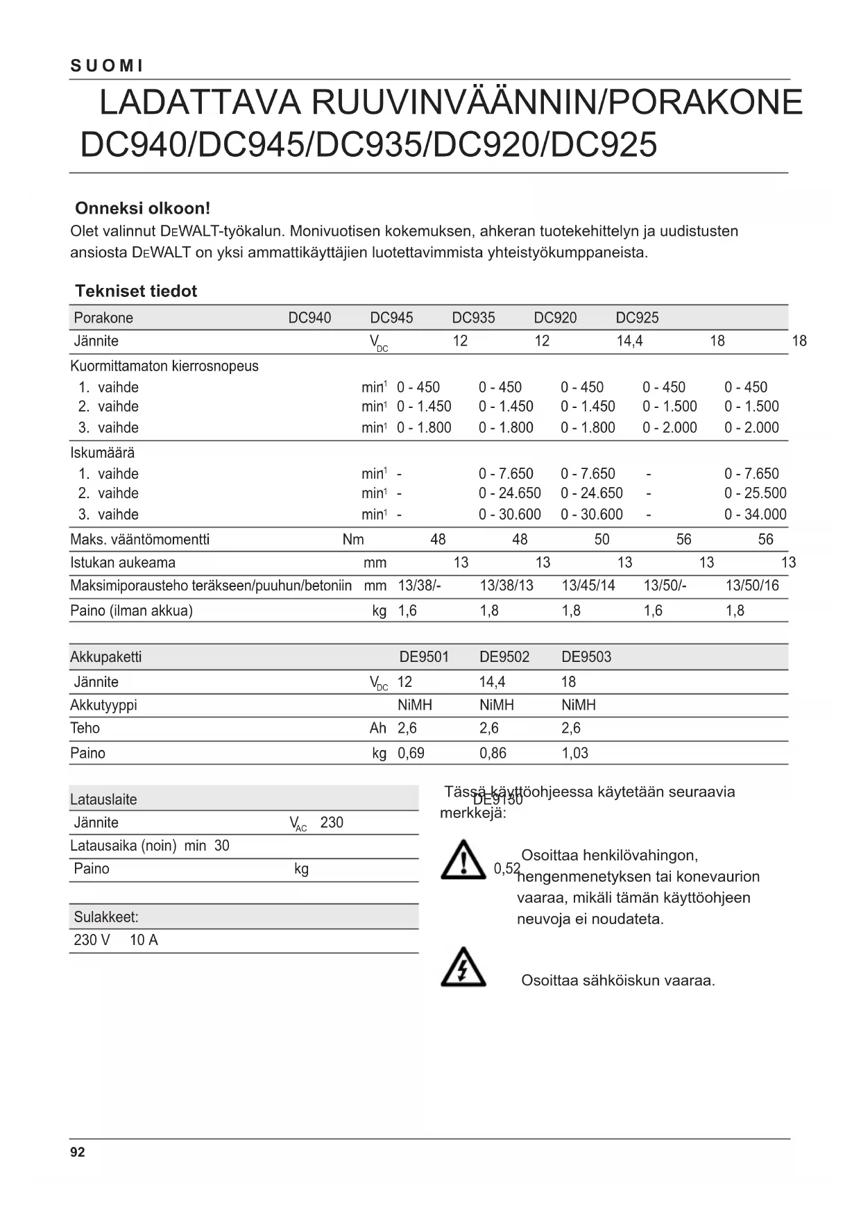 Älä missään tapauksessa polta akkupakettia Pakkauksen sisältö Pakkaus sisältää: 1 Ladattava porakone/ruuvinväännin 1 Sivukahva 1 Latauslaite 2 Akkua (KB-mallit) 1 Laukku 1 Käyttöohje 1 Hajoituskuva Huomaa: Akut ja laturit eivät sisälly N-malleihin. ● Tarkista etteivät kone, sen osat tai lisävarusteet ole vioittuneet kuljetuksen aikana. ● Lue tämä käyttöohje huolellisesti ennen koneen käyttöönottoa. Kuvaus (kuva A) Ladattavat ruuvinvääntimet/porakoneet DC940/ DC920 on tarkoitettu ammattimaiseen poraukseen ja ruuvaukseen. Ladattava ruuvinväännin/porakone DC945/DC935/ DC925 on tarkoitettu ammattimaiseen poraukseen ja ruuvaukseen. 1 Virrankatkaisija portaattomalla nopeudensäädöllä 2 Suunnanvaihtokytkin 3 Pikaistukka/automaattikaralukko 4 Toimintovalitsin/vääntömomentin säätö 5 Kauluksen asennot 6 Vaihdevalitsin 7 Teränpidin 8 Kahva 9 Sivukahva 10 Akkupaketti Latauslaite DE9130-latauslaitteessa käytetään D E WALTin NiMH- ja NiCd-akkuja, joiden teho on 7,2 - 18 V 1,3 - 2,6 Ah:ssa. 10 Akkupaketti 11 Vapautinpainikkeet 12 Latauslaite 13 Latausvalo (punainen) Automaattikaralukko Automaattikaralukkoa käytetään, kun kone on seisontatilassa. Istukan holkkia on helppo kääntää toisella kädellä toisen käden tukiessa laitetta. Sähköturvallisuus Laturi on suunniteltu käytettäväksi vain yhdellä jännitteellä. Tarkista aina, että virtalähde vastaa arvokilvessä ilmoitettua jännitettä. Laituris on kaksoiseristetty EN 60745 & EN 60335:n mukaisesti; siksi ei tarvita erillistä maadoitusta. Kaapelin tai pistotulpan vaihto Kun vaihdat kaapelin tai pistotulpan, hävitä se turvallisesti. Pistoke, jossa on paljaita johtimia, on vaarallinen kiinnitettynä jännitteiseen pistorasiaan. Asennus ja säädöt ● Poista akku koneesta aina ennen asennuksia ja säätöjä. ● Sammuta kone aina (off) ennen kuin poistat akkupaketin. Käytä ainoastaan D E WALT-akku ja -latauslaite.97 SUOMI Akkupaketti (kuva A & B) Akkujen lataaminen (kuva A) Kun akut ladataan ensimmäisen kerran tai pitkän varastoajan jälkeen, ne varautuvat vain noin 80 %:sti. Usean purkaus/latauskerran jälkeen akut latautuvat täyteen tehoonsa. Tarkista verkkokytkentä aina ennen kuin alat ladata akkuja. Jos sähköverkko antaa virtaa, mutta akut eivät lataudu, vie latauslaite valtuutettuun D E WALTin huoltopisteeseen. Latauksen aikana latauslaite ja akut voivat lämmetä, mikä on aivan normaalia. Älä lataa akkuja, mikäli ympäristön lämpötila on alle 4° C tai yli 40° C. Suositeltava latauslämpötila noin 24 °C. ● Laita akku (10) latausta varten latauslaitteeseen (12) kuten kuvassa on esitetty ja kytke latauslaite sähköverkkoon. Varmista, että akku on tukevasti paikallaan latauslaitteessa. Punainen latausvalo (13) vilkkuu. ● Kun lataus on päättynyt, latausvalo lakkaa vilkkumasta ja palaa yhtäjaksoisesti. Tällöin akku on täysin latautunut. ● Akkupaketti voidaan poistaa latauslaitteesta tai se voidaan jättää latauslaitteeseen pitkäksi ajaksi (enintään 14 päivän ajaksi). Akun irrottaminen ja kiinnittäminen ● Kiinnitä akku kahvaan kunnes se naksahtaa paikoilleen. ● Kun irrotat akun, paina kahta vapautinnappulaa (11) samanaikaisesti, ja irrota akku kahvasta. Akkukansi (kuva B) Suojakorkki piettää irrotetun akuston kontaktit. Jos suojakorkki ei ole paikallaan, irtonaiset metalliobjektit voivat aiheuttaa oikosulun kontakteihin. Tästä on seurauksena tulipalon vaara ja akuston vaurioituminen. ● Irrota suojakorkki (14) ennen kuin asetat akuston (10) laturiin. ● Aseta suojakorkki kontaktien päälle heti, kun olet irrottanut akuston laturista tai koneesta. Varmista, että suojakorkki on paikallaan ennen kuin säilytät tai kannat irrotetun akuston. Automaattinen säätö Automaattinen säätö tasoittaa akkupaketin erilliset solut huippukapasiteetilla. Akkupaketit on säädettävä yön yli 10 tunnin lataus-/purkujaksottain tai aina, kun akkupaketti ei enää toimita yhtä paljon virtaa kuin aikaisemmin. ● Akkupaketti viritetään asettamalla se laturiin normaalilla tavalla. Punainen valo vilkkuu yhtäjaksoisesti, mikä osoittaa latausjakson käynnistyneen. ● Kun latausjakso on valmis, valo palaa yhtäjaksoisesti eikä enää vilku. Akkupaketti on nyt ladattu täyteen ja on käyttövalmis. ● Jos paketti jätetään laturiin latauksen jälkeen, laturi siirtyy automaattisesti säätötilaan. Tämä tila on käytössä enintään 8 tunnin ajan. Akkupaketti voidaan irrottaa milloin tahansa säädön yhteydessä. Ylikuumentunut akku Kun laturi tunnistaa ylikuumentuneen akun, lataaminen siirtyy ajankohtaan, jolloin akku on jäähtynyt. Kun akku on jäähtynyt, laturi siirtyy automaattisesti latausvirtaan. Tämä ominaisuus takaa akun maksimikestoiän. Punainen valo (13) vilkkuu pitkään, sitten lyhyeen ylikuumentuneessa tilassa. Terän asentaminen ja irrottaminen (kuva A & C) ● Avaa istukka kiertämällä kaulusta (15) ja asenna teränvarsi paikalleen. ● Pane terä mahdollisimman syvälle istukkaan ja nosta sitä hieman ennen kiristystä. ● Kiristä istukka kääntämällä kaulusta myötäpäivään pitäen. ● Irrottaessasi terää toimi päinvastaisessa järjestyksessä. Toimintavaihtoehdon valinta ja vääntömomentin säätö (kuva D) Tämän työkalun kauluksessa on vääntömomentin säätömahdollisuutta ruuvauksen ja työkappaleen mukaan. Katso vääntömomentin säätöä kohdasta "Ruuvaus".98 SUOMI ● Valitse haluttu toimintatila tai vääntömomentti kohdistamalla kauluksen (4) symboli tai numero kuoren ilmaisimen (16) kanssa. DC945/DC935/DC925 Näissä työkaluissa on seuraavat toiminnot: