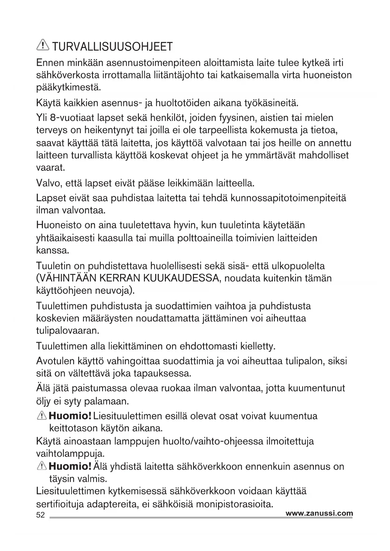 Kierrätä materiaalit, jotka on merkitty merkillä . Kierrätä pakkaus laittamalla se asianmukaiseen kierrätysastiaan. Suojele ympäristöä ja ihmisten terveyttä kierrättämällä sähkö- ja elektroniikkaromut. Älä hävitä merkillä merkittyjä kodinkoneita kotitalousjätteen mukana. Palauta tuote paikalliseen kierrätyskeskukseen tai ota yhteyttä paikalliseen viranomaiseen. KÄYTTÖ Tuuletin on tarkoitettu käytettäväksi joko imukupuversiona ulkoisella poistolla tai suodatinversiona sisäiseen kiertoon. ASENNUS Verkon jännitteen on oltava sama kuin tuulettimen sisäpuolella olevassa tyyppikilvessä ilmoitettu jännite. Jos laitteessa on pistoke, liitä tuuletin voimassaolevien normien mukaiseen pistorasiaan, joka sijaitsee sellaisessa paikassa, että siihen pääsee käsiksi myös asennuksen jälkeen. Jos laitteessa ei ole pistoketta (suora liitos verkkoon) tai pistoke ei ole sellaisessa paikassa että siihen pääsee käsiksi myös asennuksen jälkeen, käytä normien mukaista kaksinapaista katkaisijaa, jolla varmistetaan että laite saadaan kokonaan irti sähköverkosta, jos ylijännite kategoria on III, asennussääntöjen mukaisesti. Huomio!Tarkista aina, että verkkokaapeli on asennettu oikealla tavalla ennen kuin yhdistät tuulettimen sähköverkkoon ja tarkistat että se toimii oikein.54 www.zanussi.com Huomio! Riskien välttämiseksi virransyöttöjohdon voi vaihtaa ainoastaan valtuutettu tekninen tuki. Lieden keittotason tukipinnan ja keittiötuulettimen alimman osan välinen minimietäisyys on oltava vähintään 50cm sähköliesien osalta ja 65cm kaasu- ja sekaliesien osalta. Jos kaasulieden käyttöohjeissa vaaditaan suurempi etäisyys, on se otettava huomioon. HUOLTO Huomio! Irroita laite aina virtalähteestä ennen puhdistus- tai huoltotoimenpiteitä, irrota virtajohdon pistoke verkkovirtapistorasiasta tai katkaise virta kodin sähköverkosta. Tuuletin on puhdistettava usein sekä sisä- etttä ulkopuolelta (vähintään yhtä usein kuin rasvasuodattimien huolto). Käytä puhdistukseen neutraalissa nestemäisessä pesuaineessa kostutettua kangasta. Vältä hankaavia pesuaineita.