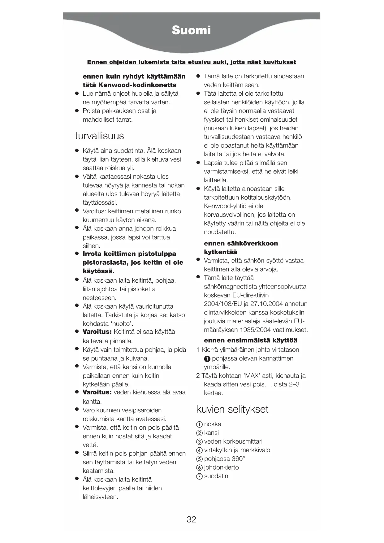 Tämä laite täyttää sähkömagneettista yhteensopivuutta koskevan EU-direktiivin 2004/108/EU ja 27.10.2004 annetun elintarvikkeiden kanssa kosketuksiin joutuvia materiaaleja säätelevän EU- määräyksen 1935/2004 vaatimukset. ennen ensimmäistä käyttöä 1 Kierrä ylimääräinen johto virtatason pohjassa olevan kannattimen ympärille. 2 Täytä kohtaan ’MAX’ asti, kiehauta ja kaada sitten vesi pois. Toista 2–3 kertaa. kuvien selitykset nokka kansi veden korkeusmittari virtakytkin ja merkkivalo pohjaosa 360° johdonkierto suodatin Suomi