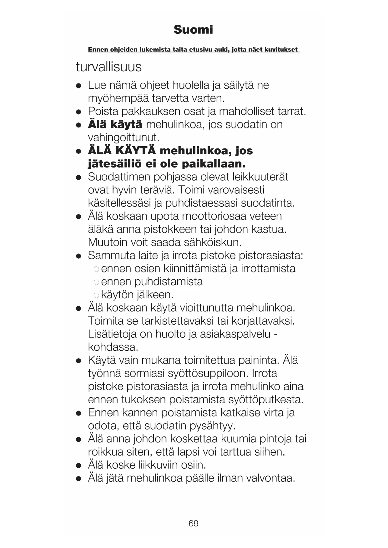nnen ohjeiden lukemista taita etusivu auki, jotta näet kuvitukset Suomi● Lapsia tulee pitää silmällä sen varmistamiseksi, että he eivät leiki laitteella.