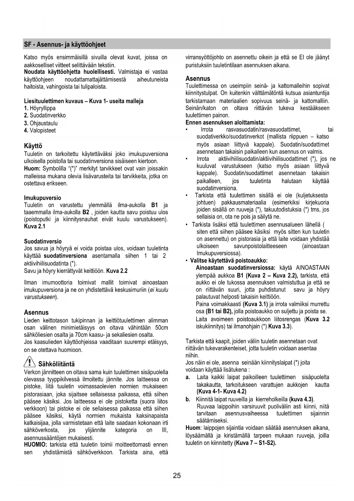 Käyttö Tuuletin on tarkoitettu käytettäväksi joko imukupuversiona ulkoisella poistolla tai suodatinversiona sisäiseen kiertoon. Huom: Symbolilla “(*)” merkityt tarvikkeet ovat vain joissakin malleissa mukana olevia lisävarusteita tai tarvikkeita, jotka on ostettava erikseen. Imukupuversio Tuuletin on varustettu ylemmällä ilma-aukolla B1 ja taaemmalla ilma-aukolla B2 , joiden kautta savu poistuu ulos (poistoputki ja kiinnitysnauhat eivät kuulu varustukseen). Kuva 2.1 Suodatinversio Jos savua ja höyryä ei voida poistaa ulos, voidaan tuuletinta käyttää suodatinversiona asentamalla siihen 1 tai 2 aktiivihiilisuodatinta (*). Savu ja höyry kierrättyvät keittiöön. Kuva 2.2 Ilman imumoottoria toimivat mallit toimivat ainoastaan imukupuversiona ja ne on yhdistettävä keskusimuriin (ei kuulu varustukseen). Asennus Lieden keittotason tukipinnan ja keittiötuulettimen alimman osan välinen minimietäisyys on oltava vähintään 50cm sähköliesien osalta ja 70cm kaasu- ja sekaliesien osalta. Jos kaasulieden käyttöohjeissa vaaditaan suurempi etäisyys, on se otettava huomioon. Sähköliitäntä Verkon jännitteen on oltava sama kuin tuulettimen sisäpuolella olevassa tyyppikilvessä ilmoitettu jännite. Jos laitteessa on pistoke, liitä tuuletin voimassaolevien normien mukaiseen pistorasiaan, joka sijaitsee sellaisessa paikassa, että siihen pääsee käsiksi. Jos laitteessa ei ole pistoketta (suora liitos verkkoon) tai pistoke ei ole sellaisessa paikassa että siihen pääsee käsiksi, käytä normien mukaista kaksinapaista katkaisijaa, jolla varmistetaan että laite saadaan kokonaan irti sähköverkosta, jos ylijännite kategoria on III, asennussääntöjen mukaisesti. HUOMIO: tarkista että tuuletin toimii moitteettomasti ennen sen yhdistämistä sähköverkkoon. Tarkista aina, että virransyöttöjohto on asennettu oikein ja että se EI ole jäänyt puristuksiin tuuletintilaan asennuksen aikana. Asennus Tuulettimessa on useimpiin seinä- ja kattomalleihin sopivat kiinnitystulpat. On kuitenkin välttämätöntä kutsua asiantuntija tarkistamaan materiaalien sopivuus seinä- ja kattomalliin. Seinän/katon on oltava riittävän tukeva kestääkseen tuulettimen painon. Ennen asennuksen aloittamista:
