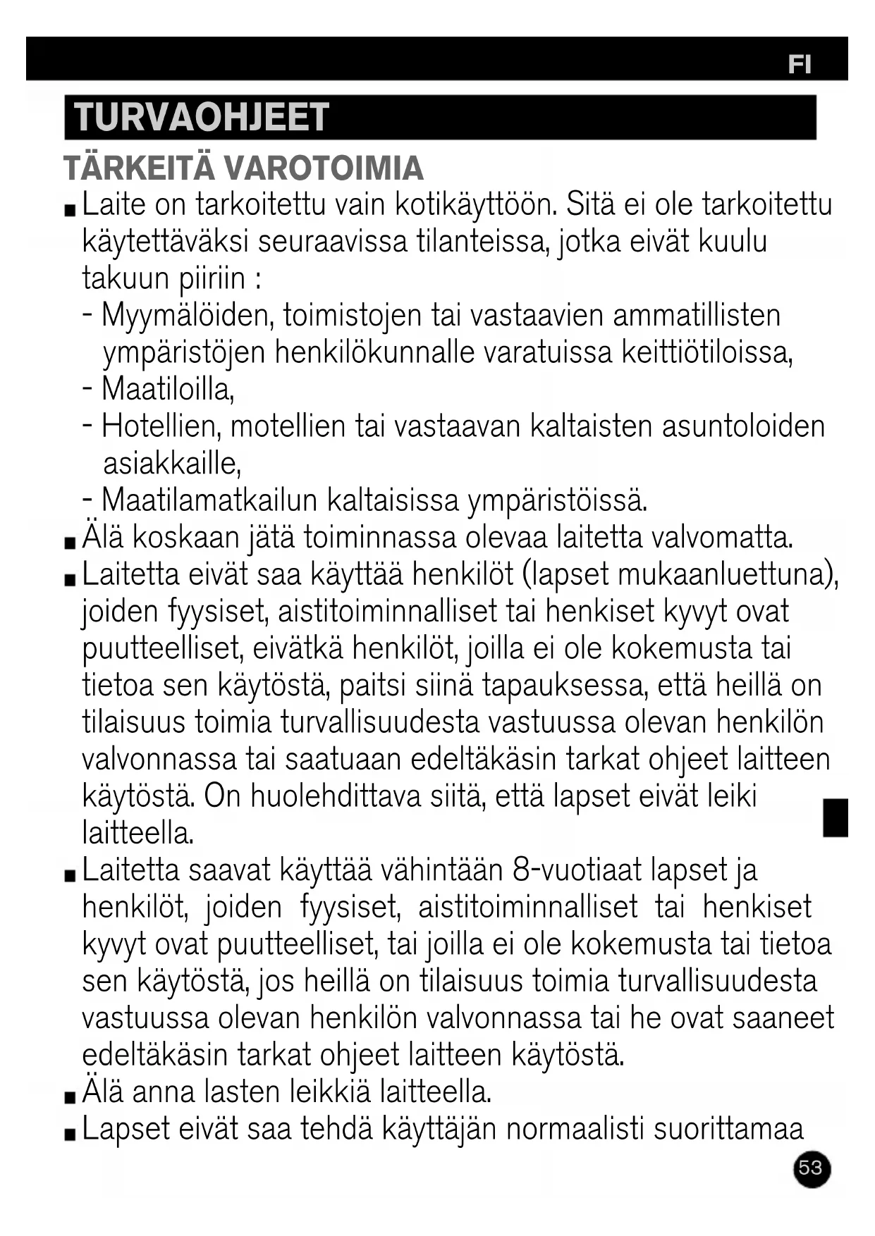 Laite on tarkoitettu vain kotikäyttöön. Sitä ei ole tarkoitettu käytettäväksi seuraavissa tilanteissa, jotka eivät kuulu takuun piiriin : - Myymälöiden, toimistojen tai vastaavien ammatillisten ympäristöjen henkilökunnalle varatuissa keittiötiloissa, - Maatiloilla, - Hotellien, motellien tai vastaavan kaltaisten asuntoloiden asiakkaille, - Maatilamatkailun kaltaisissa ympäristöissä. Älä koskaan jätä toiminnassa olevaa laitetta valvomatta. Laitetta eivät saa käyttää henkilöt (lapset mukaanluettuna), joiden fyysiset, aistitoiminnalliset tai henkiset kyvyt ovat puutteelliset, eivätkä henkilöt, joilla ei ole kokemusta tai tietoa sen käytöstä, paitsi siinä tapauksessa, että heillä on tilaisuus toimia turvallisuudesta vastuussa olevan henkilön valvonnassa tai saatuaan edeltäkäsin tarkat ohjeet laitteen käytöstä. On huolehdittava siitä, että lapset eivät leiki laitteella. Laitetta saavat käyttää vähintään 8-vuotiaat lapset ja henkilöt, joiden fyysiset, aistitoiminnalliset tai henkiset kyvyt ovat puutteelliset, tai joilla ei ole kokemusta tai tietoa sen käytöstä, jos heillä on tilaisuus toimia turvallisuudesta vastuussa olevan henkilön valvonnassa tai he ovat saaneet edeltäkäsin tarkat ohjeet laitteen käytöstä. Älä anna lasten leikkiä laitteella. Lapset eivät saa tehdä käyttäjän normaalisti suorittamaa TURVAOHJEET KRPS-GRILPLANCH-2100075680 19/02/13 11:41 Page5354