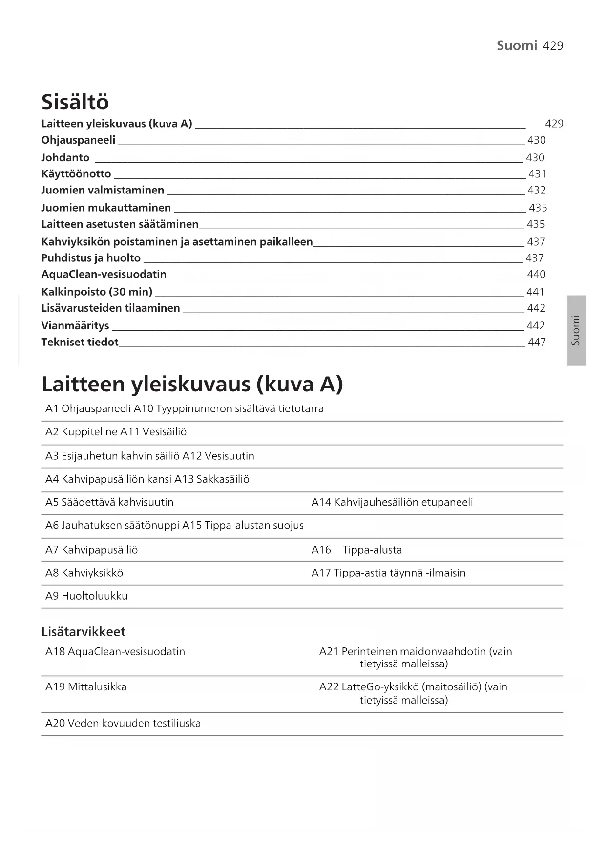 Suomi SuomiSuomi Sisältö Laitteen yleiskuvaus (kuva A) _____________________________________________________________ 429 Ohjauspaneeli ___________________________________________________________________________ 430Johdanto _______________________________________________________________________________ 430Käyttöönotto ____________________________________________________________________________ 431Juomien valmistaminen __________________________________________________________________ 432Juomien mukauttaminen _________________________________________________________________ 435Laitteen asetusten säätäminen____________________________________________________________ 435Kahviyksikön poistaminen ja asettaminen paikalleen_______________________________________ 437Puhdistus ja huolto ______________________________________________________________________ 437AquaClean-vesisuodatin _________________________________________________________________ 440Kalkinpoisto (30 min) ____________________________________________________________________ 441Lisävarusteiden tilaaminen _______________________________________________________________ 442Vianmääritys ____________________________________________________________________________ 442Tekniset tiedot___________________________________________________________________________ 447 Laitteen yleiskuvaus (kuva A) A1 Ohjauspaneeli A10 Tyyppinumeron sisältävä tietotarraA2 Kuppiteline A11 VesisäiliöA3 Esijauhetun kahvin säiliö A12 VesisuutinA4 Kahvipapusäiliön kansi A13 SakkasäiliöA5 Säädettävä kahvisuutin A14 Kahvijauhesäiliön etupaneeliA6 Jauhatuksen säätönuppi A15 Tippa-alustan suojusA7 Kahvipapusäiliö A16 Tippa-alustaA8 Kahviyksikkö A17 Tippa-astia täynnä -ilmaisinA9 Huoltoluukku Lisätarvikkeet A18 AquaClean-vesisuodatin A21 Perinteinen maidonvaahdotin (vaintietyissä malleissa)A19 Mittalusikka A22 LatteGo-yksikkö (maitosäiliö) (vaintietyissä malleissa)A20 Veden kovuuden testiliuska430 Suomi Ohjauspaneeli Tästä espressokeittimestä on saatavilla useita versioita, joissa on erilaiset ohjauspaneelit. Jokaisella versiolla on oma tyyppinumeronsa. Tyyppinumero on merkitty huoltoluukun sisäpuolella olevaan tietotarraan (kuva A9). Löydät tyyppinumeron myös napauttamalla Asetukset -kuvaketta ja valitsemalla Support (Tuki). Saat yleiskuvan kaikista painikkeista ja kuvakkeista kuvista C ja D. Löydät kuvauksen alta. Voit vierittää näytössä ylä- ja alanuolikuvakkeilla ja tehdä valintoja tai vahvistaa valinnat napauttamalla OK- kuvaketta. Kaikki tyypit (kuvat C/D/E) C1/D1/E1 Yhden kosketuksen juomakuvakkeet C3. Siirtymiskuvakkeet (ylös, alas, takaisin, OK) C6. Puhdistusvalikko C2. Käynnistys- painike C4. Näyttö C7. Henkilökohtaiset profiilit D2/E2 Valikko, jossa on muita juomia C5. Laitteen asetukset C8. Virtapainike Vain EP4327, EP4324 ja EP4321 (kuva C) C1 Yhden kosketuksen juomakuvakkeet: Espresso, Coffee, Americano, Caffé Crema, Ristretto, Hot Water ja Steam Vain EP4349, EP4346, EP4343 ja EP4341 (kuva D) D1 Yhden kosketuksen juomakuvakkeet: Espresso, Coffee, Americano, Cappuccino, Latte Macchiato, Café au lait Vain EP5447, EP5446, EP5444, EP5443, EP5441 ja EP5144 (kuva