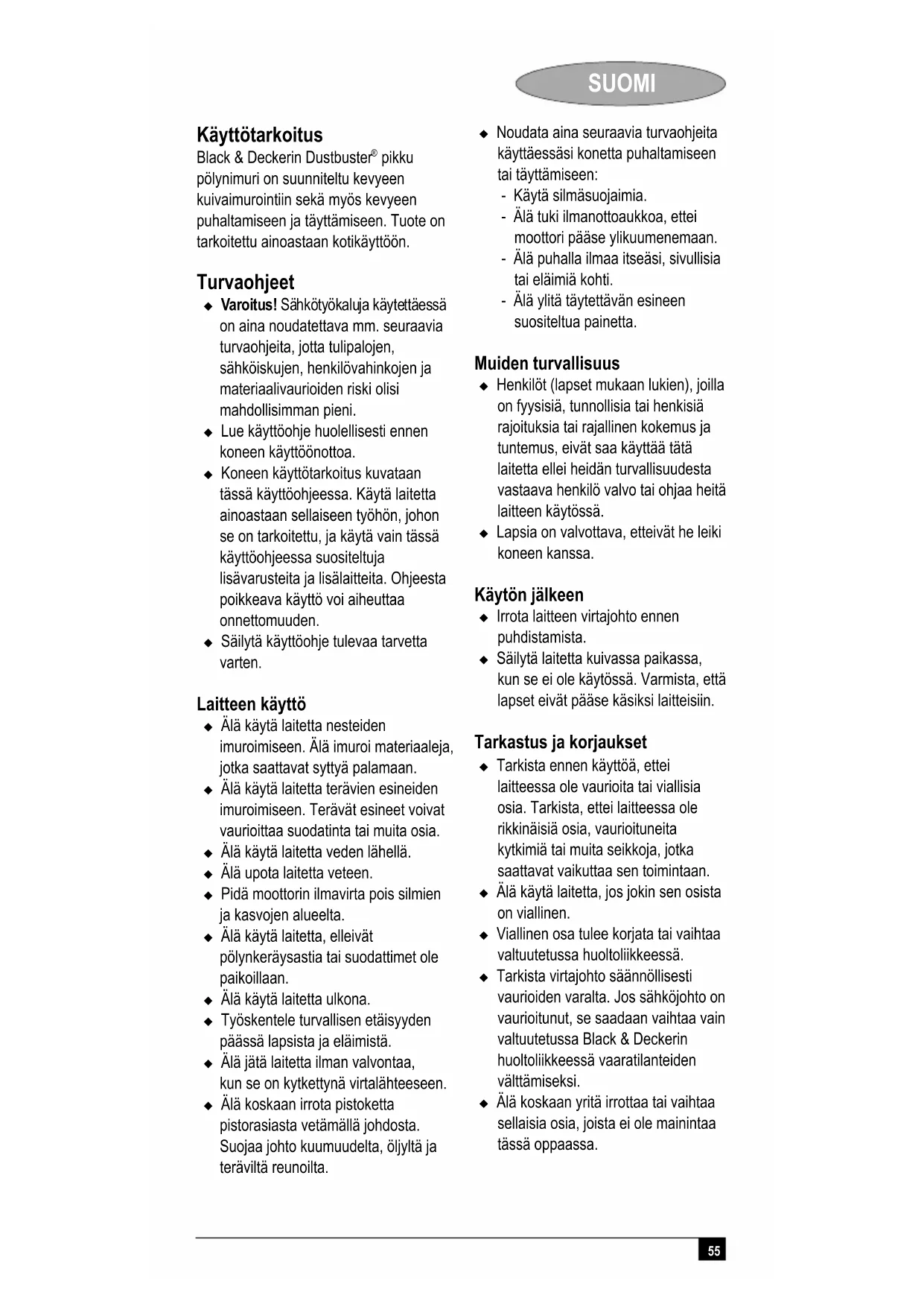 pikku pölynimuri on suunniteltu kevyeen kuivaimurointiin sekä myös kevyeen puhaltamiseen ja täyttämiseen. Tuote on tarkoitettu ainoastaan kotikäyttöön. Turvaohjeet Varoitus! Sähkötyökaluja käytettäessä on aina noudatettava mm. seuraavia turvaohjeita, jotta tulipalojen, sähköiskujen, henkilövahinkojen ja materiaalivaurioiden riski olisi mahdollisimman pieni. Lue käyttöohje huolellisesti ennen koneen käyttöönottoa. Koneen käyttötarkoitus kuvataan tässä käyttöohjeessa. Käytä laitetta ainoastaan sellaiseen työhön, johon se on tarkoitettu, ja käytä vain tässä käyttöohjeessa suositeltuja lisävarusteita ja lisälaitteita. Ohjeesta poikkeava käyttö voi aiheuttaa onnettomuuden. Säilytä käyttöohje tulevaa tarvetta varten. Laitteen käyttö Älä käytä laitetta nesteiden imuroimiseen. Älä imuroi materiaaleja, jotka saattavat syttyä palamaan. Älä käytä laitetta terävien esineiden imuroimiseen. Terävät esineet voivat vaurioittaa suodatinta tai muita osia. Älä käytä laitetta veden lähellä. Älä upota laitetta veteen. Pidä moottorin ilmavirta pois silmien ja kasvojen alueelta. Älä käytä laitetta, elleivät pölynkeräysastia tai suodattimet ole paikoillaan. Älä käytä laitetta ulkona. Työskentele turvallisen etäisyyden päässä lapsista ja eläimistä. Älä jätä laitetta ilman valvontaa, kun se on kytkettynä virtalähteeseen. Älä koskaan irrota pistoketta pistorasiasta vetämällä johdosta. Suojaa johto kuumuudelta, öljyltä ja teräviltä reunoilta. Noudata aina seuraavia turvaohjeita käyttäessäsi konetta puhaltamiseen tai täyttämiseen: - Käytä silmäsuojaimia. - Älä tuki ilmanottoaukkoa, ettei moottori pääse ylikuumenemaan. - Älä puhalla ilmaa itseäsi, sivullisia tai eläimiä kohti. - Älä ylitä täytettävän esineen suositeltua painetta. Muiden turvallisuus Henkilöt (lapset mukaan lukien), joilla on fyysisiä, tunnollisia tai henkisiä rajoituksia tai rajallinen kokemus ja tuntemus, eivät saa käyttää tätä laitetta ellei heidän turvallisuudesta vastaava henkilö valvo tai ohjaa heitä laitteen käytössä. Lapsia on valvottava, etteivät he leiki koneen kanssa. Käytön jälkeen Irrota laitteen virtajohto ennen puhdistamista. Säilytä laitetta kuivassa paikassa, kun se ei ole käytössä. Varmista, että lapset eivät pääse käsiksi laitteisiin. Tarkastus ja korjaukset Tarkista ennen käyttöä, ettei laitteessa ole vaurioita tai viallisia osia. Tarkista, ettei laitteessa ole rikkinäisiä osia, vaurioituneita kytkimiä tai muita seikkoja, jotka saattavat vaikuttaa sen toimintaan. Älä käytä laitetta, jos jokin sen osista on viallinen. Viallinen osa tulee korjata tai vaihtaa valtuutetussa huoltoliikkeessä. Tarkista virtajohto säännöllisesti vaurioiden varalta. Jos sähköjohto on vaurioitunut, se saadaan vaihtaa vain valtuutetussa Black & Deckerin huoltoliikkeessä vaaratilanteiden välttämiseksi. Älä koskaan yritä irrottaa tai vaihtaa sellaisia osia, joista ei ole mainintaa tässä oppaassa.56 SUOMI Sähköturvallisuus