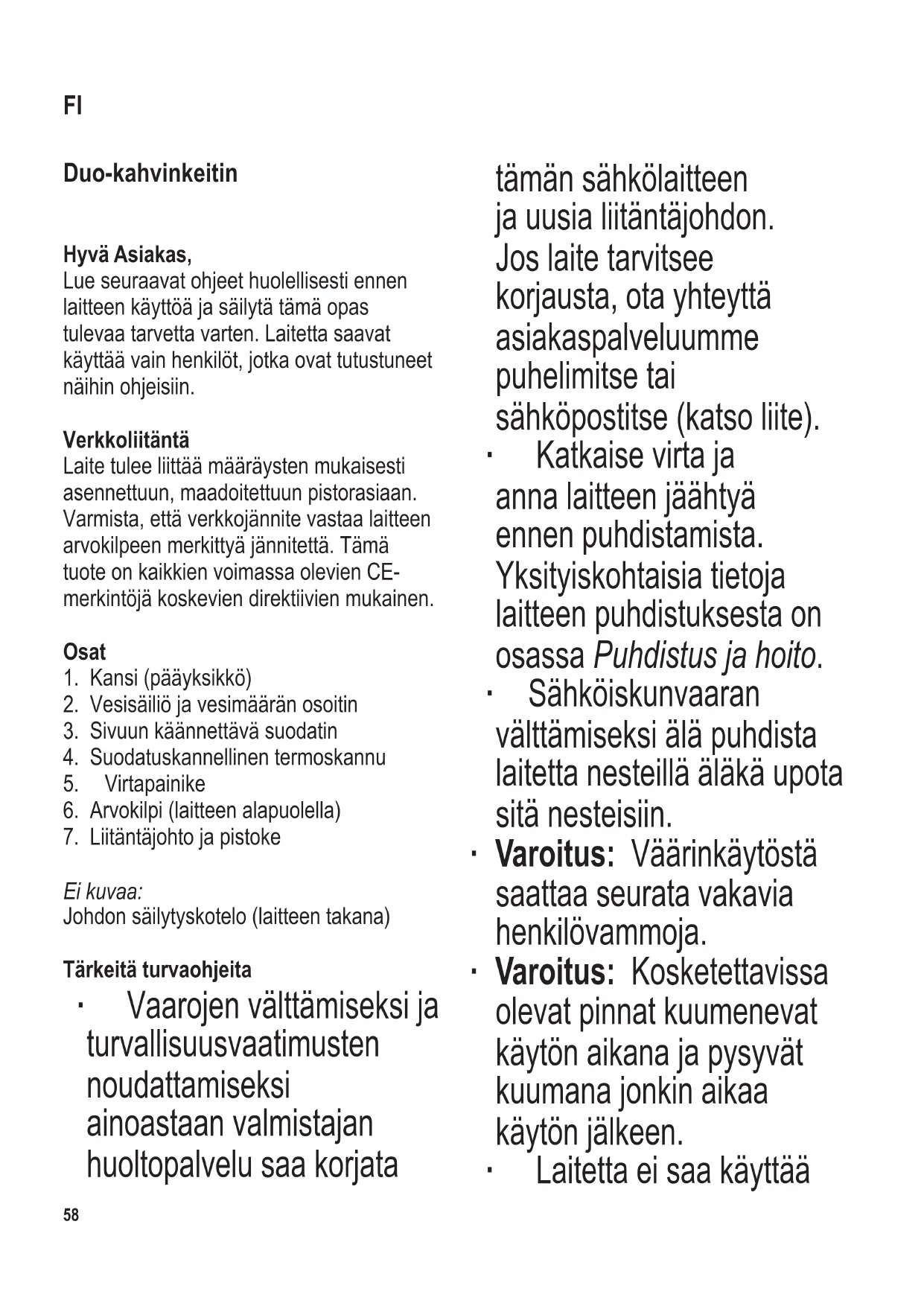 Suodatinkahvin valmistus Kahvia voi valmistaa yhdellä puolella tai molemmilla puolilla samanaikaisesti. ∙ Vesisäiliön täyttäminen: Avaa kansi. Kaada säiliöön tarvittava määrä kylmää vettä ja sulje kansi. ∙ Suodatinpaperin asettaminen: Avaa kääntyvä suodatin ja aseta suodatinpitimeen kokoa 4 oleva paperisuodatin. Taivuta ensin suodattimen rei’itettyjä sivuja alas. ∙ Kahvijauheen lisääminen: Suosittelemme hienon suodatinkahvin käyttämistä: n. 6 g = 1½–2 tlk keskikokoista kuppia (125 ml) kohti. ∙ Termoskannun valmistelu: Laske suodatinkansi kannun päälle. Kun kannu on oikein paikoillaan, kansi estää suodatinpitimen tippalukkomekanismin toiminnan kahvin valmistuksen aikana. Aseta kannu takaisin keittimeen. ∙ Kahvin valmistus: Työnnä pistotulppa sopivaan seinäpistorasiaan ja kytke kahvinkeittimeen virta virtapainikkeesta. Suodatusprosessi alkaa. ∙ Termoskannun poistaminen: Kun kaikki vesi on valunut suodatinsuppilon läpi kannuun, ota kannu pois keittimestä. Kierrä kantta kahvin kaatamiseksi vastapäivään puoli kierrosta niin, että kannessa oleva nuoli tulee kohdakkain kaatonokan kanssa. Kierrä kantta myötäpäivään kahvin tarjoilun jälkeen, kunnes kaksi nuolta on vastakkain. ∙ Kahvinkeittimestä katkeaa automaattisesti virta, kun kahvin valmistus päättyy. ∙ Kahvin valmistus keskeyttäminen: Voit keskeyttää kahvin valmistuksen katkaisemalla laitteesta virran virtapainikkeesta. ∙ Kahvinkeittimen kytkeminen pois toiminnasta: Irrota pistotulppa seinäpistorasiasta heti kun kahvin valmistus on päättynyt. Termoskannu ∙ Teknisistä syistä kierrekansi ei sulkeudu ilmatiiviisti. Pidä kannua sen vuoksi aina pystyasennossa. ∙ Kahvin pitäminen kuumana: Termoskannu kerää lämpöenergiaa. Sen vuoksi se olisi täytettävä täyteen. Jos kannu on vain osaksi täynnä, kahvi ei pysy yhtä lämpimänä. Kun huuhtelet kannun kuumalla vedellä ennen käyttöä, kahvi pysyy lämpimänä kauemmin. ∙ Kannun lasinen sisus on valmistettu kaksiseinämäisestä lasista. ∙ Kannun sisällä mahdollisesti näkyvät kuplat ja naarmut eivät vaikuta kannun käyttöön eivätkä kahvin lämpimänä pysymiseen. ∙ Seinämien väliin jäävä tyhjiö parantaa kannun eristysominaisuuksia. ∙ Jos lasi on vaurioitunut alla mainituista syistä, on olemassa vaara, että lasisisus voi särkyä. Tämä saattaa tapahtua vasta kauan lasisisuksen vaurioitumisen jälkeen. ∙ Älä sen vuoksi juo kannusta tai pane kättäsi sen sisälle.62 104 x 142 mm Jotta lasisisus ei särkyisi: ∙ Vältä iskuja ja suuria lämpötilaeroja. ∙ Älä sekoita kannussa olevaa nestettä metallisilla eikä muilla kovilla esineillä, kuten metallilusikalla. ∙ Älä käytä kovia harjoja tai hankaavia pesuaineita. ∙ Älä pyyhi kannun sisusta kankaalla. Pölyhiukkaset voivat leikata lasia (kuin lasiveitsi). ∙ Älä pese astianpesukoneessa. ∙ Älä käytä mikroaaltouunissa. Kalkinpoisto ∙ Kaikista kuumaa vettä käyttävistä kodinkoneista on aika ajoin poistettava kalkkisaostumat, jottei laitteen toiminta kärsi. Toimenpiteen toistotiheys riippuu veden laadusta (kalkkipitoisuus), sekä siitä, kuinka usein laitetta käytetään. ∙ Jos suodatusjakso pitenee, säiliöön jää vettä tai kahvinkeitin alkaa toimia äänekkäästi, täytyy suorittaa kalkinpoisto. ∙ Kovin paksuja kalkkisaostumia on erittäin vaikea poistaa voimakkaillakin aineilla. Kalkki voi aiheuttaa myös keittimen vuotamista. Valmistaja suosittelee, että kalkkisaostumien poisto suoritetaan aina 30-40 suodatusjakson välein. ∙ Kaikki takuuvaatimukset mitätöityvät, jos laitteen vika johtuu riittämättömästä kalkinpoistosta. ∙ Keittimen valmistaja suosittelee kalkinpoistoon etikkaa. ∙ Sekoita 80 ml etikkaesanssia annettuun maksimimäärään kylmää vettä. ∙ Kaada tätä seosta kumpaankin vesisäiliöön. Aseta paperisuodatin suodatinsuppiloon (ilman kahvijauhetta) ja toimi kohdan Suodatinkahvin valmistus mukaan. Toista tarvittaessa. Huolehdi tuuletuksesta kalkinpoiston aikana, älä hengitä etikkahöyryä. ∙ Kytke pois päältä noin 2-3 minuutin kuluttua ja anna kalkinpoistoaineen vaikuttaa 10 minuutin ajan, kytke sitten takaisin päälle. ∙ Puhdistat laitteen kummankin puolen kalkinpoiston jälkeen suodattamalla niiden läpi 2-3 säiliöllistä kylmää raikasta vettä (ilman kahvijauhetta). ∙ Älä kaada kalkinpoistoainetta emaloituun pesualtaaseen. Puhdistus ja hoito ∙ Irrota pistotulppa pistorasiasta ja anna keittimen jäähtyä ennen puhdistamista. ∙ Sähköiskun välttämiseksi älä koskaan upota kahvinkeitintä veteen. Pyyhi se puhtaalla kostealla liinalla ja tilkalla pesuainetta. Kuivaa hyvin sen jälkeen. ∙ Älä käytä hankaavia puhdistusaineita. ∙ Ota paperisuodatin pois ja puhdista suodatinsuppilo lämpimällä pesuainevedellä.104 x 142 mm