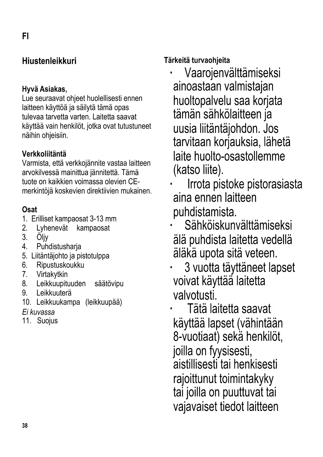 Tärkeitä turvaohjeita ∙ Vaarojen välttämiseksi ainoastaan valmistajan huoltopalvelu saa korjata tämän sähkölaitteen ja uusia liitäntäjohdon. Jos tarvitaan korjauksia, lähetä laite huolto-osastollemme (katso liite). ∙ Irrota pistoke pistorasiasta aina ennen laitteen puhdistamista. ∙ Sähköiskun välttämiseksi älä puhdista laitetta vedellä äläkä upota sitä veteen. ∙ 3 vuotta täyttäneet lapset voivat käyttää laitetta valvotusti. ∙ Tätä laitetta saavat käyttää lapset (vähintään 8-vuotiaat) sekä henkilöt, joilla on fyysisesti, aistillisesti tai henkisesti rajoittunut toimintakyky tai joilla on puuttuvat tai vajavaiset tiedot laitteen FI39 toiminnasta, mikäli heitä valvotaan tai ohjataan laitteen käytössä ja he ymmärtävät täysin kaikki käyttöön liittyvät vaarat ja turvatoimenpiteet. ∙ Lasten ei saa antaa leikkiä laitteella. ∙ Lapset eivät saa puhdistaa laitetta eivätkä ehdä siihen huoltoja ilman valvontaa. ∙ Laite ja sen liitäntäjohto täytyy aina pitää alle 3-vuotiaiden ulottumattomissa. ∙ Varoitus: Pidä lapset poissa pakkausmateriaalien luota potentiaalisen vaaratilanteen esim. tukehtumisvaaran vuoksi. ∙ Varoitus: Älä käytä laitetta kylpyammeen tai vedellä täytetyn pesualtaan tai muun vedellä täytetyn astian lähellä. ∙ Varoitus: Suojaa laitetta kosteudelta ja vesiroiskeilta äläkä käytä sitä, jos kätesi ovat märät. ∙ Jos laitetta käytetään kylpyhuoneessa, veden läsnäolo luo vaaran, vaikka laitteen virta olisi kytkettynä pois. Kytke sen vuoksi pistotulppa aina irti seinäpistorasiasta käytön jälkeen. Lisäturvallisuutta saa asentamalla kodin sähköjärjestelmään vikavirtasuojakytkimen, jonka esiasetettu laukaisuvirta ei ylitä 30 mA. Käänny sähköalan ammattilaisen puoleen. ∙ Ennen käyttöä laite ja mahdolliset lisäosat tulee tarkistaa perusteellisesti vaurioiden varalta. Jos laite putoaa kovalle alustalle, sitä ei saa enää käyttää: näkymättömätkin vauriot voivat aiheuttaa vaaratilanteita laitetta käytettäessä. ∙ Katkaise virta laitteesta aina käytön jälkeen ja irrota pistotulppa pistorasiasta. Tee samoin, - jos laitteessa on toimintahäiriö - ennen kuin puhdistat laitteen ∙ Kun irrotat pistotulpan pistorasiasta, älä vedä liitäntäjohdosta; tartu aina pistotulppaan. ∙ Varoitus: Leikkuuterä on erittäin terävä; loukkaantumisten välttämiseksi varmista käytön aikana aina, ettei terä kosketa ihoa. ∙ Älä jätä laitetta toimintaan ilman valvontaa. ∙ Valmistaja ei vastaa mahdollisista vaurioista, jos ne johtuvat laitteen väärinkäytöstä tai käyttöohjeiden laiminlyömisestä. ∙ Älä käytä laitetta lemmikkieläimiin tai muihin eläimiin.40 Käyttö Leikkuupituuden hienosäätö Leikkurin sivussa sijaitsevan säätövivun avulla leikkuupituus voidaan hienosäätää noin 1 millimetristä 1,6 millimetriin (myös leikkuun aikana). Leikkauspäät Leikkurin mukana toimitettavat erilliset kampaosat lisäävät leikkuupituuden vaihtoehtoja. Kiinnitä leikkauspää leikkuukampaan painamalla sitä tiukasti alas, kunnes kuulet sen lukkiutuvan paikalleen. Käytön jälkeen irrota leikkauspää takapuolelta ja nosta pois. Leikkauspäät 3-13 mm Nämä leikkauspäät mahdollistavat leikkauspituudet 3, 6, 9 ja 13 mm. Lyhenevät leikkauspäät Lyhenevät leikkauspäät on suunniteltu hiusten leikkuuseen niin, että vältetään ”portaittainen” vaikutelma. Tälla tavoin korvien yläpuolella olevat hiukset leikataan lyhyemmiksi kun taas ne jäävät pidemmiksi päälakea kohti. Toiminta ∙ Hiusten tulee olla puhtaat ja huolellisesti kammatut ennen leikkaamista. ∙ Käytä erillistä kampaosaa tai tavallista kampaa pitemmille hiuksille. ∙ Aloita aina suurimmalla leikkuukammalla, siten saat tuntuman haluttuun pituuteen leikkaamiseen. ∙ Leikatessasi hiuksia lyhyemmiksi jatka pienemmillä leikkuukammoilla tai kokonaan ilman kampaosaa. ∙ Kytke pistotulppa seinäpistorasiaan ja kytke laitteeseen virta. ∙ Leikkaa alhaalta ylöspäin ja pidä leikkuukampa päätä vasten. Ohjaa leikkuria ylöspäin hiusten läpi ja siirrä sitä samalla vähitellen päästä poispäin. ∙ Lyhenevät leikkauspäät on suunniteltu hiusten leikkuuseen korvien ympäriltä niin, että vältetään “portaittainen” vaikutelma. Pään oikeaa puolta varten on käytettävä lisäosaa, johon on merkitty ”Right Taper” (oikea kaventuva); ja toiselle puolelle on lisäosaa, johon on merkitty ”Left Taper” (vasen kaventuva). Aloita leikkuu pään takaa ja leikkaa hiuksia luonnollista kasvusuuntaa vasten ohimoita kohti. ∙ Jos haluat muotoilla leikkauksen, käännä leikkuri ja lyhennä hiuksia ylhäältä alaspäin ilman kampaosaa. ∙ Katkaise laitteesta virta aina käytön jälkeen ja irrota pistotulppa pistorasiasta.41 Laitteen puhdistus ja huolto ∙ Muista ehdottomasti katkaista laitteesta virta ja irrottaa pistotulppa pistorasiasta ennen puhdistusta ja öljyämistä. ∙ Sähköiskun vaaran välttämiseksi laitetta ei saa upottaa nesteeseen tai eikä päästää kosketuksiin nesteiden kanssa. ∙ Älä käytä puhdistukseen hankausaineita tai vahvoja liuoksia. ∙ Jos puhdistus on tarpeen, laitteen voi pyyhkiä kuivalla, nukkaantumattomalla rievulla. Leikkuukampa ja leikkuuterä ∙ Poista hiukset leikkuukamman ja leikkuuterän välistä puhdistusharjalla aina käytön jälkeen. ∙ Puhdistuksen jälkeen (ja jos leikkuria on käytetty n. 20 minuutin ajan) laita muutama tippa hapotonta öljyä leikkuukamman ja leikkuuterän väliin, käynnistä laite hetkeksi ja anna öljyn levitä hyvin ja tasaisesti. Säännöllinen öljyäminen takaa hyvän leikkaustuloksen ja laitteen kestävyyden pitkäksi aikaa. ∙ Suojaa leikkuukampa suojuksella käytön jälkeen. Jätehuolto Tällä symbolilla merkityt laitteet täytyy hävittää kotitalousjätteestä erillään, sillä ne sisältävät arvokkaita kierrätyskelpoisia materiaaleja. Asianmukaisella hävittämisell