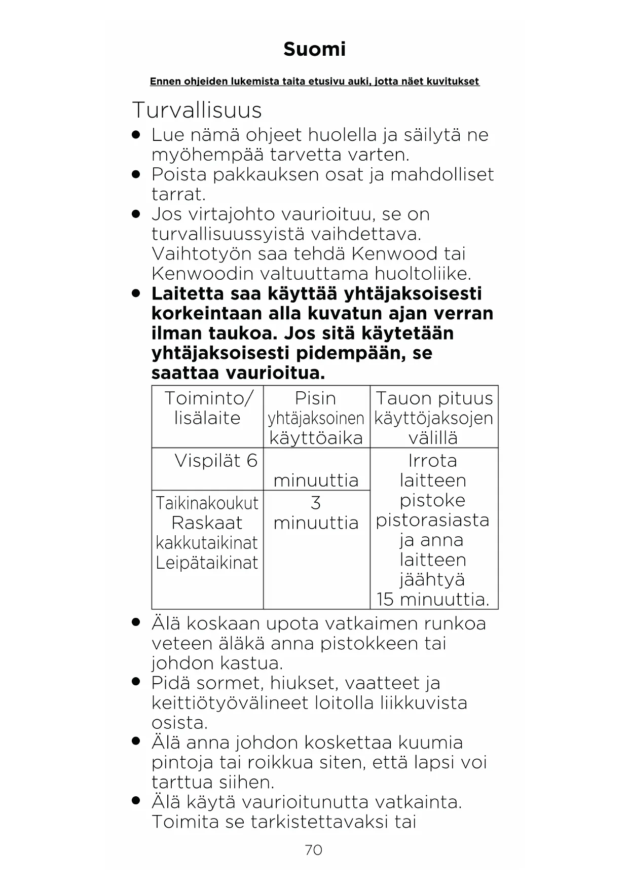 Laitetta saa käyttää yhtäjaksoisesti korkeintaan alla kuvatun ajan verran ilman taukoa. Jos sitä käytetään yhtäjaksoisesti pidempään, se saattaa vaurioitua. Toiminto/ lisälaite Pisin yhtäjaksoinen käyttöaika Tauon pituus käyttöjaksojen välillä Vispilät 6 minuuttia Irrota laitteen pistoke pistorasiasta ja anna laitteen jäähtyä 15 minuuttia. Taikinakoukut Raskaat kakkutaikinat Leipätaikinat