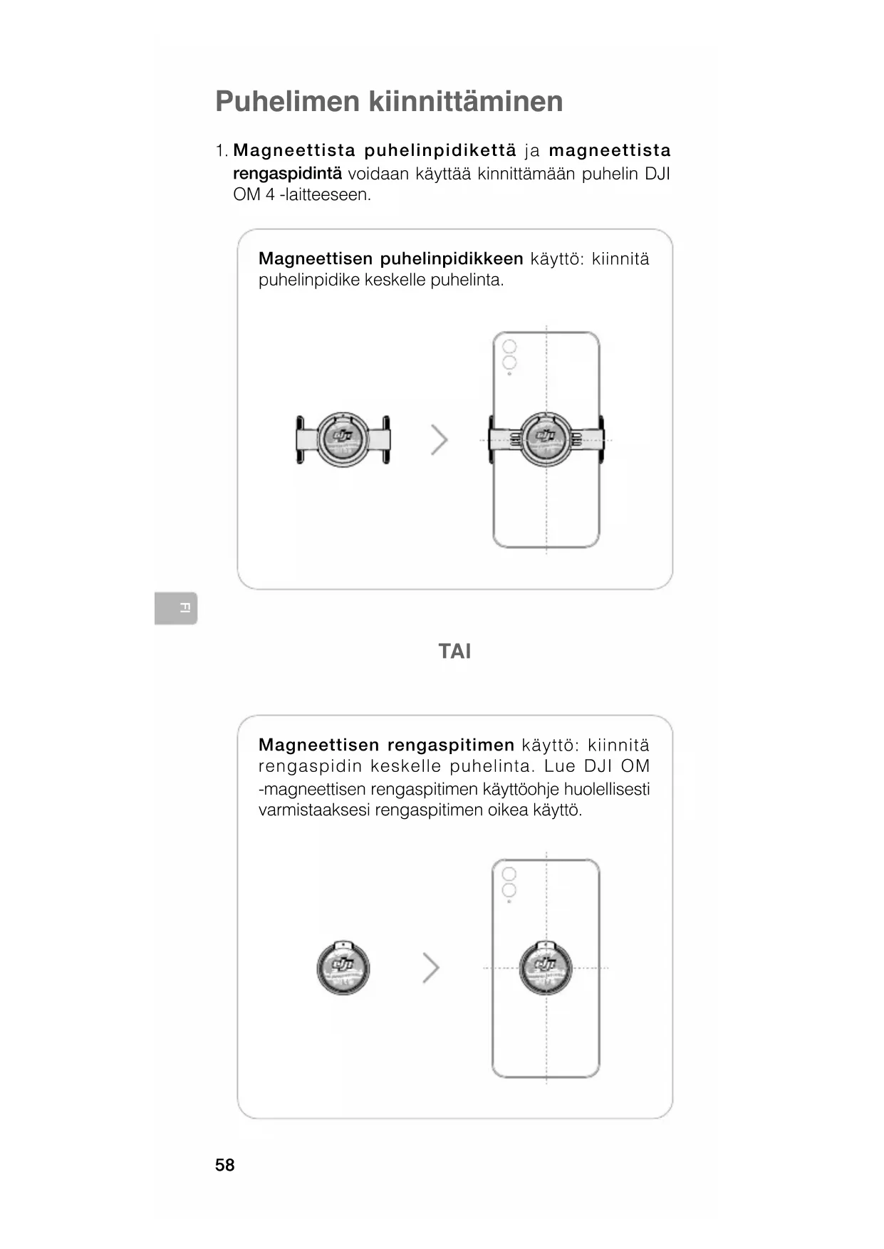 magneettista rengaspidintä voidaan käyttää kinnittämään puhelin DJI OM 4 -laitteeseen. Magneettisen rengaspitimen käyttö: kiinnitä rengaspidin keskelle puhelinta. Lue DJI OM -magneettisen rengaspitimen käyttöohje huolellisesti varmistaaksesi rengaspitimen oikea käyttö. TAI59