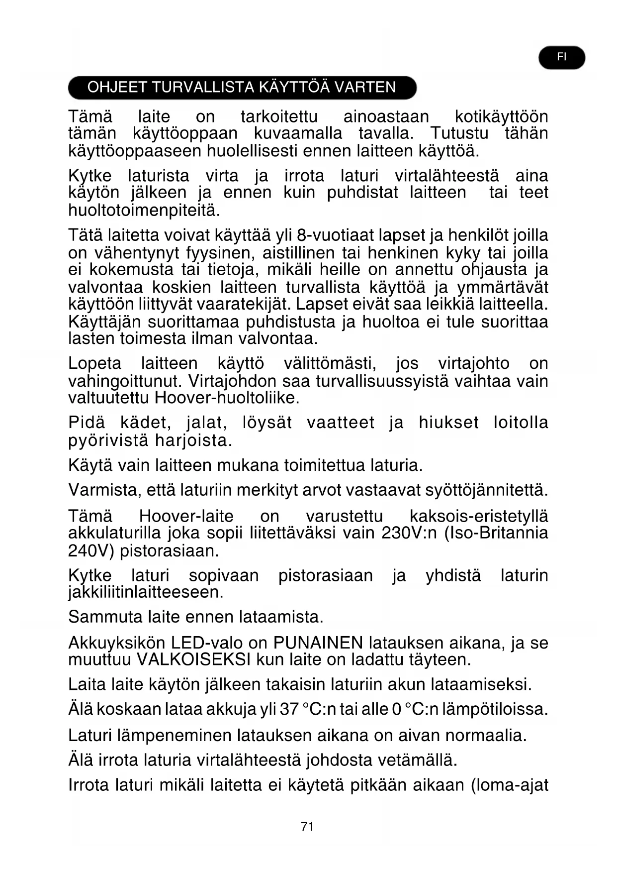 Tämä laite on tarkoitettu ainoastaan kotikäyttöön tämän käyttöoppaan kuvaamalla tavalla. Tutustu tähän käyttöoppaaseen huolellisesti ennen laitteen käyttöä. Kytke laturista virta ja irrota laturi virtalähteestä aina käytön jälkeen ja ennen kuin puhdistat laitteen tai teet huoltotoimenpiteitä. Tätä laitetta voivat käyttää yli 8-vuotiaat lapset ja henkilöt joilla on vähentynyt fyysinen, aistillinen tai henkinen kyky tai joilla ei kokemusta tai tietoja, mikäli heille on annettu ohjausta ja valvontaa koskien laitteen turvallista käyttöä ja ymmärtävät käyttöön liittyvät vaaratekijät. Lapset eivät saa leikkiä laitteella. Käyttäjän suorittamaa puhdistusta ja huoltoa ei tule suorittaa lasten toimesta ilman valvontaa. Lopeta laitteen käyttö välittömästi, jos virtajohto on vahingoittunut. Virtajohdon saa turvallisuussyistä vaihtaa vain valtuutettu Hoover-huoltoliike. Pidä kädet, jalat, löysät vaatteet ja hiukset loitolla pyörivistä harjoista. Käytä vain laitteen mukana toimitettua laturia. Varmista, että laturiin merkityt arvot vastaavat syöttöjännitettä. Tämä Hoover-laite on varustettu kaksois-eristetyllä akkulaturilla joka sopii liitettäväksi vain 230V:n (Iso-Britannia 240V) pistorasiaan. Kytke laturi sopivaan pistorasiaan ja yhdistä laturin jakkiliitinlaitteeseen. Sammuta laite ennen lataamista. Akkuyksikön LED-valo on PUNAINEN latauksen aikana, ja se muuttuu VALKOISEKSI kun laite on ladattu täyteen. Laita laite käytön jälkeen takaisin laturiin akun lataamiseksi. Älä koskaan lataa akkuja yli 37 °C:n tai alle 0 °C:n lämpötiloissa. Laturi lämpeneminen latauksen aikana on aivan normaalia. Älä irrota laturia virtalähteestä johdosta vetämällä. Irrota laturi mikäli laitetta ei käytetä pitkään aikaan (loma-ajat FI72 jne.). Lataa laite uudelleen ennen käyttöä koska akut voivat purkaa varausta pitkien säilytysjaksojen aikana. Jos laite hävitetään, akut on ensin poistettava. Laitteen täytyy olla irti verkkovirrasta akkua vaihdettaessa. Hävitä akut turvallisesti. Käytä laitetta kunnes se pysähtyy, jotta akut tyhjentyvät kokonaan. Vie käytetyt akut kierrätyskeskukseen. Älä hävitä niitä kotitalousjätteen mukana. Irrottaaksesi akut ota yhteyttä valtuutettuun Hoover huoltoliikkeeseen tai noudata seuraavia ohjeita. TÄRKEÄÄ: Tyhjennä paristot aina kokonaan ennen niiden poistamista. Käytä imuria kunnes akut ovat täysin tyhjät. Irrota laturin liitin laitteesta. Paina akkuyksikön vapautuspainikkeita ja irrota liu´uttamalla. Huomaa: Jos sinulla on vaikeuksia purkaa laitetta tai tarvitset yksityiskohtaisempaa tietoa laitteen jälkikäsittelystä, talteenotosta ja kierrätyksestä, ota yhteyttä paikallisiin kierrätysviranomaisiin tai kotitalouksien jätehuoltoon. Käytä ainoastaan Hooverin toimittamia tai suosittelemia kiinnityskappaleita, lisävarusteita tai varaosia. Staattinen sähkö: jotkin matot voivat aiheuttaa vähäisen määrän staattista sähköä. Staattisen sähkön purkaus ei ole vaarallista terveydelle. Älä käytä laitettasi ulkona tai märällä alustalla. Älä imuroi nesteitä. Älä imuroi kovia tai teräviä esineitä, tulitikkuja, kuumaa tuhkaa, tupakantumppeja tai muita vastaavia esineitä. Älä ruiskuta laitteelle tai imuroi laitteella syttyviä nesteitä, puhdistusnesteitä, aerosoleja tai näiden höyryjä. Älä aja laitteella verkkojohdon yli tai irrota pistoketta virtalähteestä johdosta vetämällä. Älä käytä laitetta tai laturia, jos se vaikuttaa vialliselta. Hoover-huolto: Laitteen käyttöturvallisuuden ja tehokkaan toiminnan varmistamiseksi huolto ja korjaukset kannattaa teettää valtuutetussa Hoover-huollossa. Älä käytä laitetta ihmisten tai eläinten puhdistamiseen. FITUOTTEEN OSAT