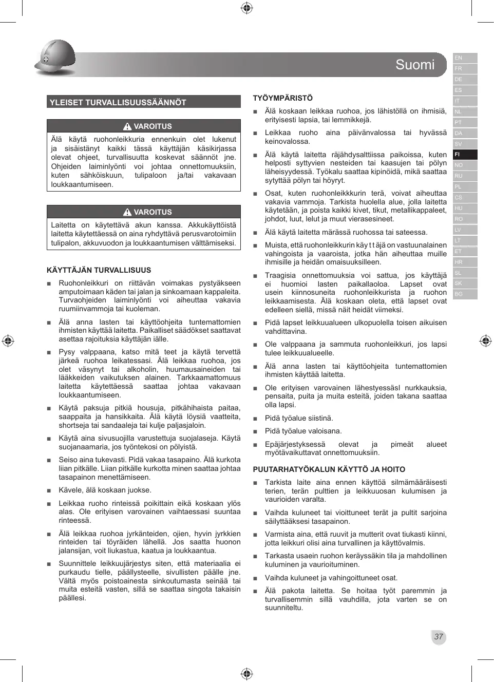 EN FR DE ES YLEISET TURVALLISUUSSÄÄNNÖT VAROITUS Älä käytä ruohonleikkuria ennenkuin olet lukenut ja sisäistänyt kaikki tässä käyttäjän käsikirjassa olevat ohjeet, turvallisuutta koskevat säännöt jne. Ohjeiden laiminlyönti voi johtaa onnettomuuksiin, kuten sähköiskuun, tulipaloon ja/tai vakavaan loukkaantumiseen.