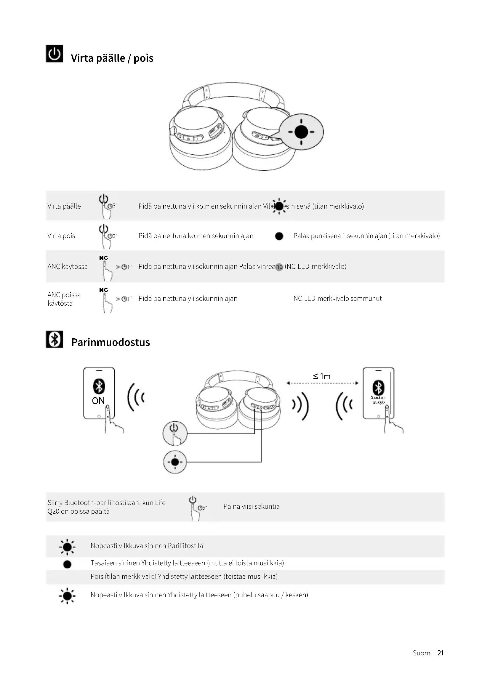≤ 1m Soundcore Life Q20 Siirry Bluetooth-pariliitostilaan, kun Life Q20 on poissa päältä