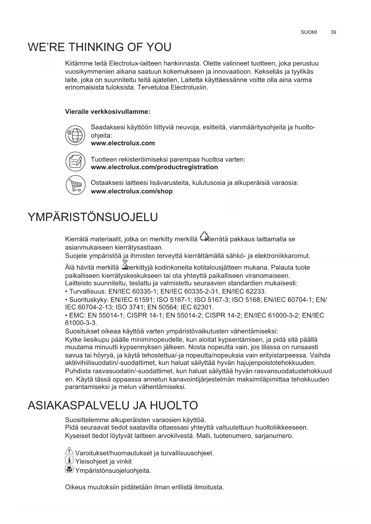 Suosittelemme alkuperäisten varaosien käyttöä. Pidä seuraavat tiedot saatavilla ottaessasi yhteyttä valtuutettuun huoltoliikkeeseen. Kyseiset tiedot löytyvät laitteen arvokilvestä. Malli, tuotenumero, sarjanumero. Varoitukset/huomautukset ja turvallisuusohjeet. Yleisohjeet ja vinkit Ympäristönsuojeluohjeita. Oikeus muutoksiin pidätetään ilman erillistä ilmoitusta. FI KÄYTTÖOHJEETwww.electrolux.com