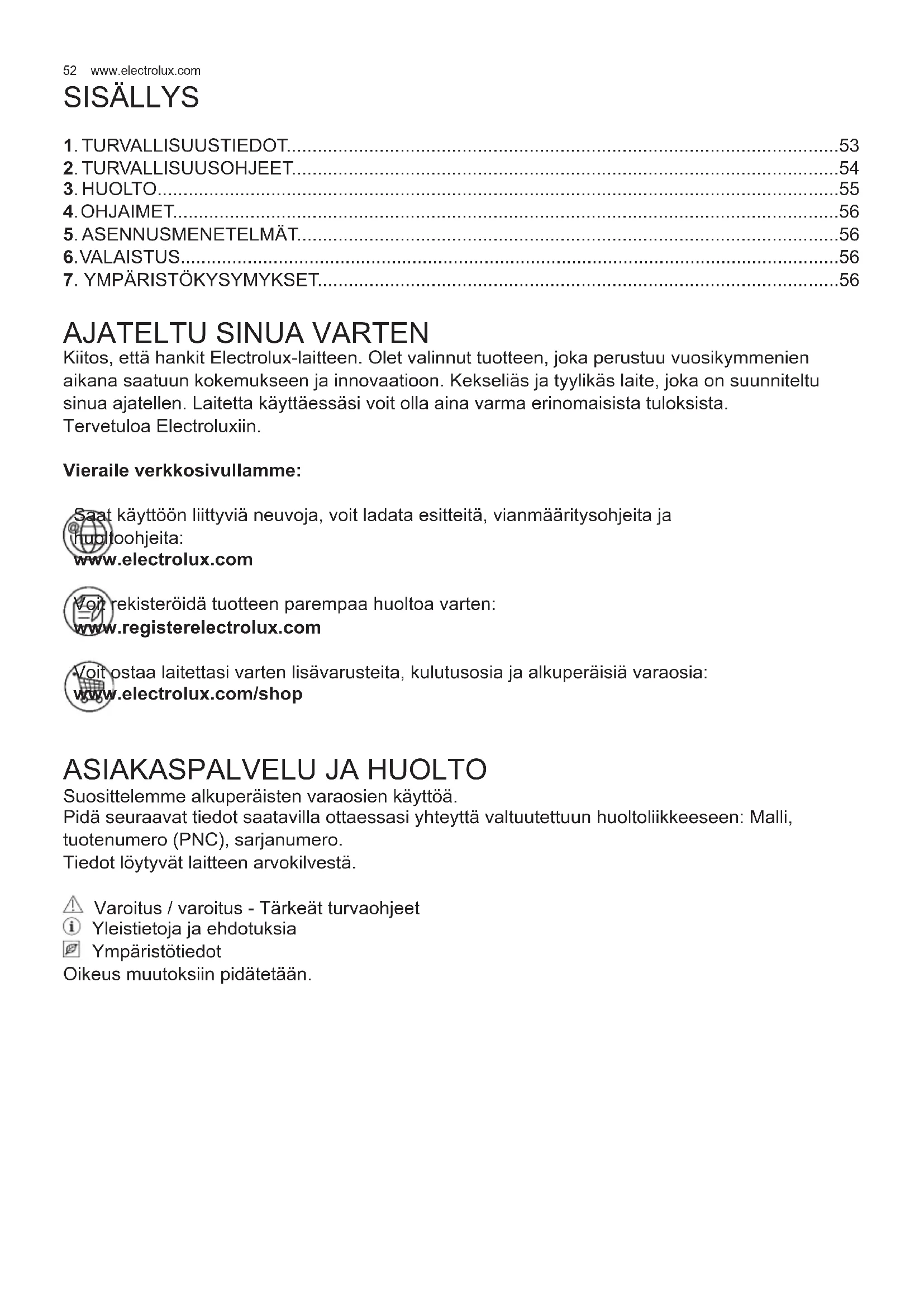 Kiitos, että hankit Electrolux-laitteen. Olet valinnut tuotteen, joka perustuu vuosikymmenien aikana saatuun kokemukseen ja innovaatioon. Kekseliäs ja tyylikäs laite, joka on suunniteltu sinua ajatellen. Laitetta käyttäessäsi voit olla aina varma erinomaisista tuloksista. Tervetuloa Electroluxiin. Vieraile verkkosivullamme: Saat käyttöön liittyviä neuvoja, voit ladata esitteitä, vianmääritysohjeita ja huoltoohjeita: www.electrolux.com Voit rekisteröidä tuotteen parempaa huoltoa varten: www.registerelectrolux.com Voit ostaa laitettasi varten lisävarusteita, kulutusosia ja alkuperäisiä varaosia: www.electrolux.com/shop