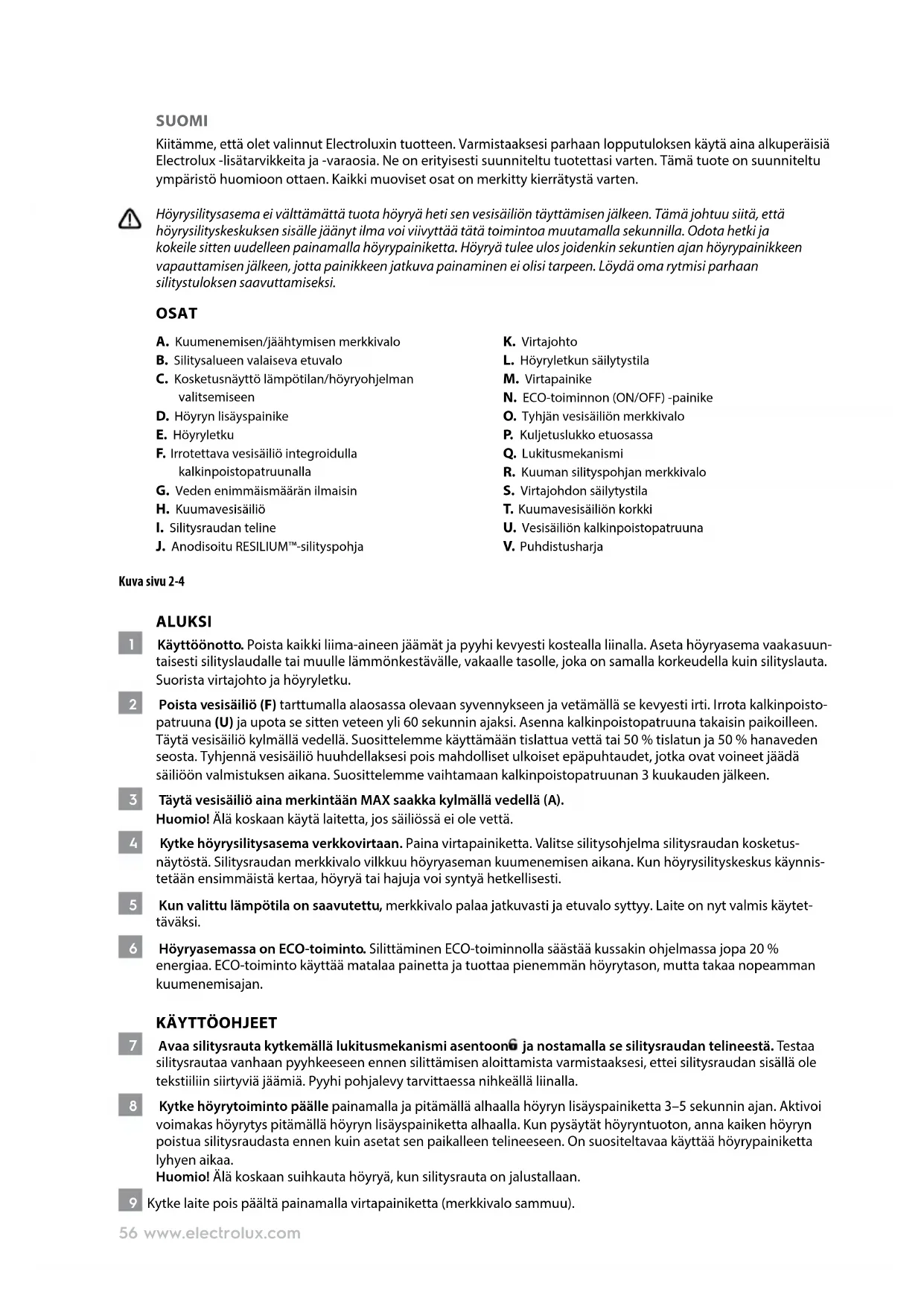 56 www.electrolux.com SUOMI Kiitämme, että olet valinnut Electroluxin tuotteen. Varmistaaksesi parhaan lopputuloksen käytä aina alkuperäisiä Electrolux -lisätarvikkeita ja -varaosia. Ne on erityisesti suunniteltu tuotettasi varten. Tämä tuote on suunniteltu ympäristö huomioon ottaen. Kaikki muoviset osat on merkitty kierrätystä varten. Höyrysilitysasema ei välttämättä tuota höyryä heti sen vesisäiliön täyttämisen jälkeen. Tämä johtuu siitä, että höyrysilityskeskuksen sisälle jäänyt ilma voi viivyttää tätä toimintoa muutamalla sekunnilla. Odota hetkija kokeile sitten uudelleen painamalla höyrypainiketta. Höyryä tulee ulos joidenkin sekuntien ajan höyrypainikkeen vapauttamisen jälkeen, jotta painikkeen jatkuva painaminen ei olisi tarpeen. Löydä oma rytmisi parhaan silitystuloksen saavuttamiseksi. OSAT A. Kuumenemisen/jäähtymisen merkkivalo B. Silitysalueen valaiseva etuvalo C. Kosketusnäyttö lämpötilan/höyryohjelman valitsemiseen D. Höyryn lisäyspainike E. Höyryletku F. Irrotettava vesisäiliö integroidulla kalkinpoistopatruunalla G. Veden enimmäismäärän ilmaisin H. Kuumavesisäiliö