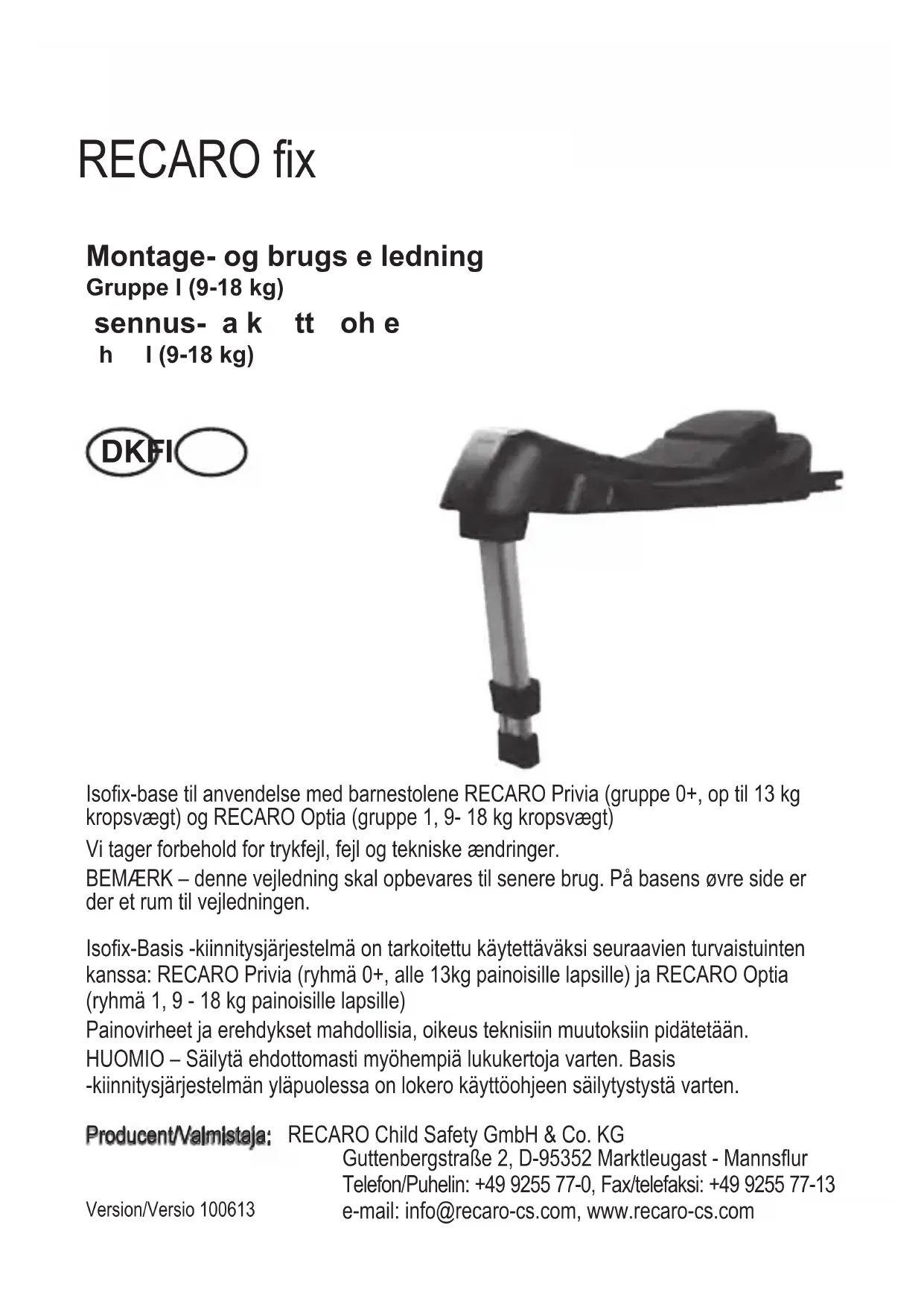 Montage- og brugsv ej ledning Gruppe I (9-18 kg) Isox-base til anvendelse med barnestolene RECARO Privia (gruppe 0+, op til 13 kg kropsvgt) og RECARO Optia (gruppe 1, 9- 18 kg kropsvgt) Vi tager forbehold for trykfejl, fejl og tekniske ndringer. BEMRK – denne vejledning skal opbevares til senere brug. P basens vre side er der et rum til vejledningen. Version/Versio 100613 Producent/Valmistaja: RECARO Child Safety GmbH & Co. KG Guttenbergstraße 2, D-95352 Marktleugast - Mannsur Telefon/Puhelin: +49 9255 77-0, Fax/telefaksi: +49 9255 77-13 e-mail: info@recaro-cs.com, www.recaro-cs.com A sennus- j a kä y ttö ohj e R y hm ä I (9-18 kg) Isox-Basis -kiinnitysjärjestelmä on tarkoitettu käytettäväksi seuraavien turvaistuinten kanssa: RECARO Privia (ryhmä 0+, alle 13kg painoisille lapsille) ja RECARO Optia (ryhmä 1, 9 - 18 kg painoisille lapsille) Painovirheet ja erehdykset mahdollisia, oikeus teknisiin muutoksiin pidätetään. HUOMIO – Säilytä ehdottomasti myöhempiä lukukertoja varten. Basis -kiinnitysjärjestelmän yläpuolessa on lokero käyttöohjeen säilytystystä varten. RECARO fix50